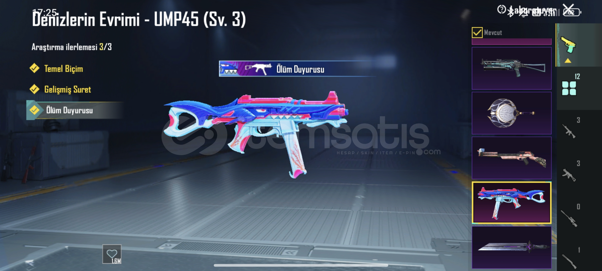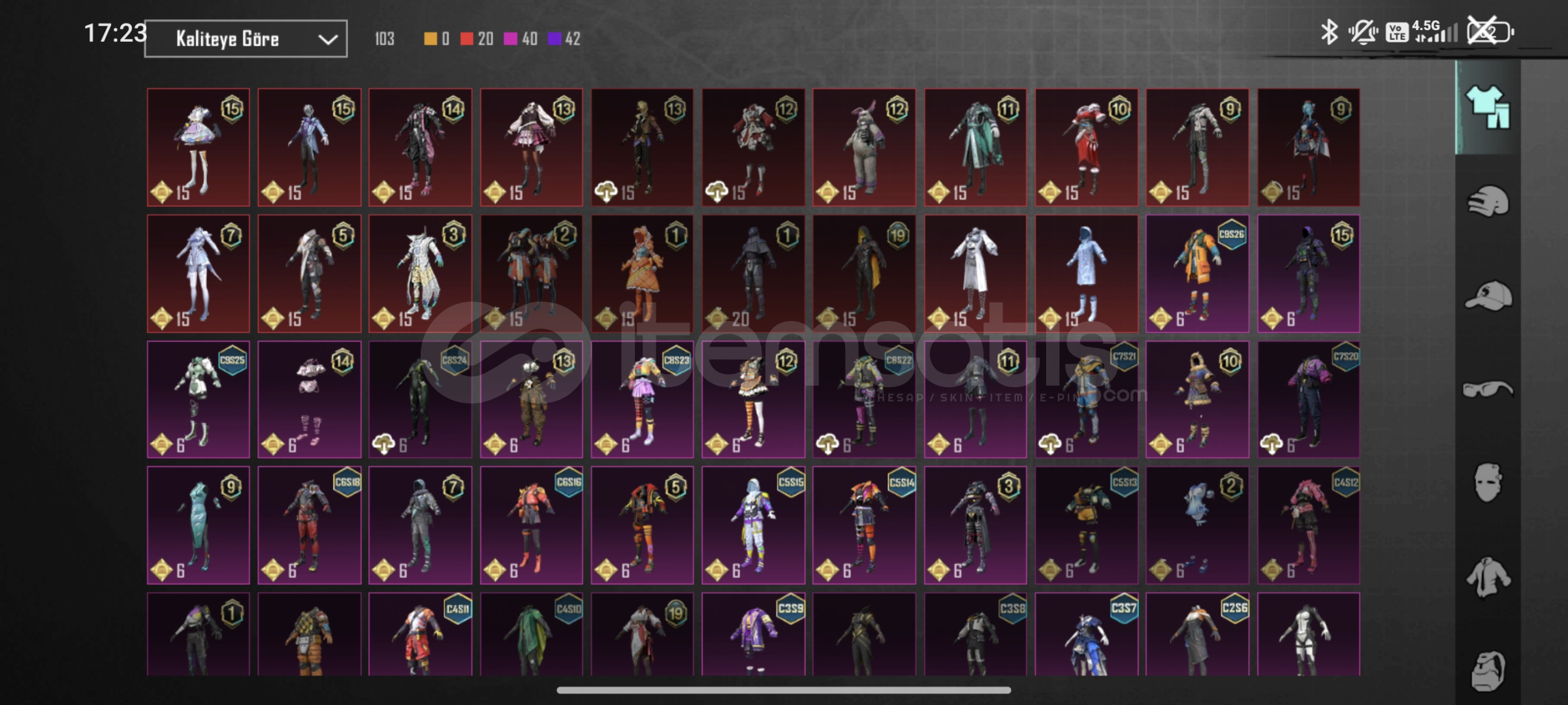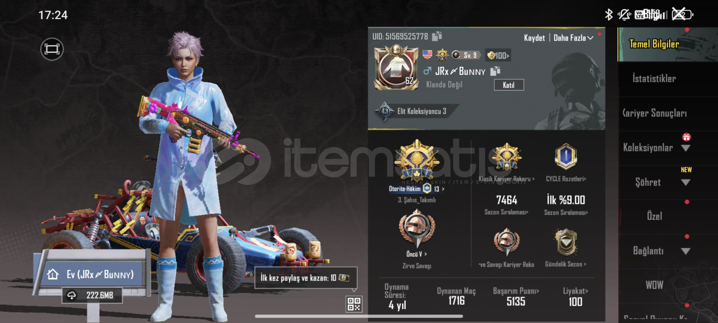 hesapta 12 yükseltilebilir silah vardır.scar-L,ump ve uzi fulldür.hesabın içinde 226 uc vardır 3 destansı amblem vardır koleksiyon seviyesi 43, 5 materyal vardır RP açık ve 100 dür.hesabın rankı as atoritesidir ve 32 destansı vardır.gmailiniz ve telefon numaranız bağlanır.