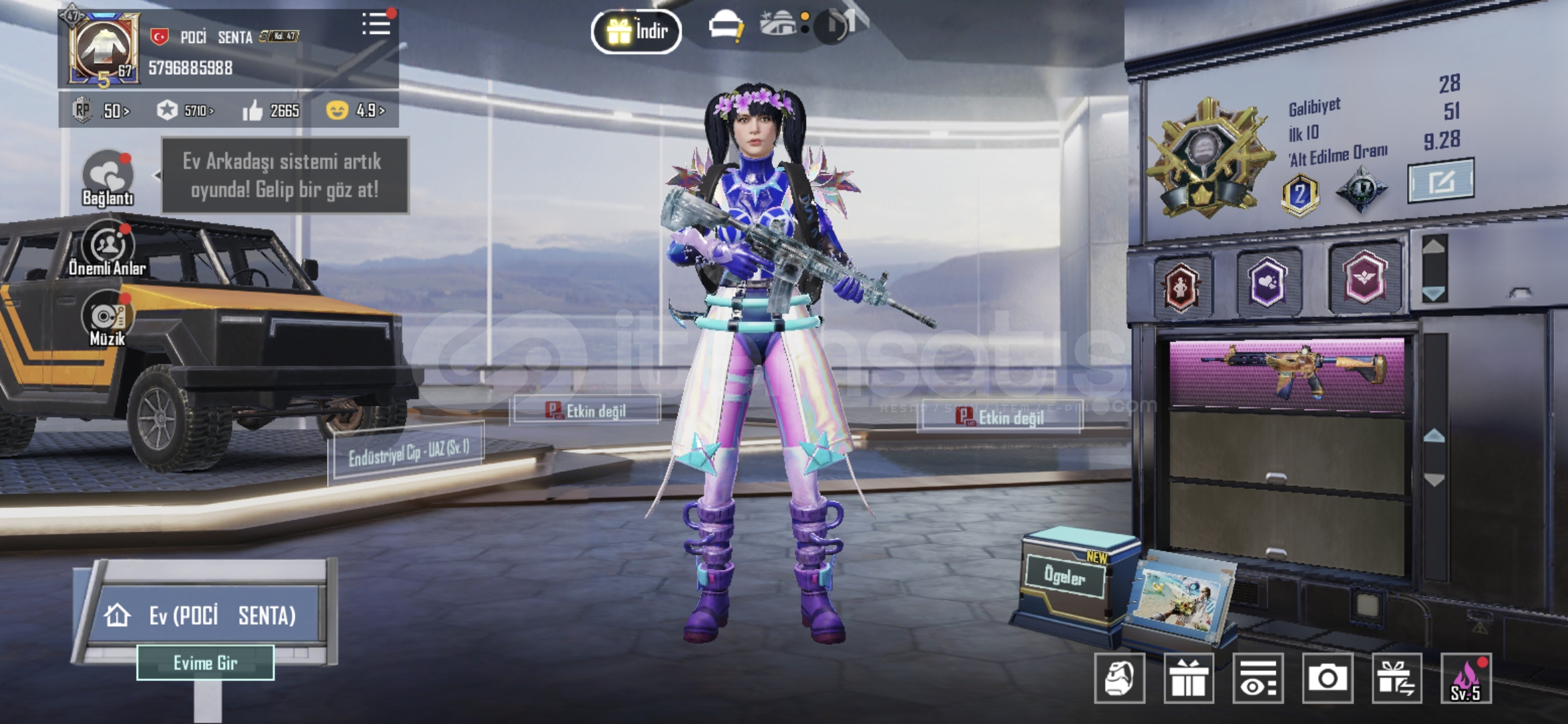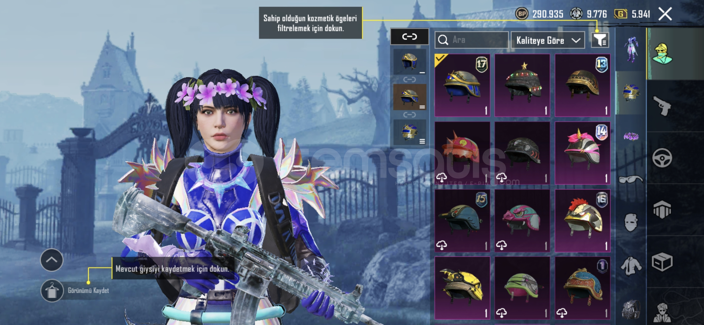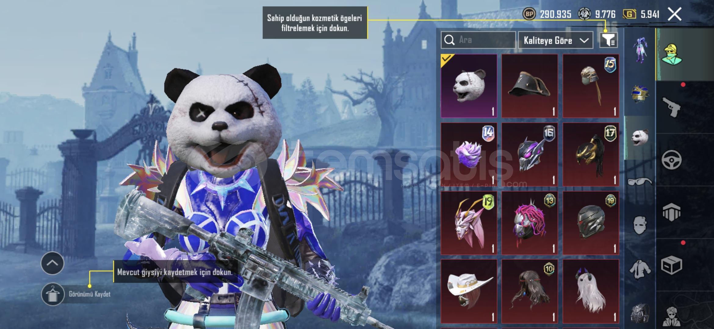 5 yıllık hesap 36 tane destansı var uaz desenlerim var silah desenleri paraşut kask çanta panda kafası s5 saç var bir çok daha şeyler var.