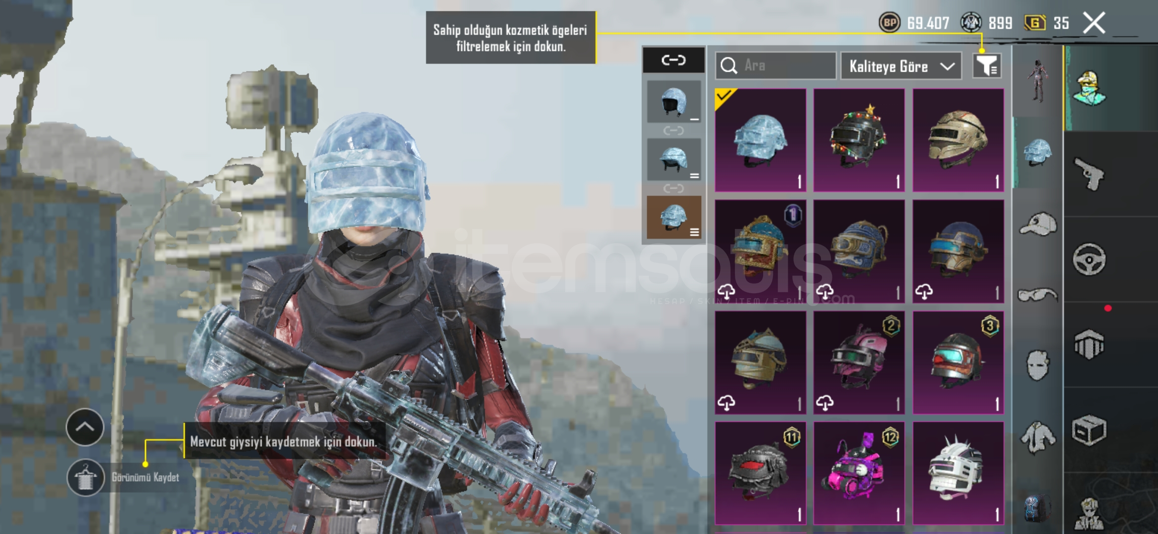 Buz M4 ölüm mesajlı ump vs yukseltilebilir silahlar mevcuttur pet/yoldaş vardır 18 destansı bol RP açılmıştır hesapda 200 üç ve RP de açıktır id değiştirme kartı mevcuttur bol kask ve bol çanta desenide var pazarlık sünnettir pazarlığa açığım