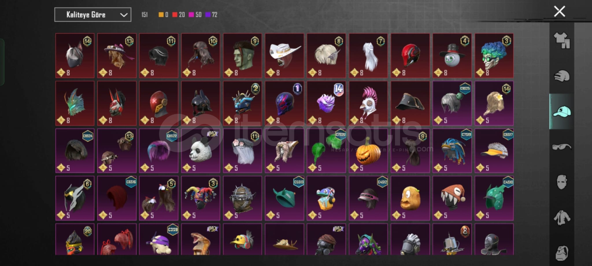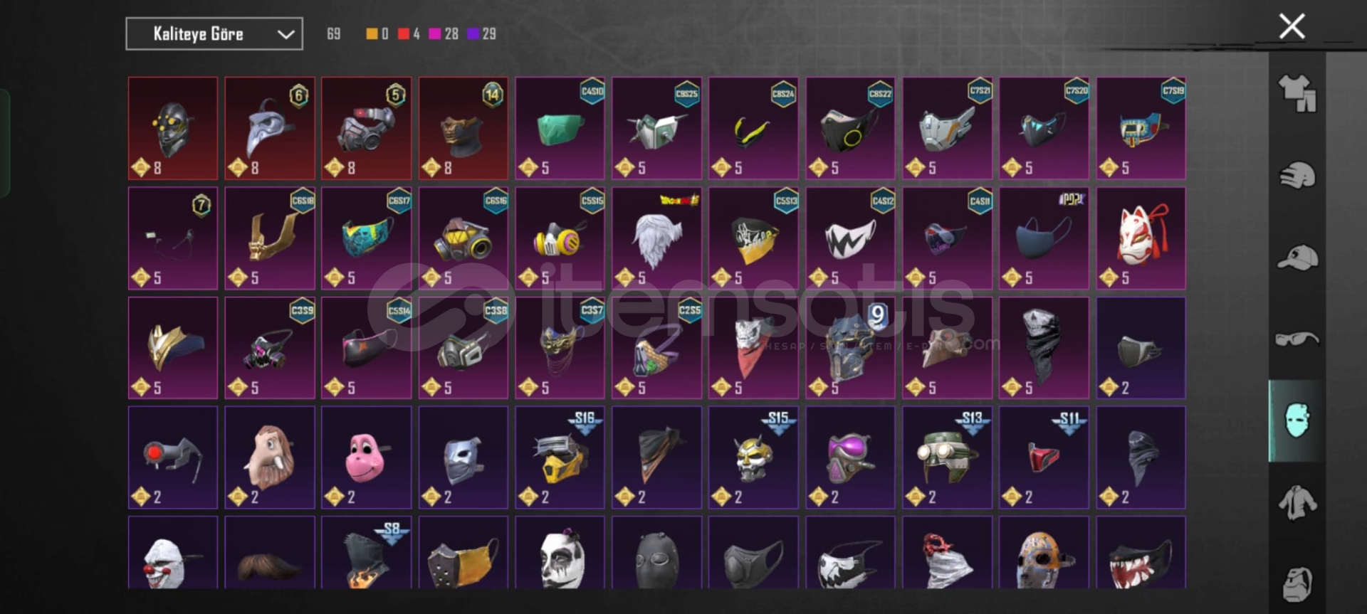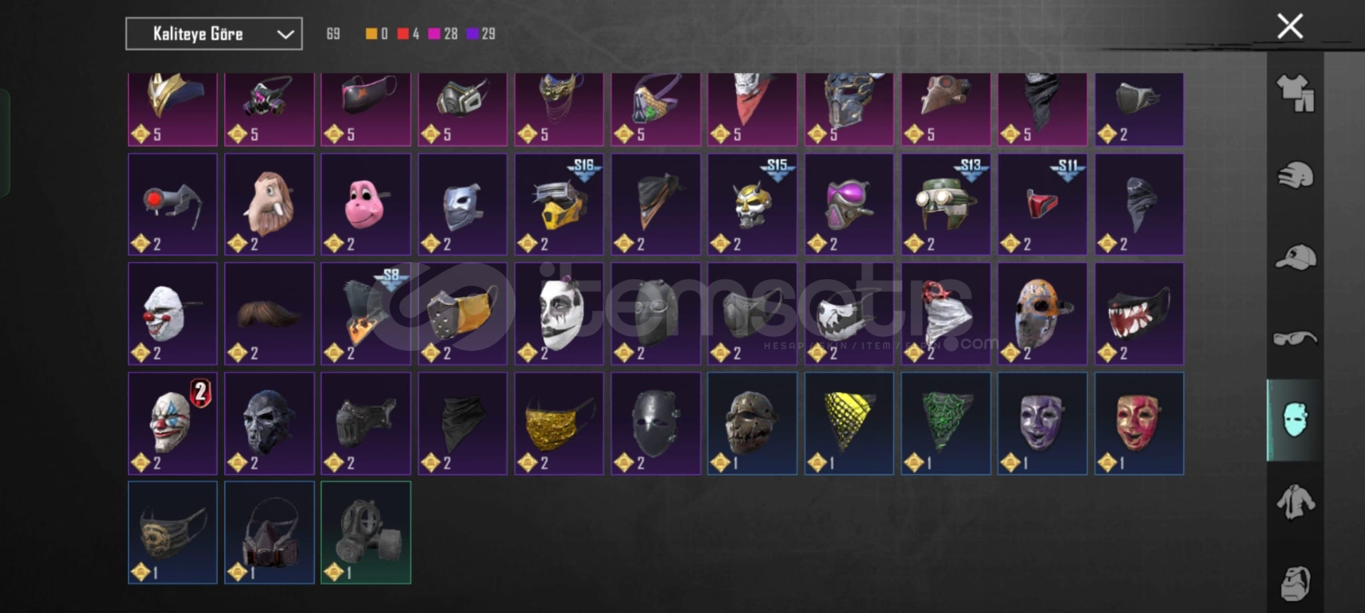 Maske Koleksiyonu: 69 farklı maske, özellikle kırmızı arka planlı (Efsanevi) nadir maskeler ve çok sayıda Destansı maske mevcuttur. (Fotoğraflarda görülen tüm maskeler)