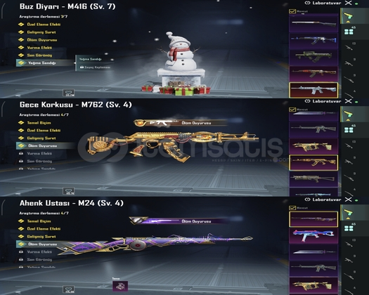 - ÖLÜM MESAJLI SİLAHLAR -Buz Diyarı M416 (max)Yedi Denizler AKM (4sv)Platin Törpü UMP45 (4sv)Mor İntikam AWM (4sv)Gecenin Şarkısı GROZA (4sv)Haset Dikeni SCAR-L (4sv)Gece Korkusu M762 (4sv)Ahenk Ustası M24 (4sv)Serinletici UZİ (4sv)Yakut Fırtına AMR (4sv)Altın Pençe P90 (4sv)Denizlerin Evrimi UMP45 (maxx)Lider Panter DBS (maxx)Zarif Leylak Thompson (maxx)Şirin Kedi Kar98K (maxx)Gece Gladyatörü PP-19 ...