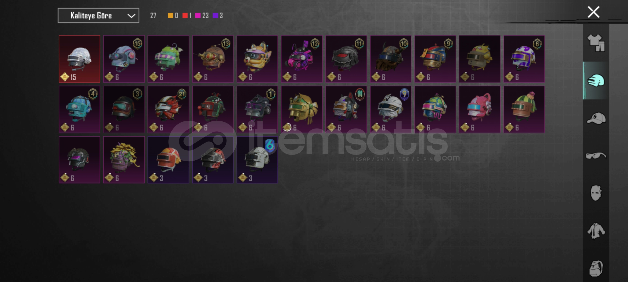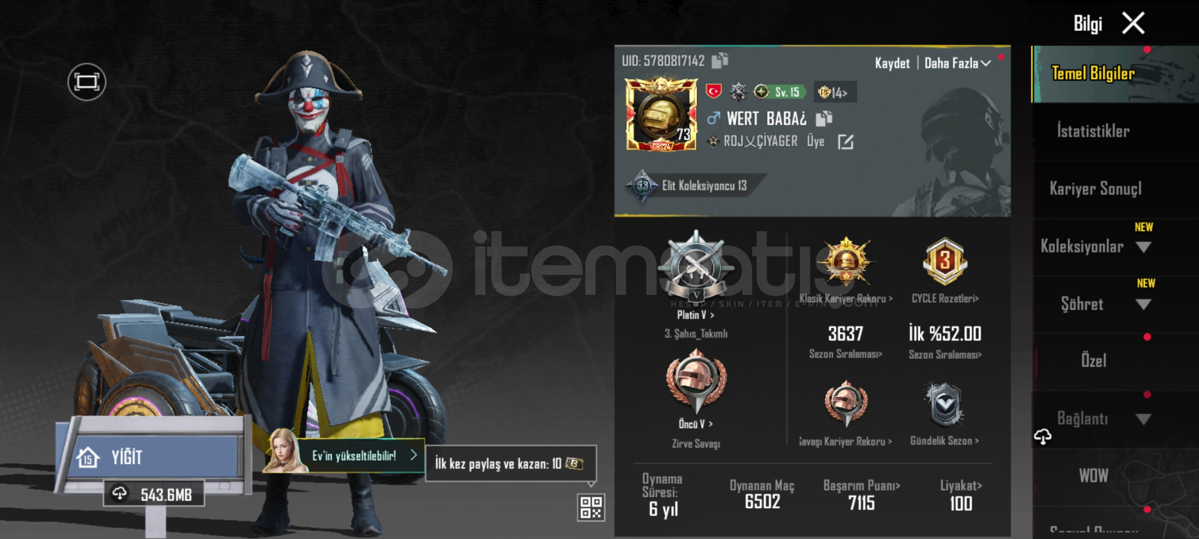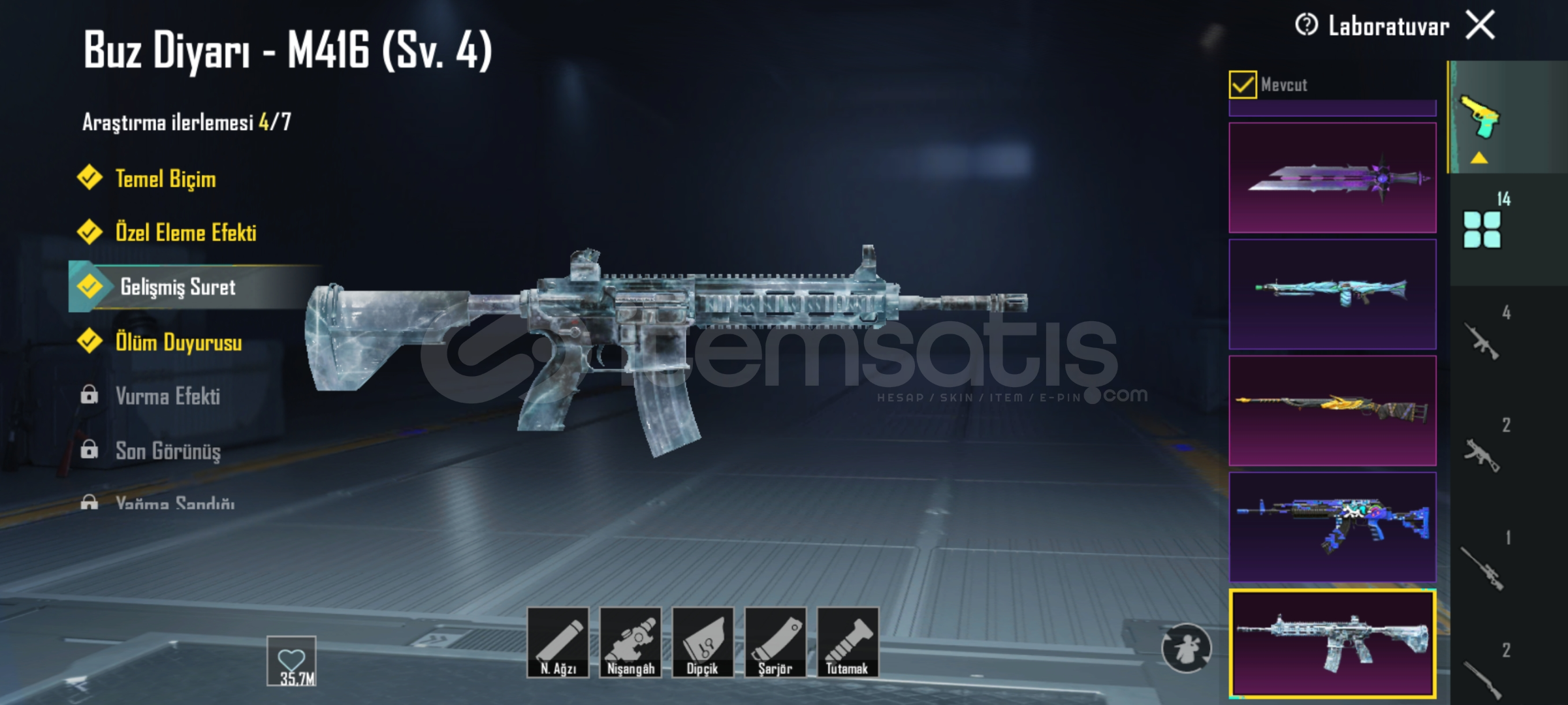 Merhabalar buz sv 4 em762 sv 4 mg sv 3 em24 sv 1 pala sv 3 arbalet SV 2 DBS sv 2 tamsın sv 2 uzi sv 1 hançer sv 1 em16 sv 2 mk47 sv 2 ns2000 sv1 mp7 sv1 toplam 14 silah 58 destansı 3sezon Fatih+ 360 uc 3adet maytikfors seti detayları için yazabilirsiniz