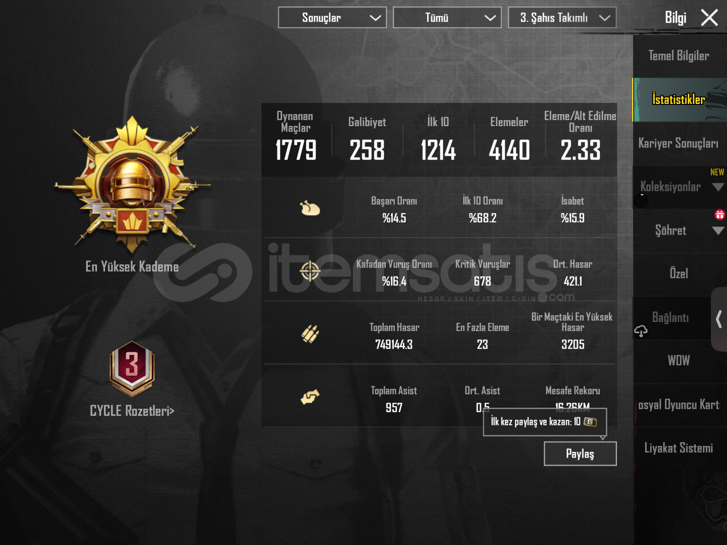 Seviye 58, Başarım 4120. Fatihli, dolu ve güvenli bir hesaptır. Alıcısına hayırlı olsun.