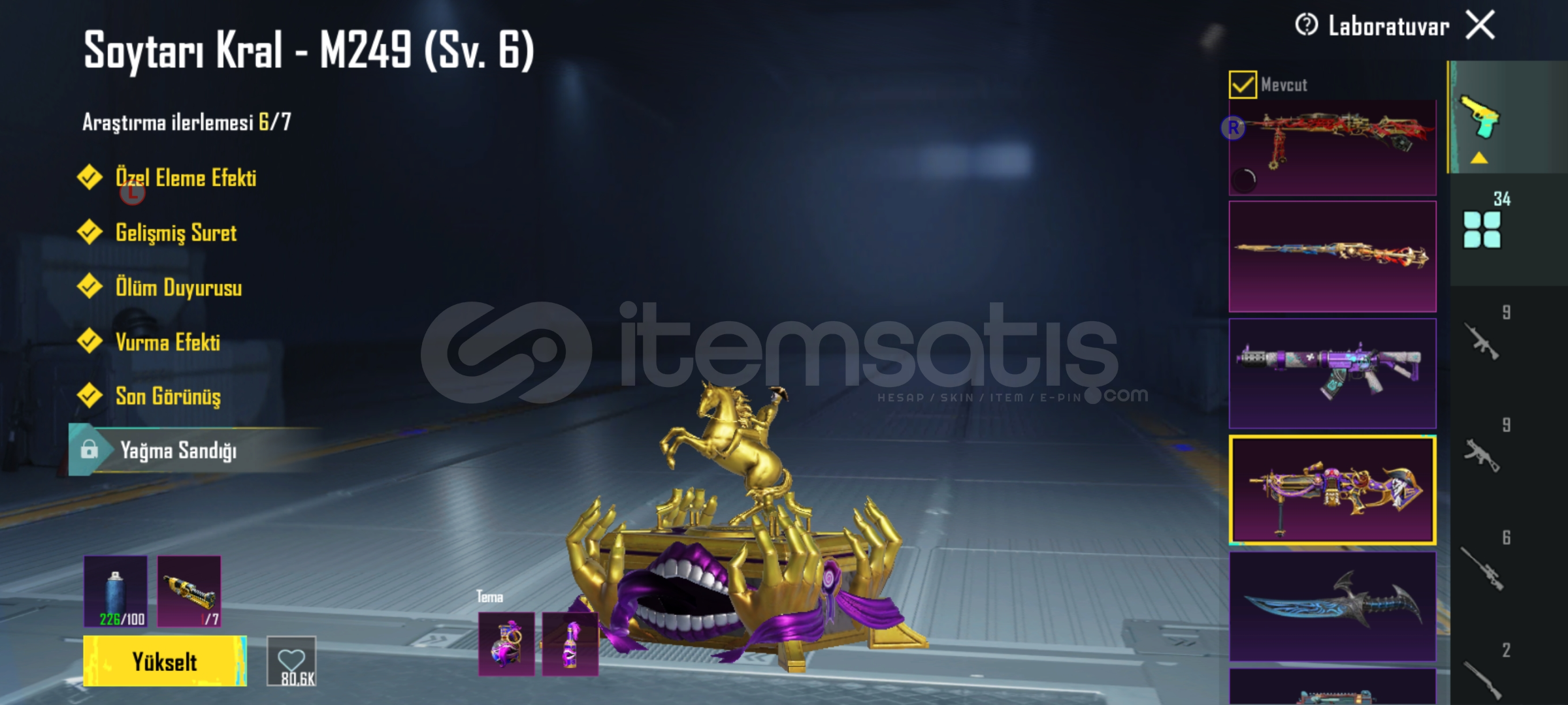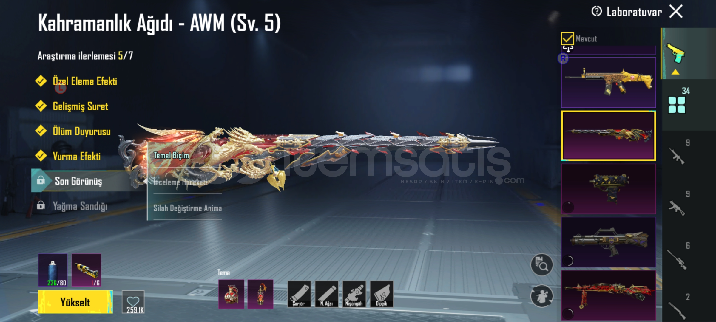 - 28 Adet yükseltilebilir silah Maskara M4 7Sv , Soytarı M249 6 SV, kahramanlığın ağıdı AWM 4 , Firavun M24 3 SV , Hiclik tetiği M24 3 SV , Kan paraziti DP 3 SV , AŞK M762 3 SV , Yüksek SES scar 2 Sv + Yıl dönümü ump ve daha niceleri