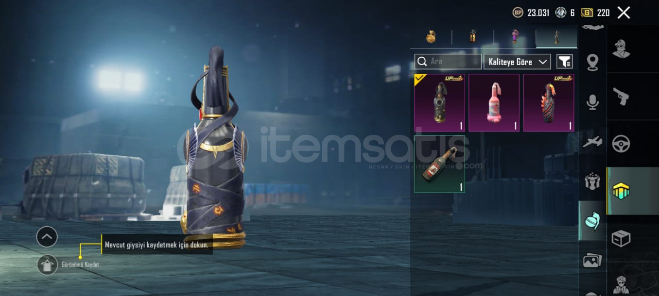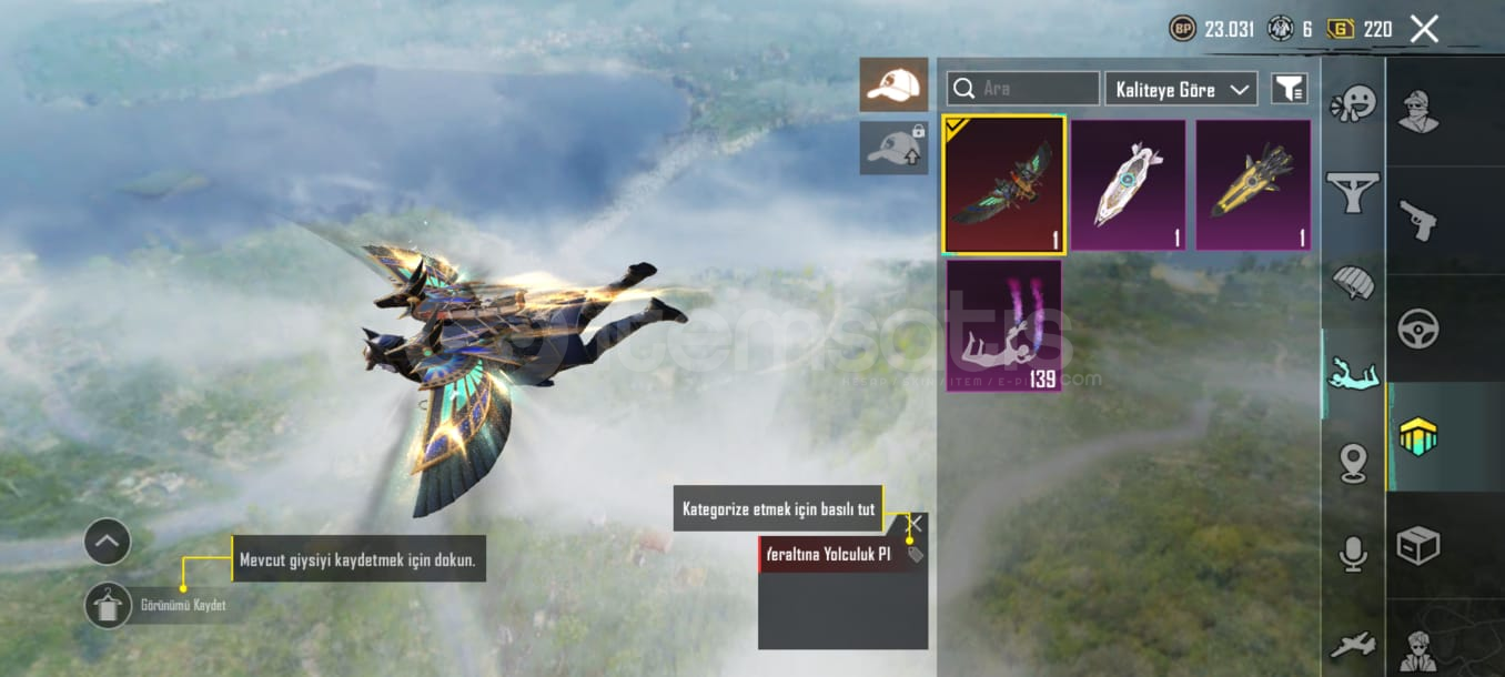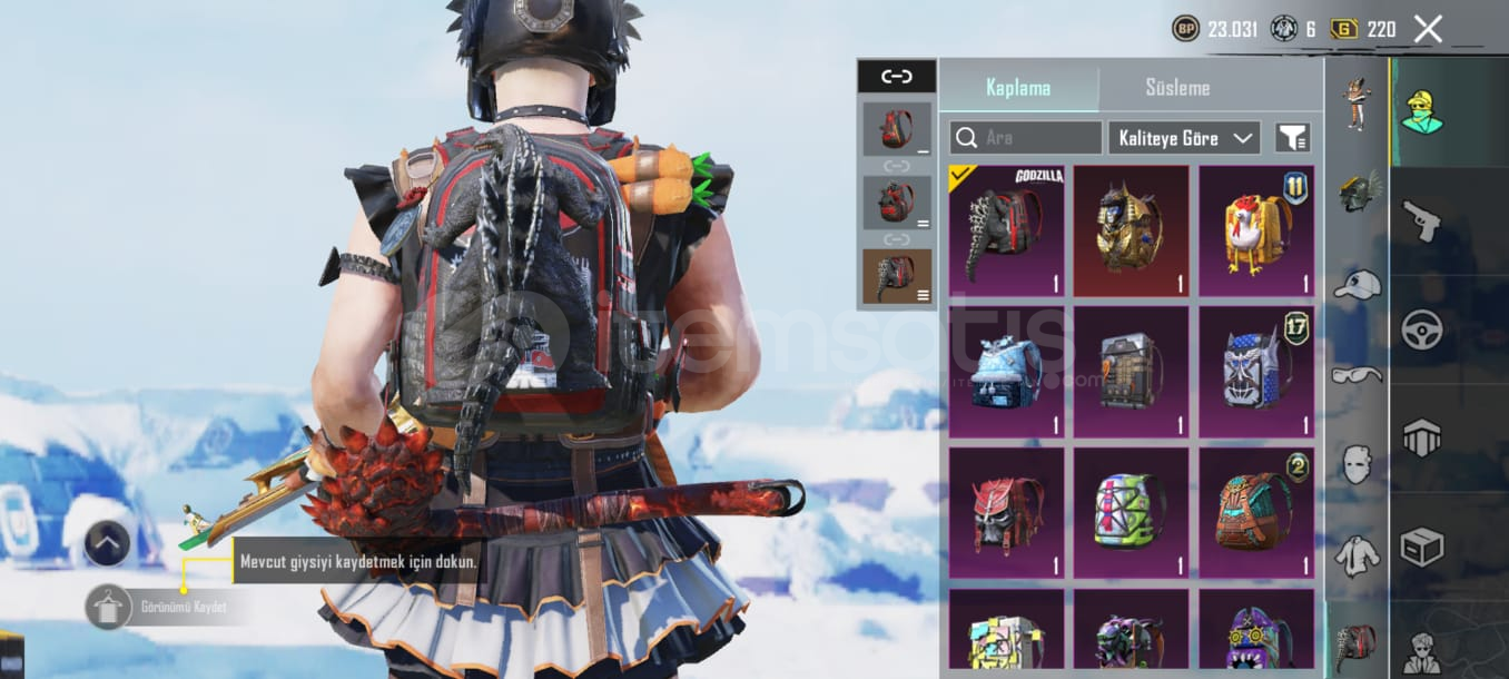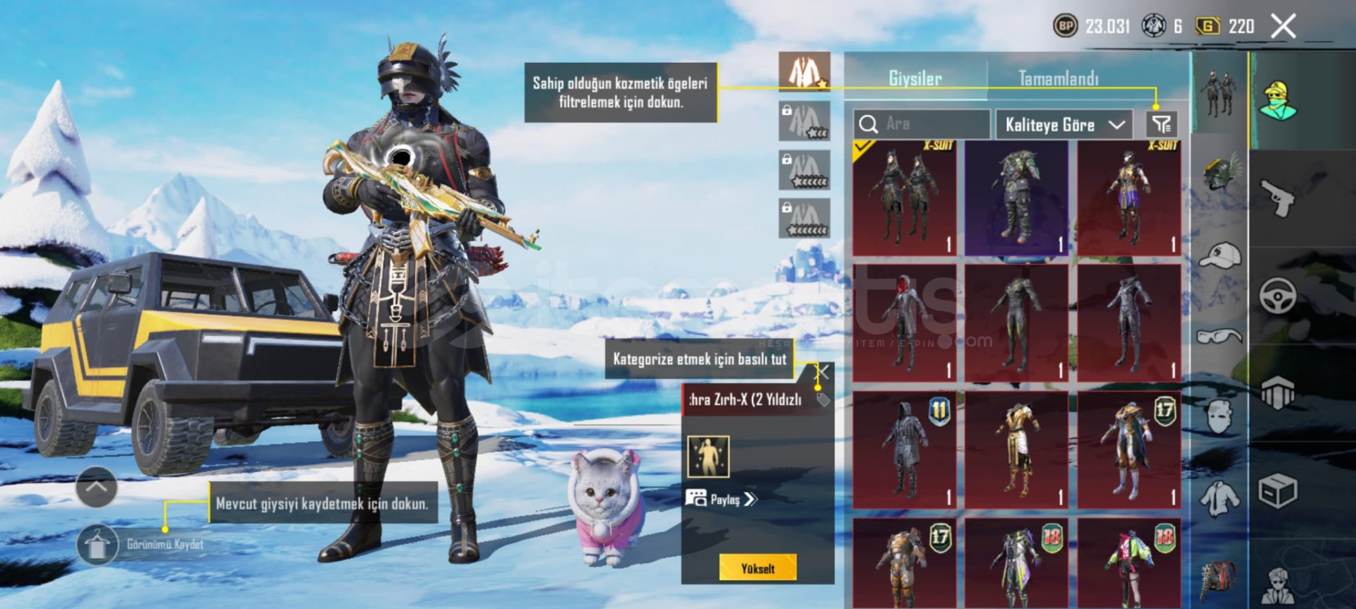 2xsuit set27 destansı set34 kask58 mor set13 destansı hareket1 mor hareket15 tane yükseltilebilir silahFiravun ve Godzilla çantasıYükseltilebilir araba1 tane destansı paraşütYükseltilebilir molotof ve bomba