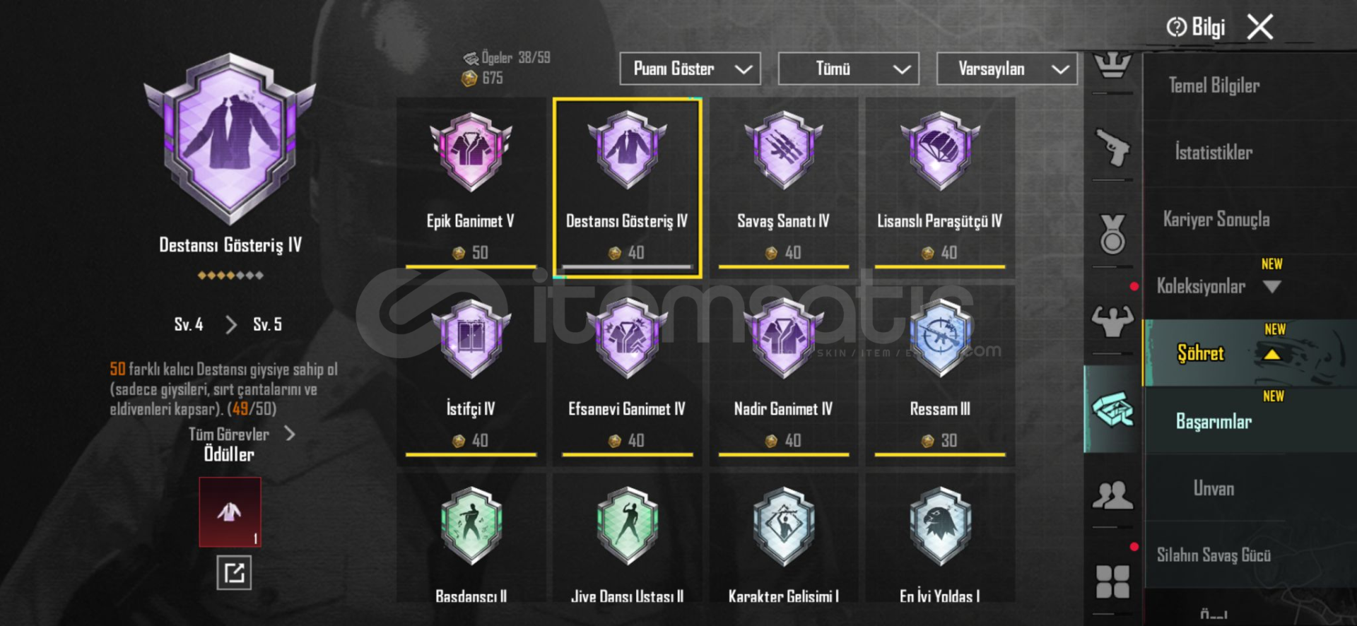 49 destansı 16 yükseltilebilir silah 10 sezon rp açılmıs hepsi full 1 isi 99
