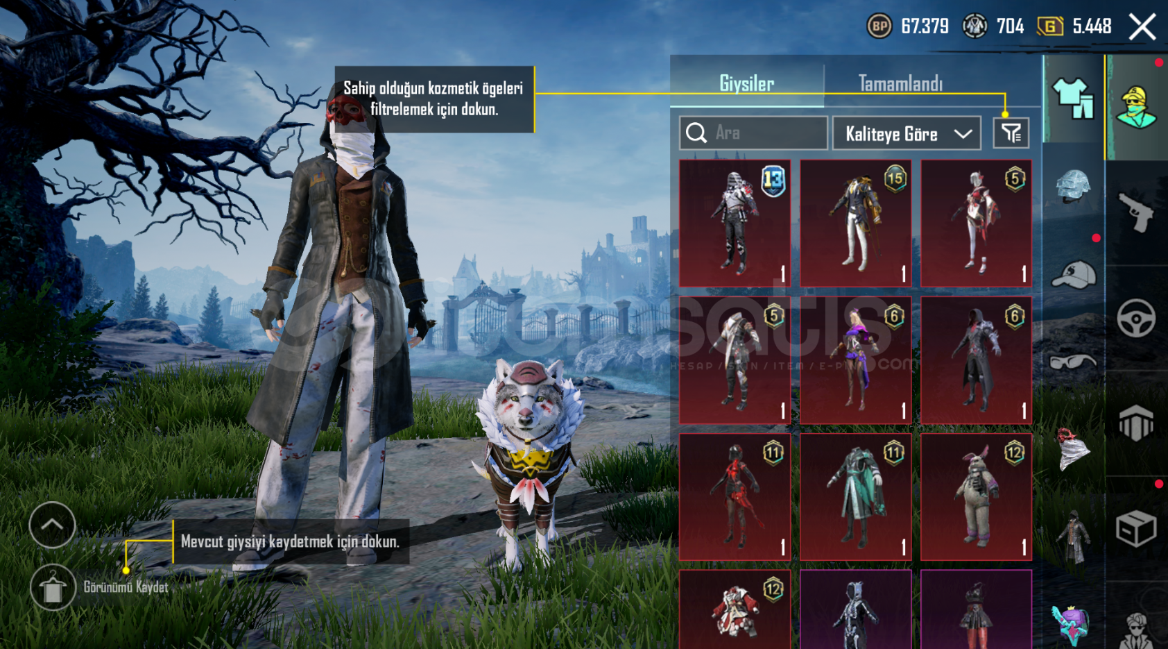 Hesapta 16 destansı kıyafet bulunmaktadırHesaptaki bağlar sadece alt epostadır.Hesaptaki geliştirilebilir silahların hepsi 2svdir Hesaptaki geliştirilebilir silahlarM7 MidillicYıldızlı Galaksi mk14Zarif Leylak ThompsonDikenli Şafak M16Yamalı Tavşan Mk47Hesapta Kurt Bulunmaktadır.Dm den soru sorabilirsiniz iyi günler.