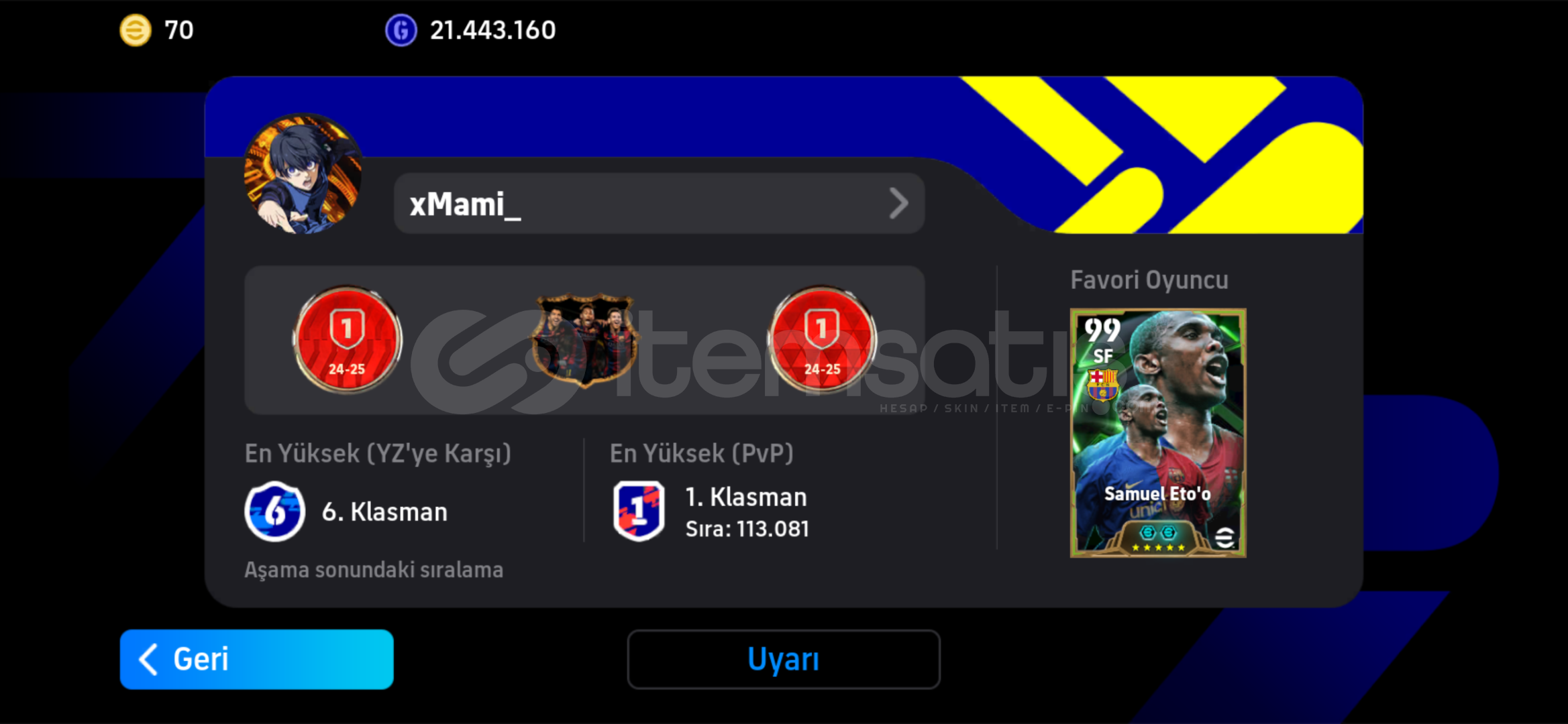 öncelikle alıcısına hayırlı olsun hesabımın bağı tertemiz olup tek bağ dıröğrenci olduğum için satıyorum hesap çok şanslıdır çoğu oyuncuyu tek de çıkardım pele ve cruyf ilk onluda çıktı mbabpe ve sane de tek onluda çıktı çoğu bu şekil çıktı
