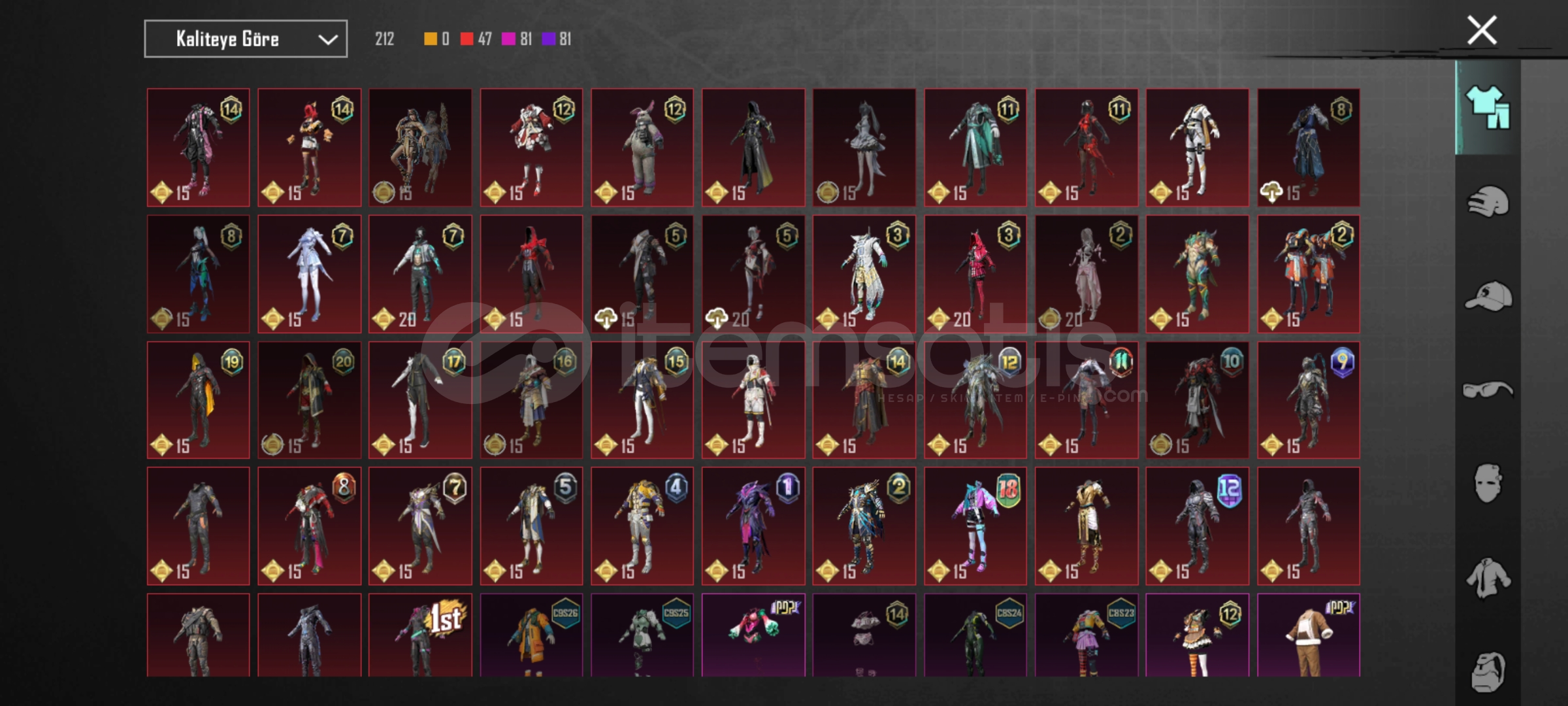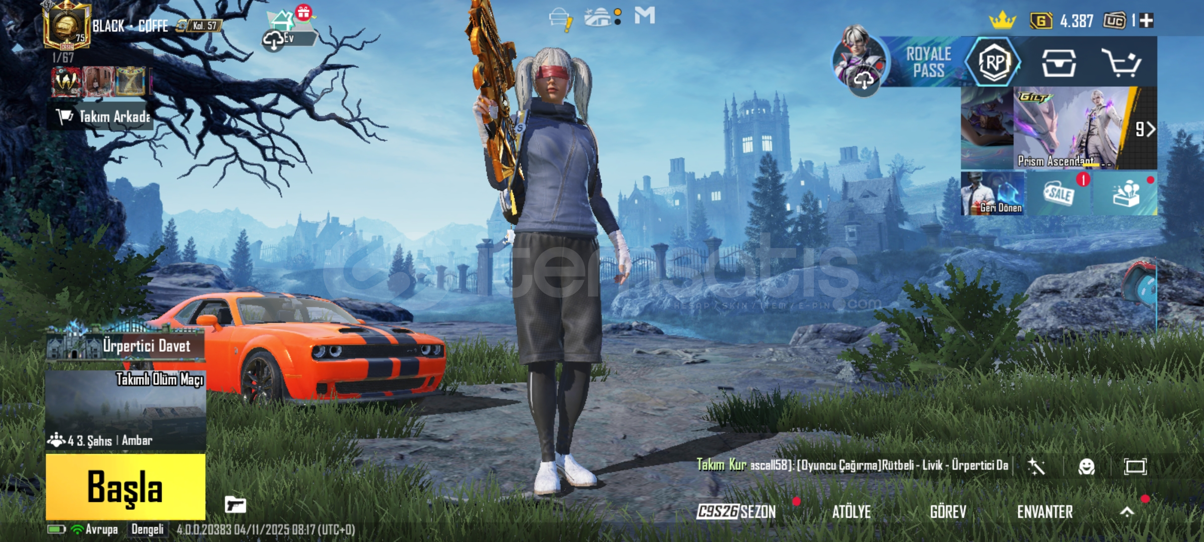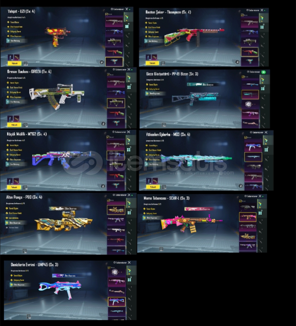 75 destansı kıyafet 2 sezon Fatih çerçevesi 20 adet yükseltilebilir silahMidilli - M762(4sv)Vahşet - Uzi (4sv)Baston şeker - Thamson(4sv)Orman baskını - Groza(4sv)Yükselen Ejderha - MG3(4sv)Altın pençe - P90(4sv)3 adette ölüm duyurulu RoyalPass silahı(scar-l , bizon , ump)1 adet Dodge araba deseni ve çeşitli araba desenleri