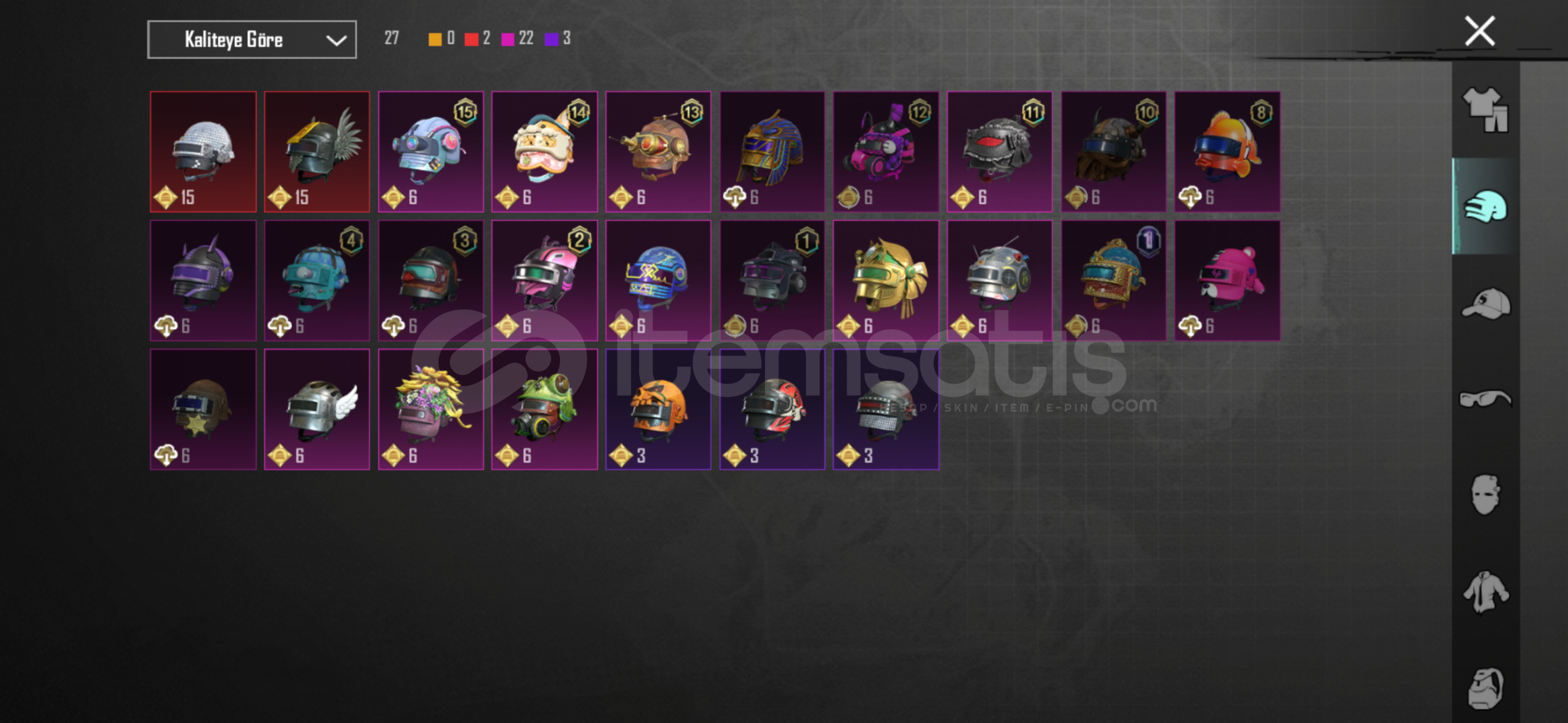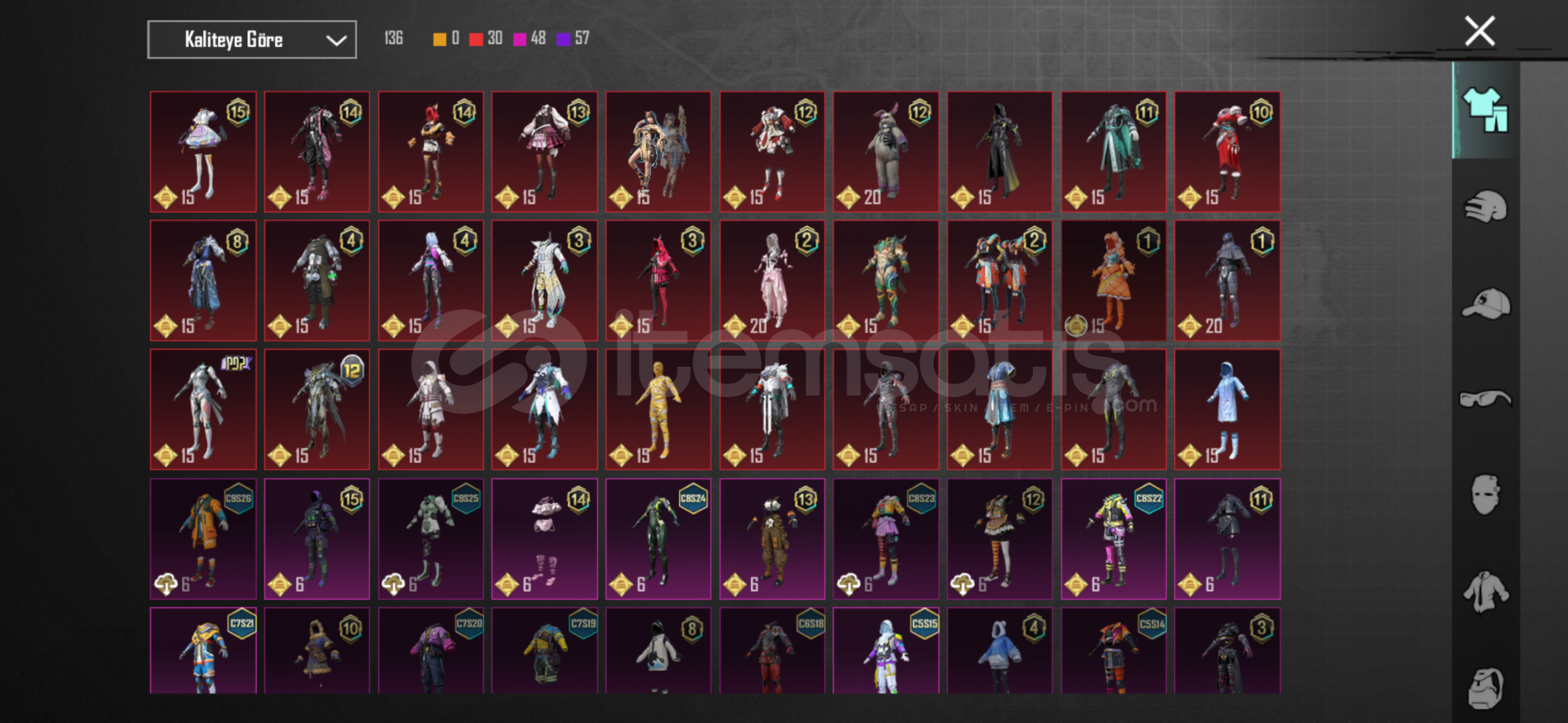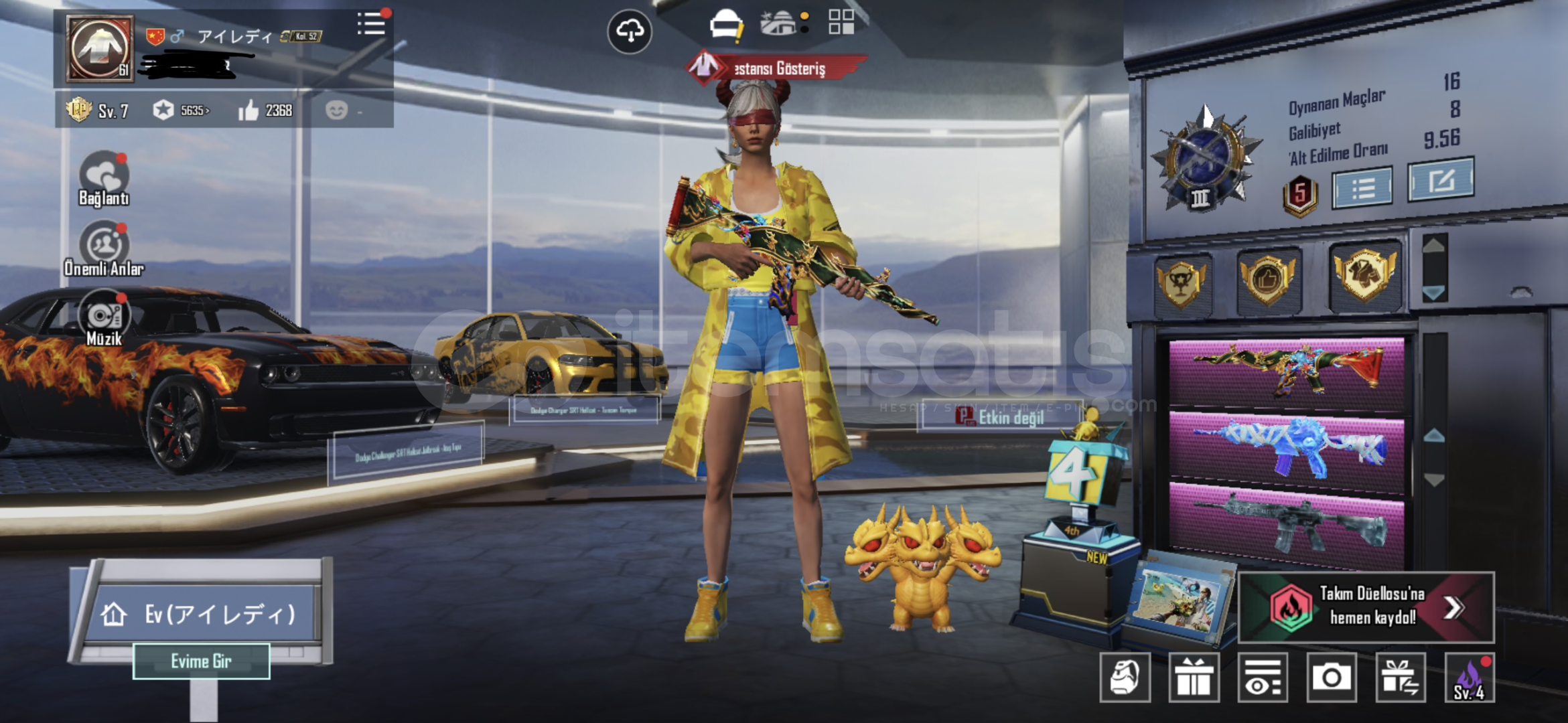 60 destansı 36 yükseltilebilir silah 2 dodge toros ve sedan ikili 36 - silahın 30 u 3 lvl silahlar da mainlikk 4x toros deseni 2x uaz crew üst komutan seti full ananas seti full Sarı mumya akülü zırh seti full s2 maske - s2 korucu seti Koyu altın seti full şeytan boynuzuPlayerunknow seti buz diyarı 3 mumya m4 - 3 kaplan m4 - 6 + 2 mataryel - rp açık 2 tane saç daha sayamadığım bir çok şey