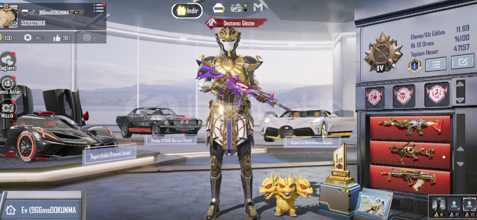 Öncelikle merhaba5k uc hesapta net vardır eğer erken satılırsa hediye olarak alan kişiye verilecek3x Glitch3x xsuit4 seviye firavunmaskara seti2x destansı bugatti2x Shelby1x lotusmaskara m4 6 svyakan kükreme m4 7 svRuhBicen ump 7 sv (bütün eklentiler açık )kumral krallığı akm 5 sv (vurma efekti açık)İskelet cellat m762 5 sv (vurma efekti açık)Alevli godzilla groza 4sv(ölüm duyurulu...
