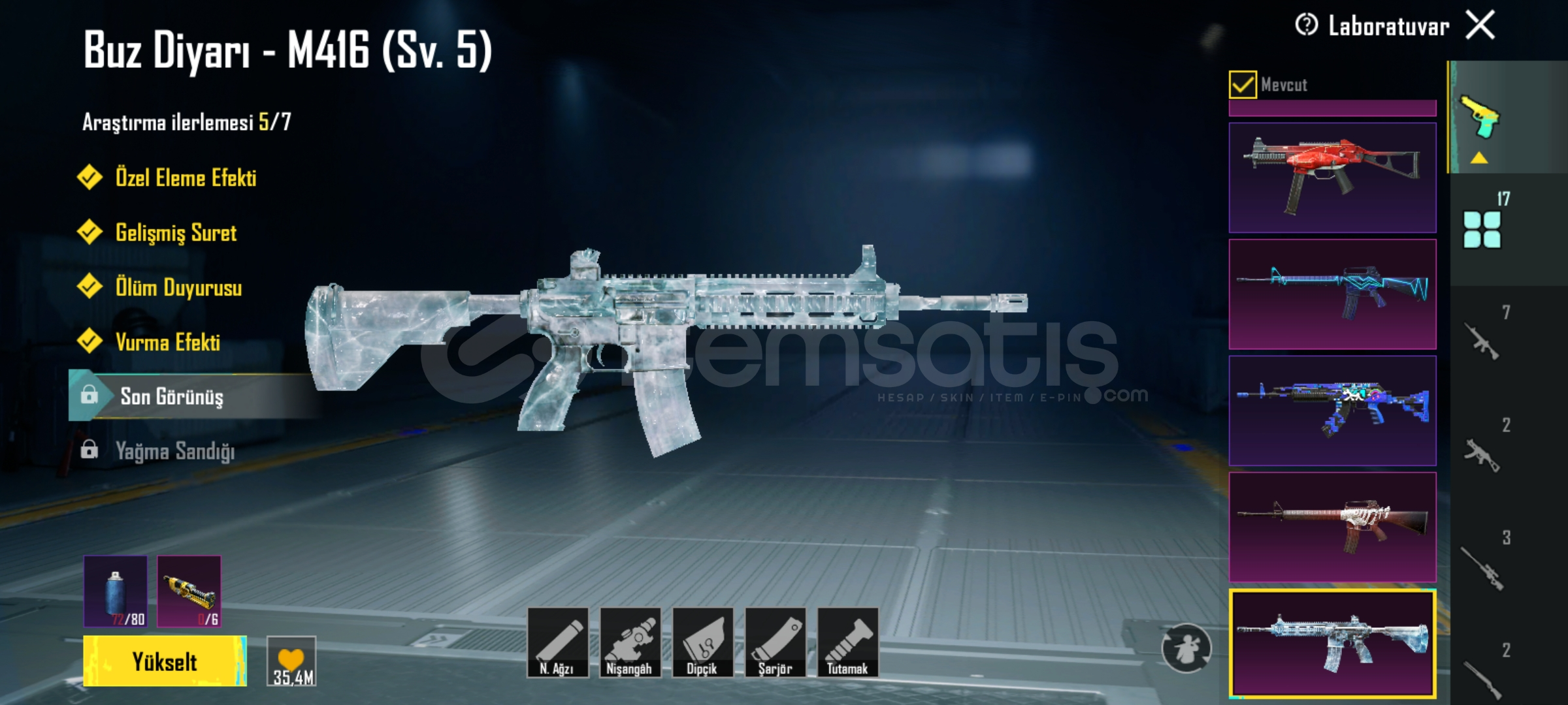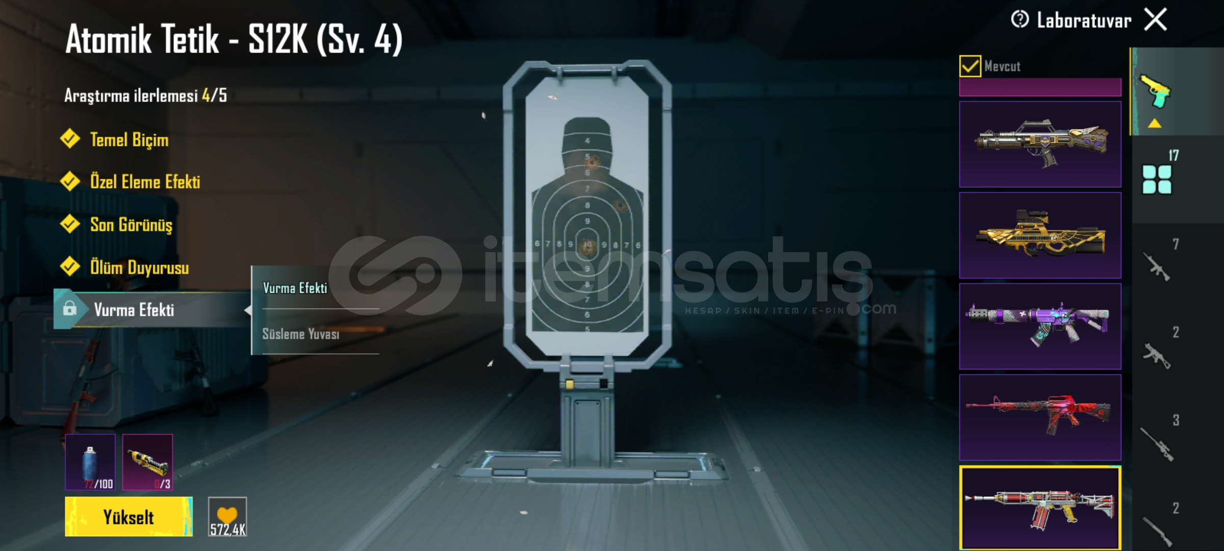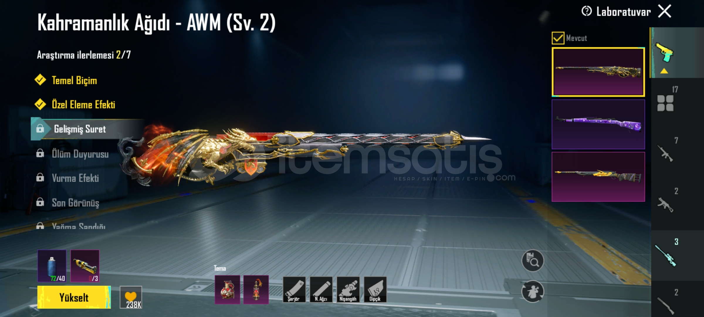 5 seviye Buz M416, 4 seviye Midilli M762, 4 seviye Atomik Tetik S12K, Full Mama Tabancası Scar-L, 2 seviye Kahramanlığın Ağıdı Awm patlama efektli bomba ve molotofu açık, 2 seviye UMP