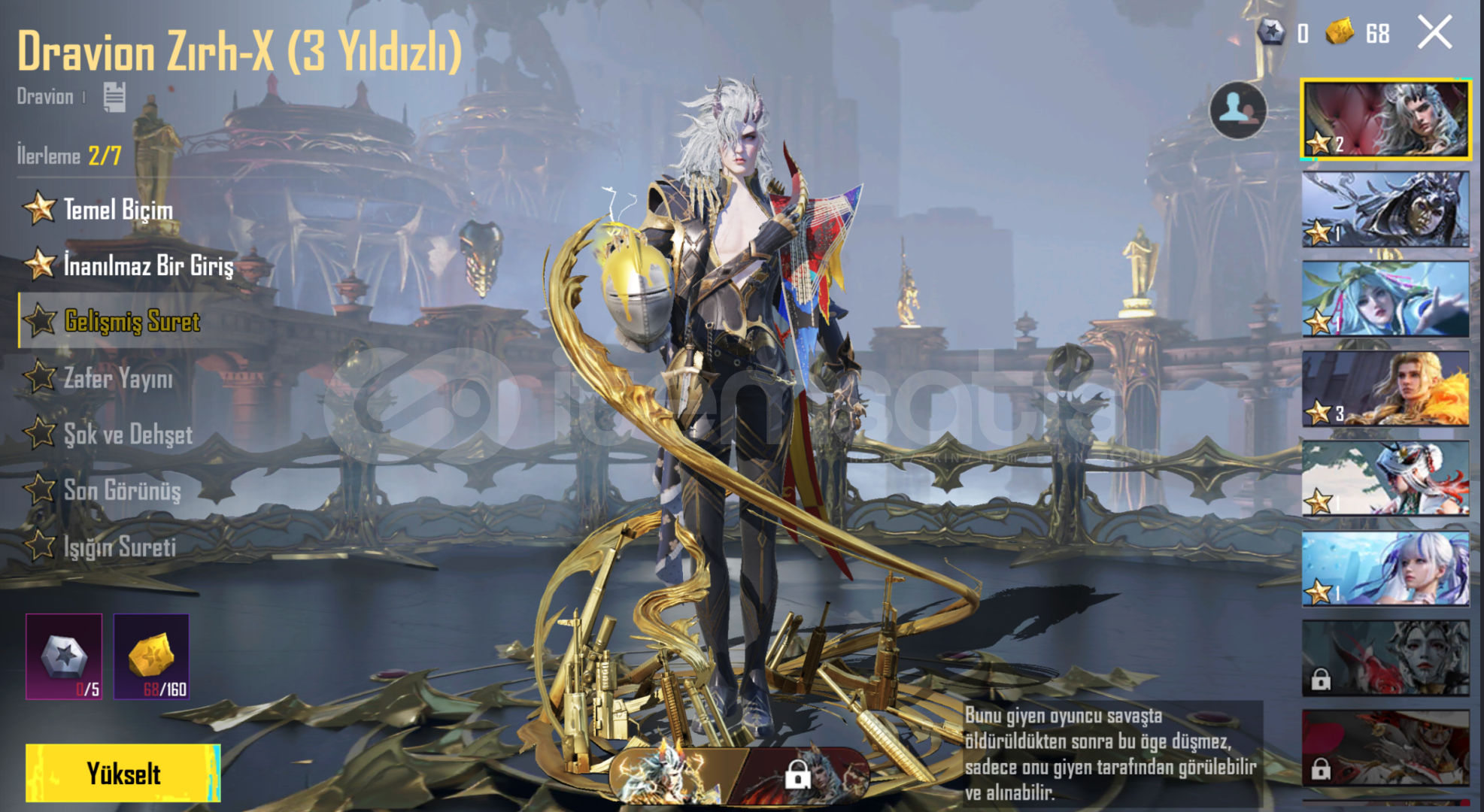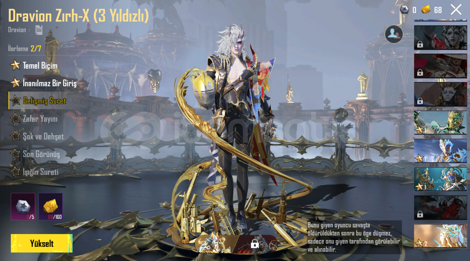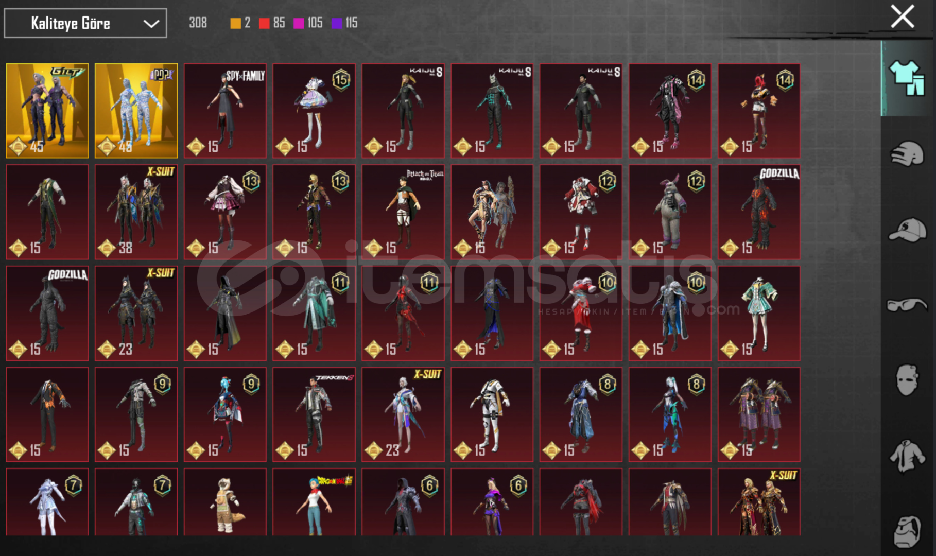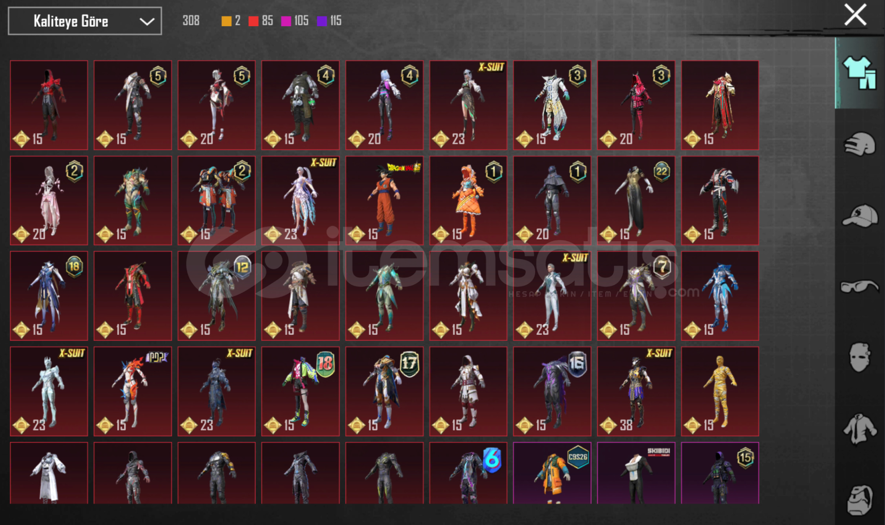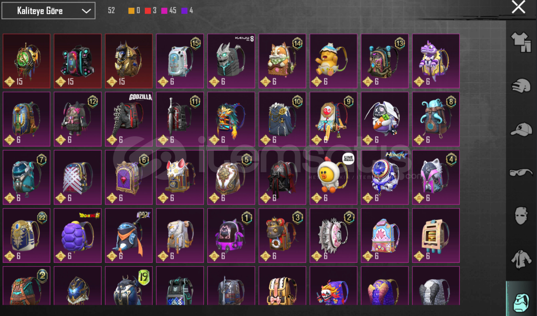58 tane yükseltilebilir silah, 10 tane x suit, 5 yoldaş, 1 Dacia Lamborjini, 1 Dacia Dodge, 1 couper Lamborjini, 1 couper mclaren, 1 couper dodge, 1 buggy Sonic,Kanatlı Canavar KAmyon,Kanatlı kask v.b firavun çanta, 131 Destansı, 100k popülerlik v.b dopdolu hesap yani detaya girince burası kabul etmiyor detay isteyen yazsın.