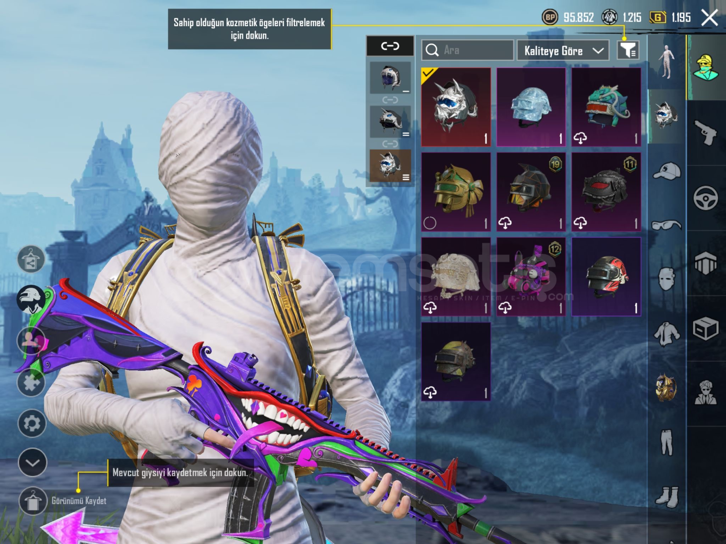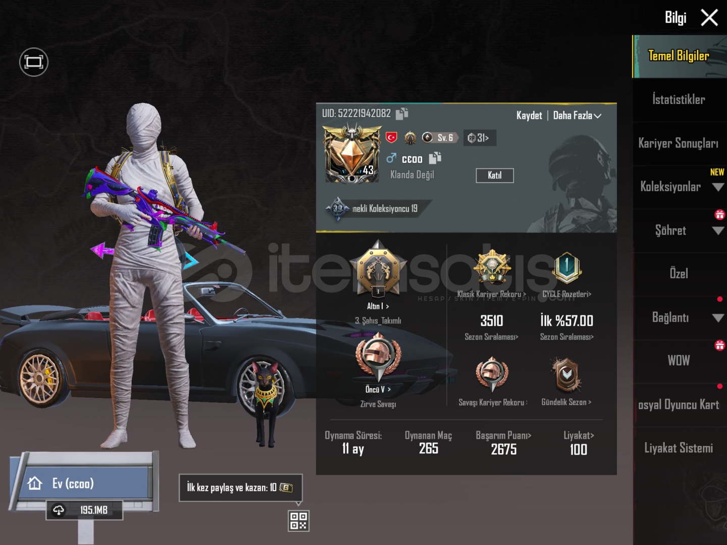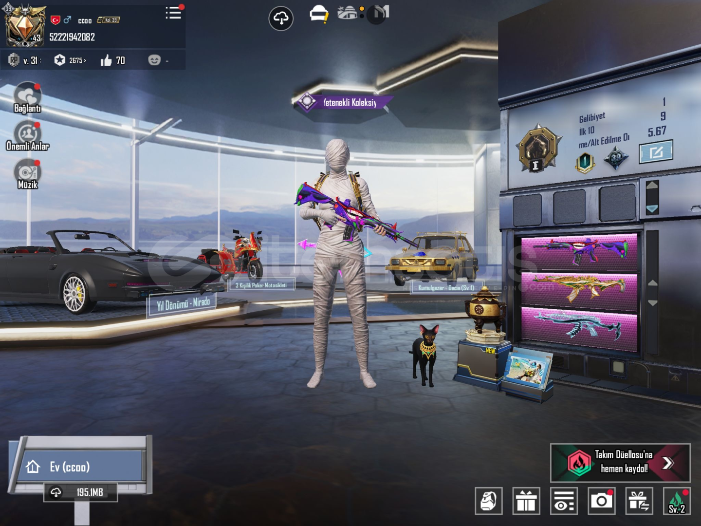 HESAP TEK BAĞDIR!!!Anukhra x suit 2 seviyefirevun x suit 1 seviyem416 maskara 6 seviyeKahramanlık ağıdı AWM 1 seviyeMumya+buz mumyagılt kostümfirevun çantaAkm m762 öldürme mesajı açıkpatlama desenli bomba ve daha fazlası