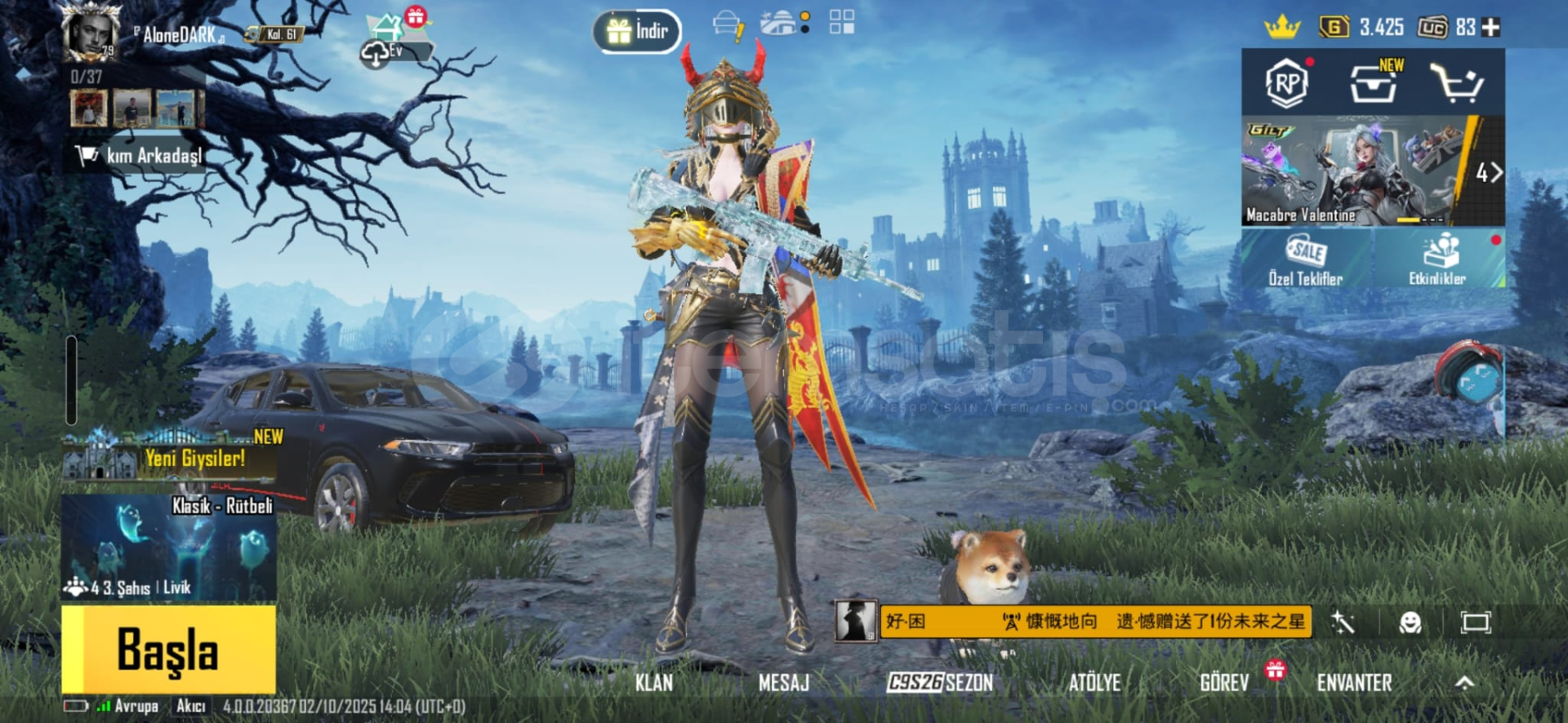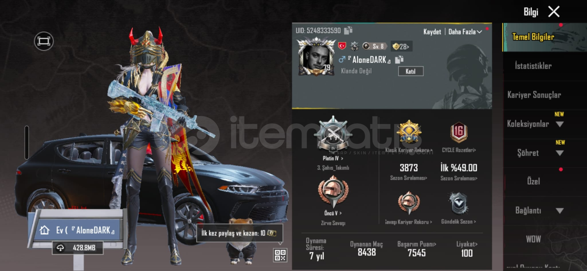 •Bu fiyata mükemmel hesap •Royal pass açık •Buz diyarı MAX •Suit 3 Lvl •Maskara seti full set var • Dodge Hornet Araba • 34 yükseltilebilir silah