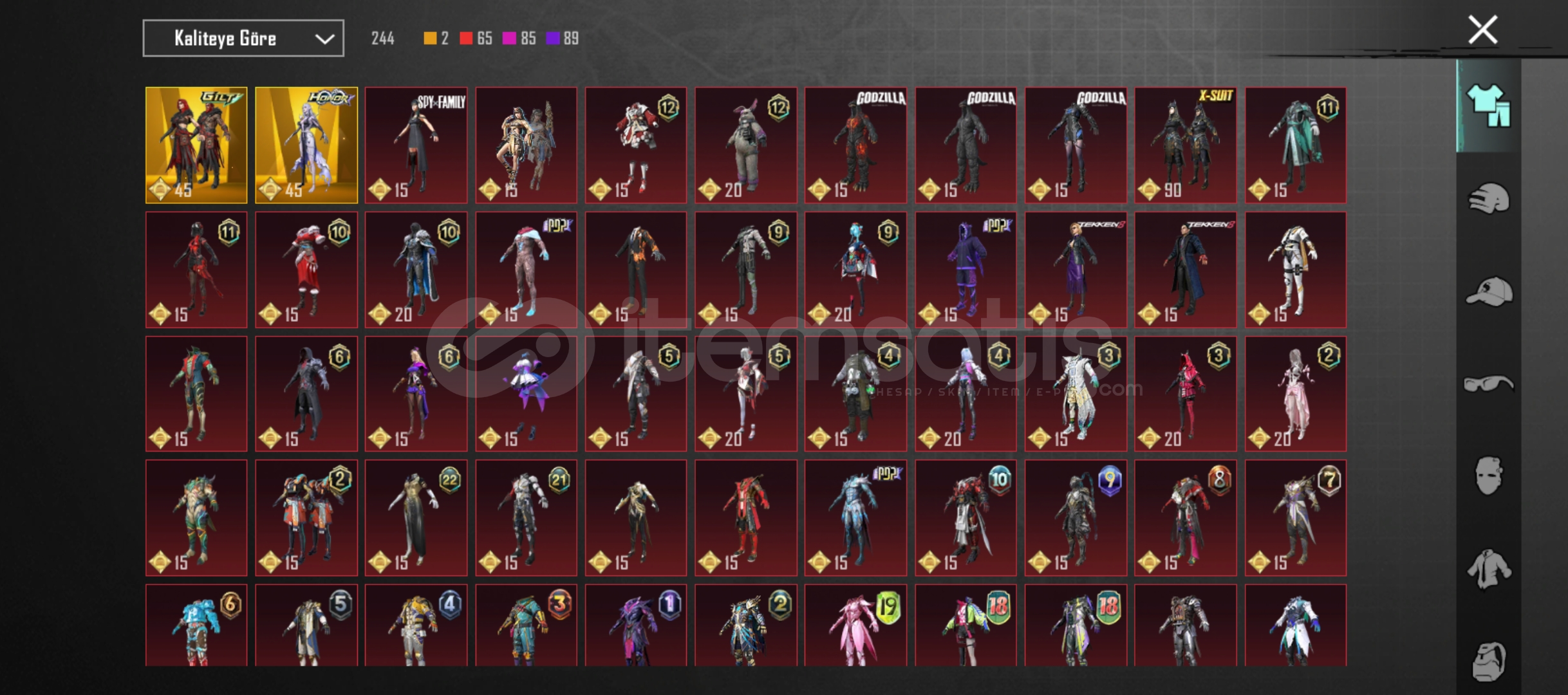 SetlerAnukhra 4 sv Firavun 1 sv Yanardöner xsuit 1 svÖlüm meleği ecel setiVahşi haydut sesiSeri katilKusursuz tetikçiİşgalci tavşancık setiZaman seyyahıDeniz yılanı setiAmansız suikastci setiMaskeli medyum Ra savaşçı setiPilot setiSilahlarKum ozanı dbs 3 seviyeAlevli Godzilla groza 4 svRuhbicen ump 4 svEjder şarkısı mk14 4 svObur tavşan AKM 4 svYükselen ejderha mg 4 svKü&cc...