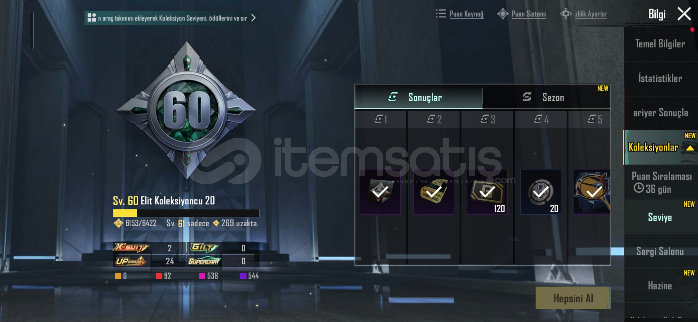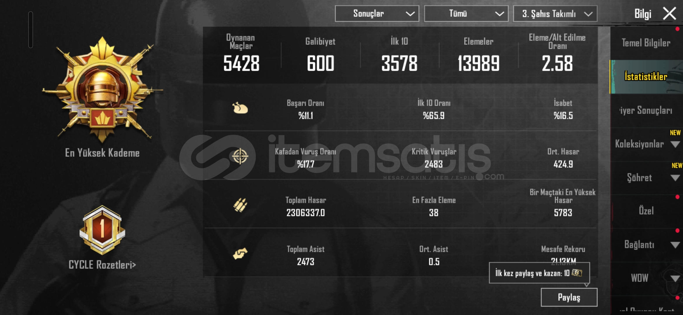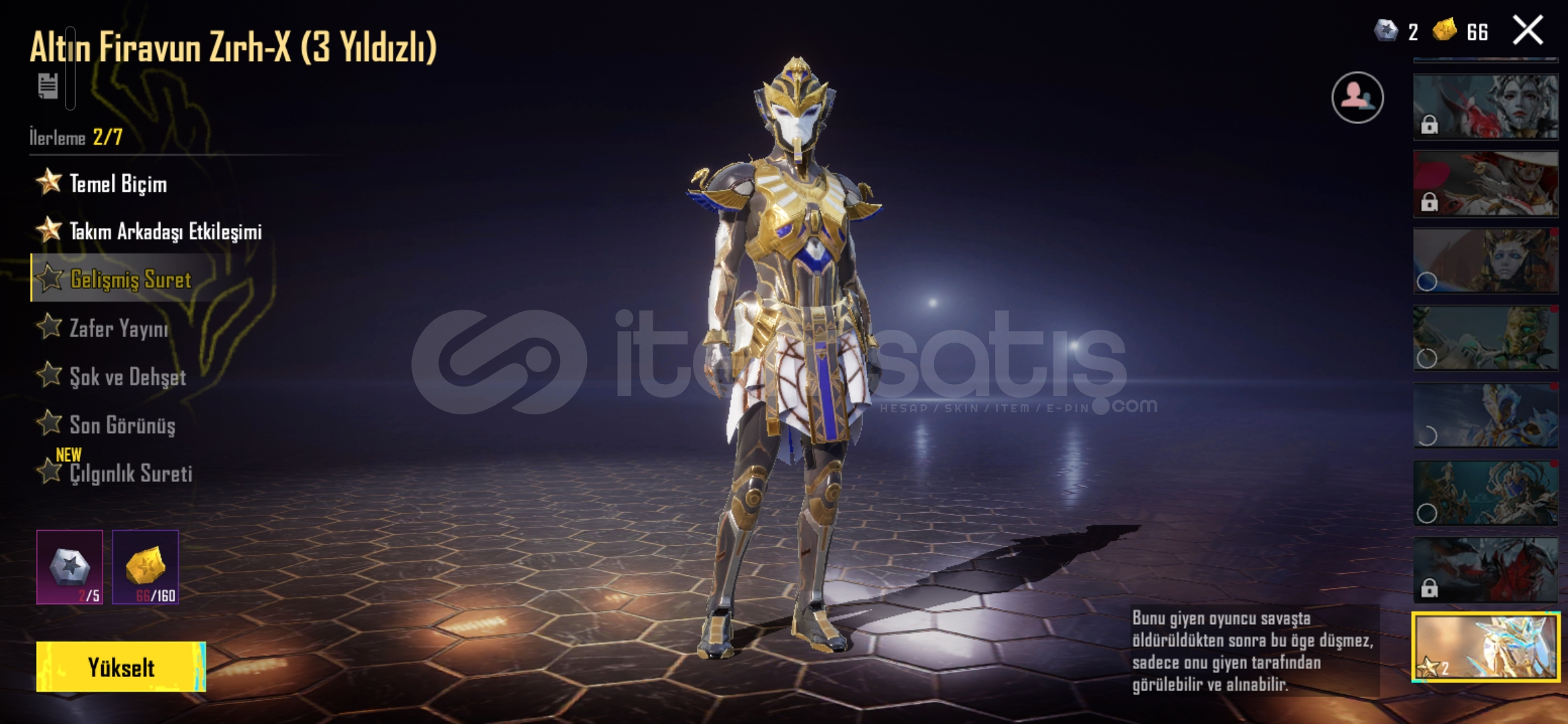 24 tane yukseltilebilir 8 tane olum duyurusu89 destansı rp ile 90 olcak2 tane x suit anukhura (1 lvl) firavun ( 2 lvl )Koleksiyon 60En yuksek rank fatihS5 hariç tüm saçlar varBağlar tertemiz