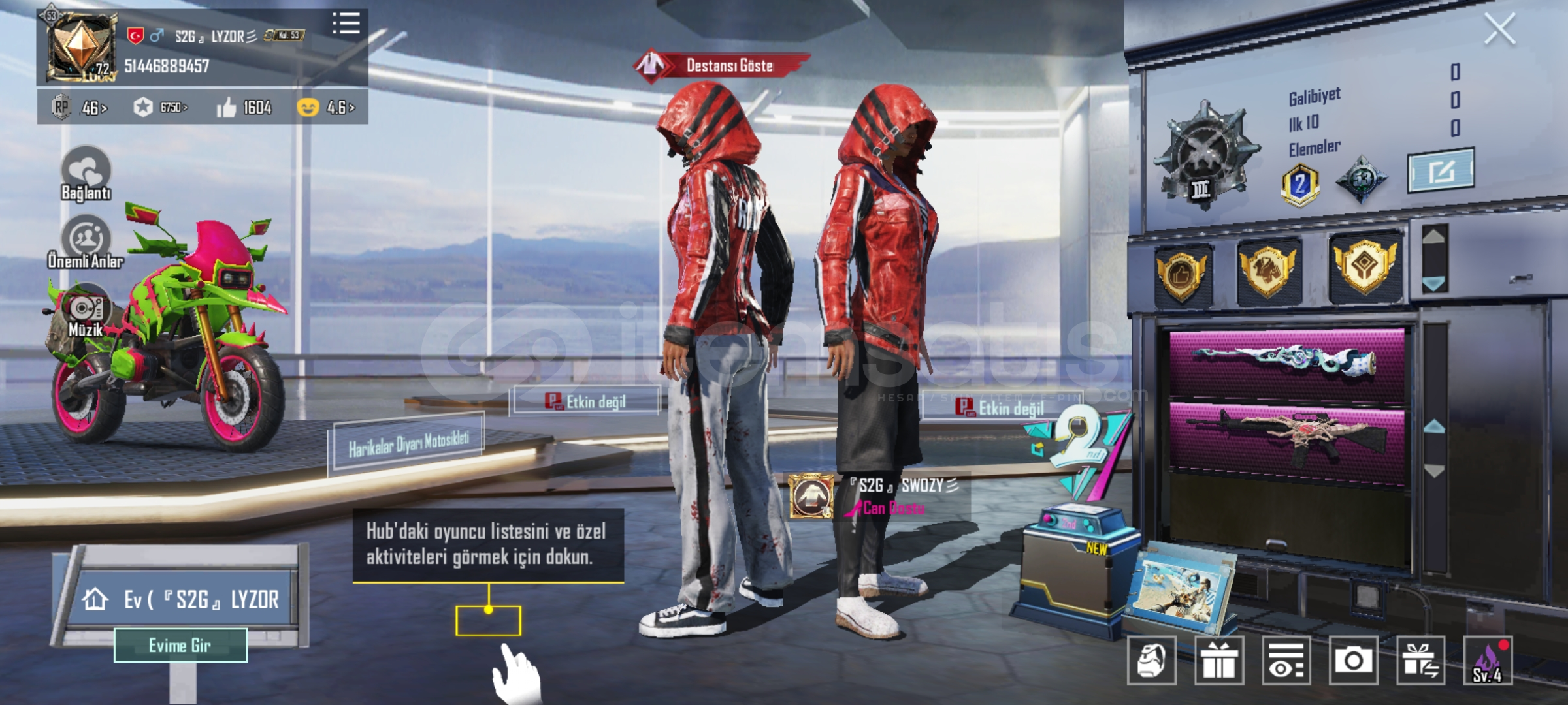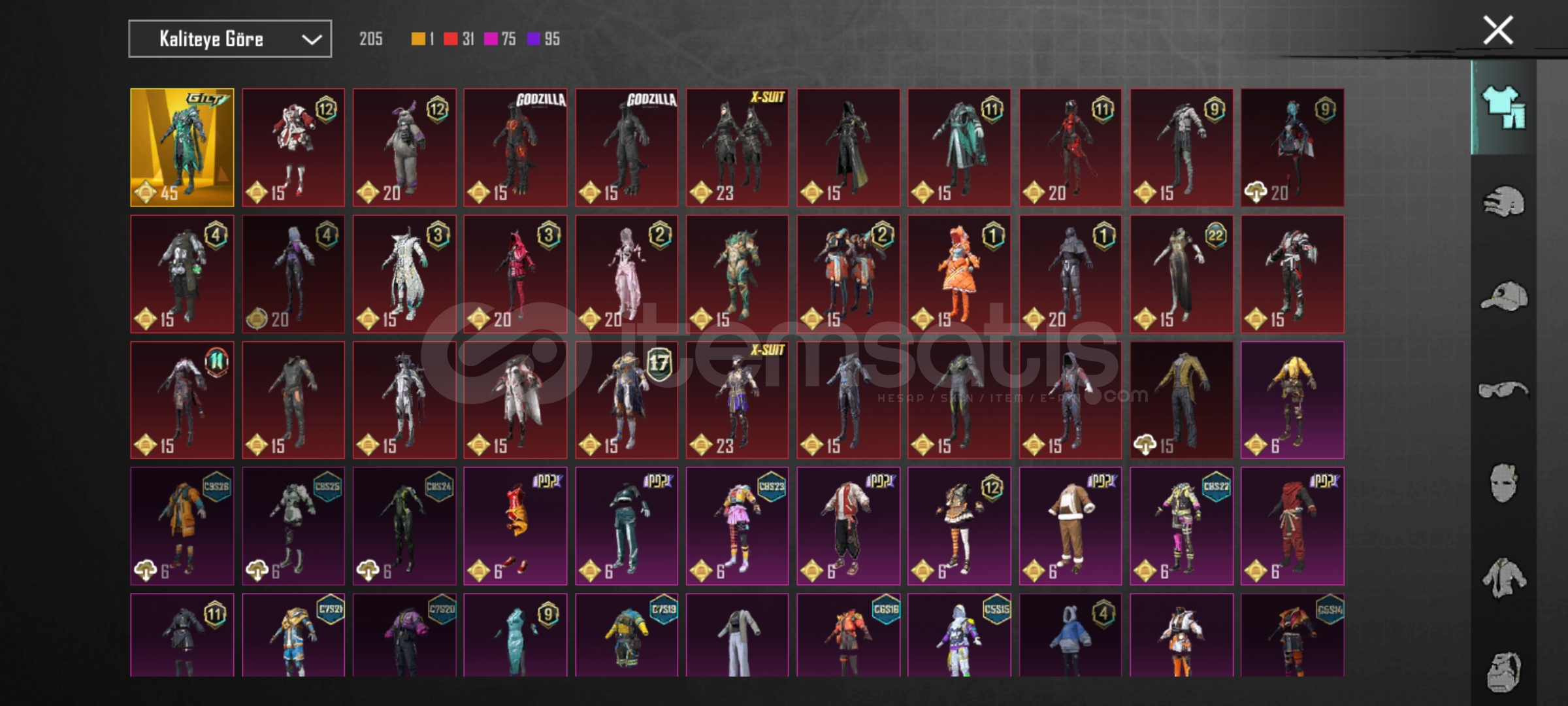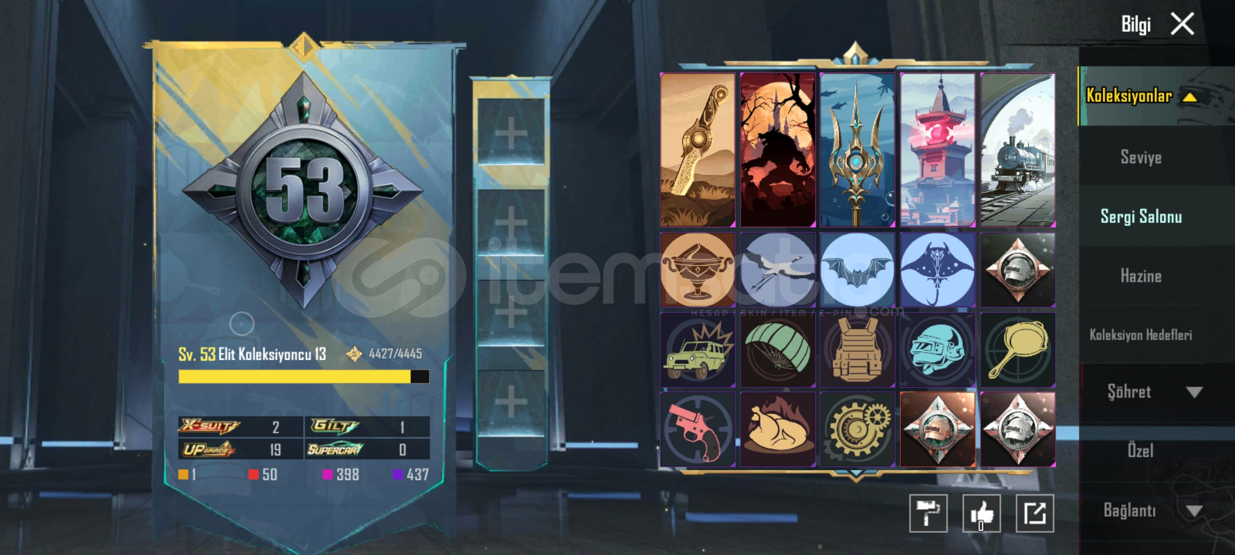 X-suitli,nihaili, destansı gösterişli,19 tane yükseltilebilir silah mevcut tüm silahlarda skin var, araba skinleri uçak skinleri emojiler çantalar vb. 7-8 defa Royal pass açtım koleksiyon seviyesi 54 emek hesabıdır 7 yıldır oynuyordum sıkıldığım için hesabı satıyorum.