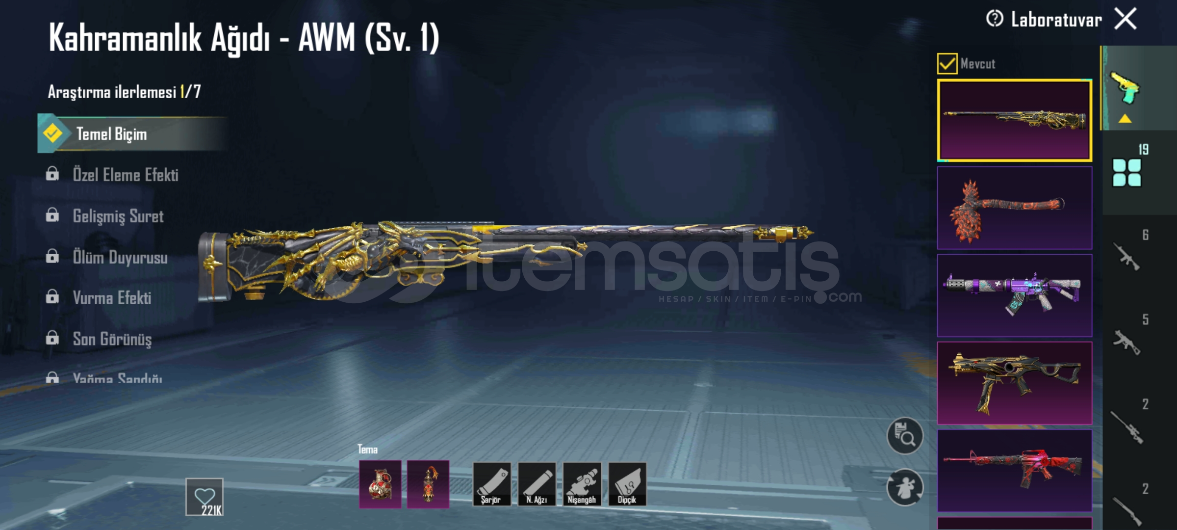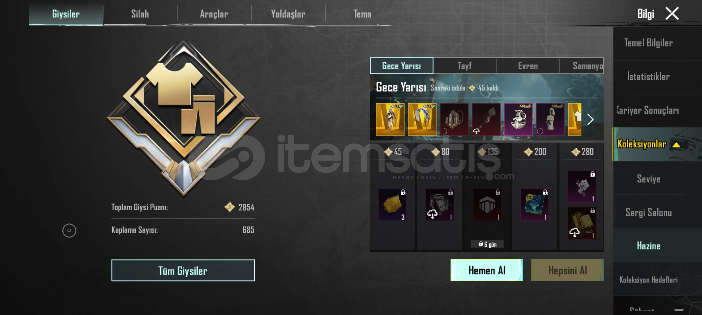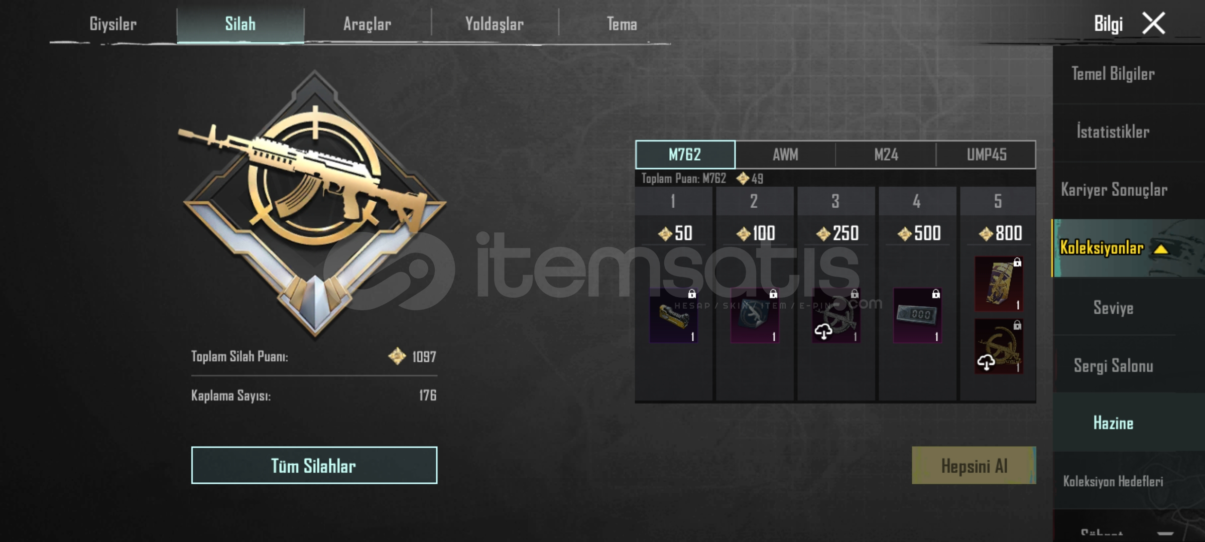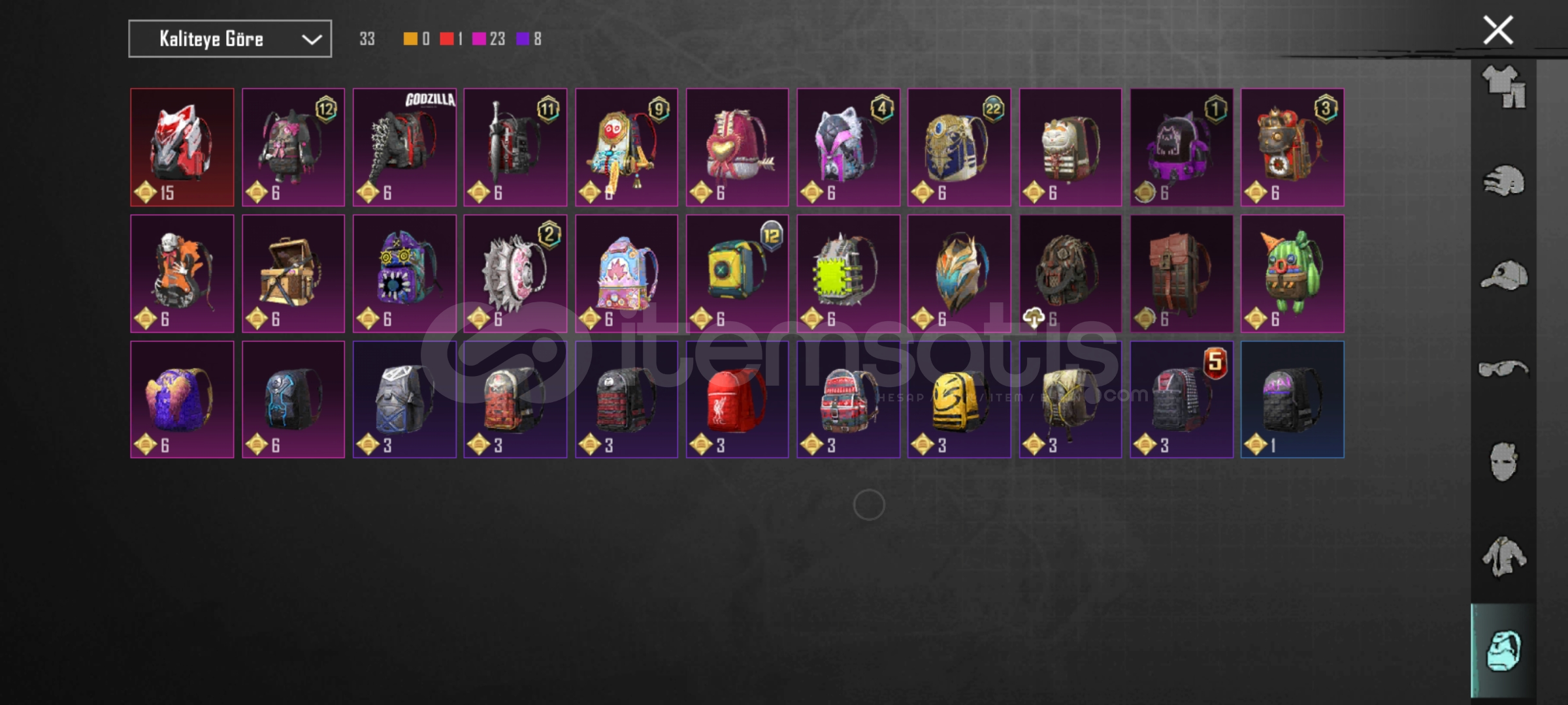 X-suitli,nihaili, destansı gösterişli,19 tane yükseltilebilir silah mevcut tüm silahlarda skin var, araba skinleri uçak skinleri emojiler çantalar vb. 7-8 defa Royal pass açtım koleksiyon seviyesi 54 emek hesabıdır 7 yıldır oynuyordum sıkıldığım için hesabı satıyorum.