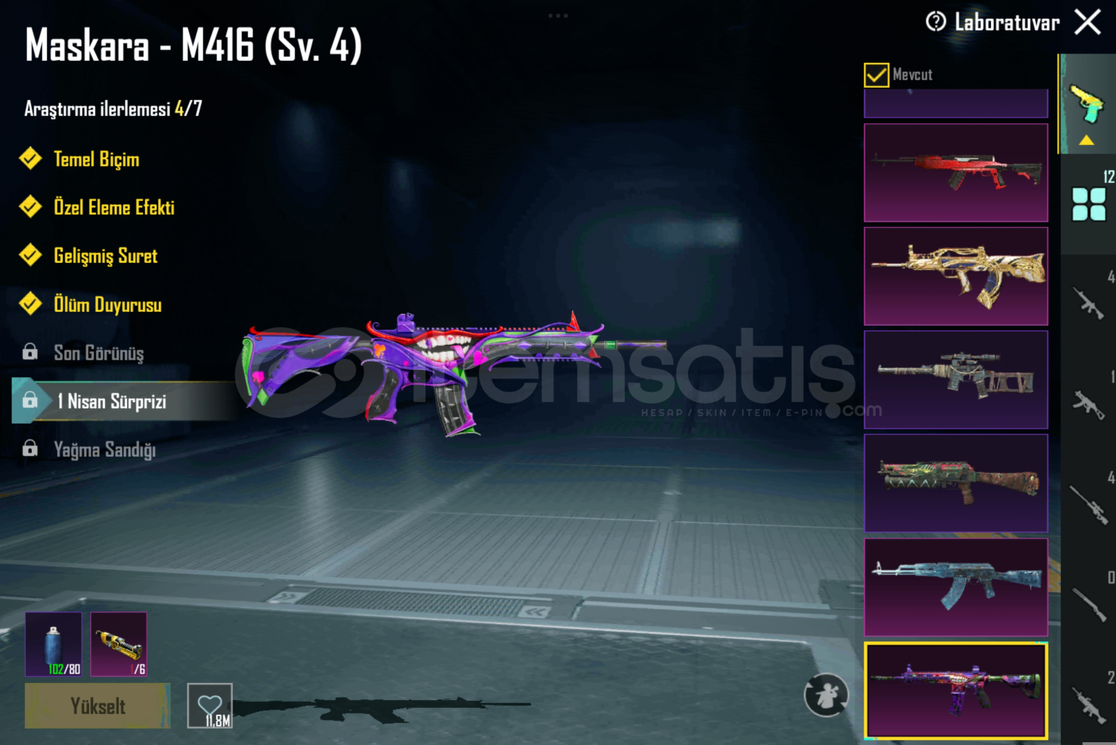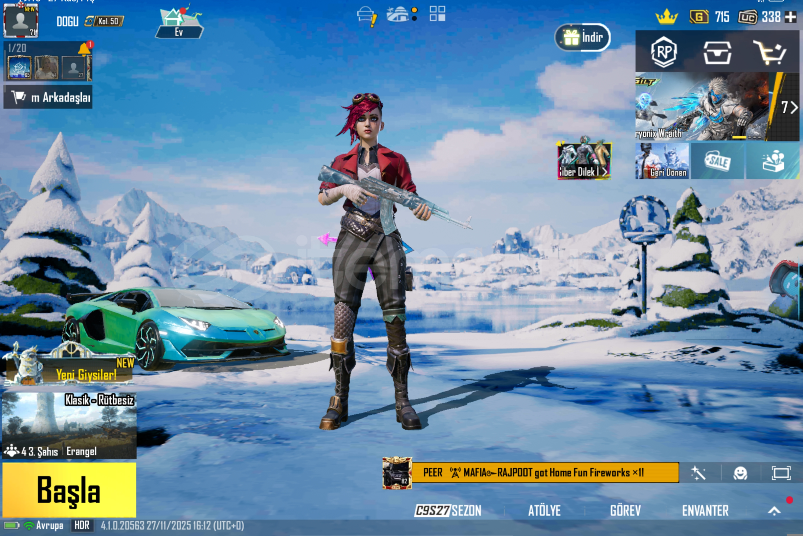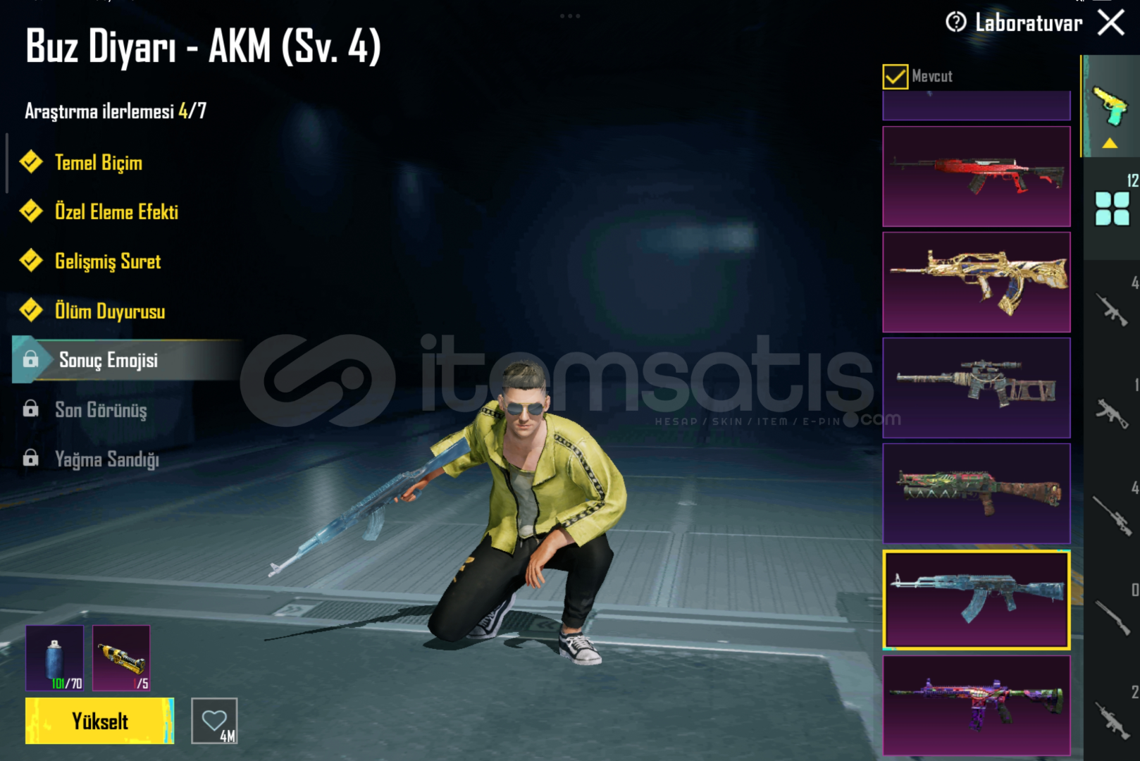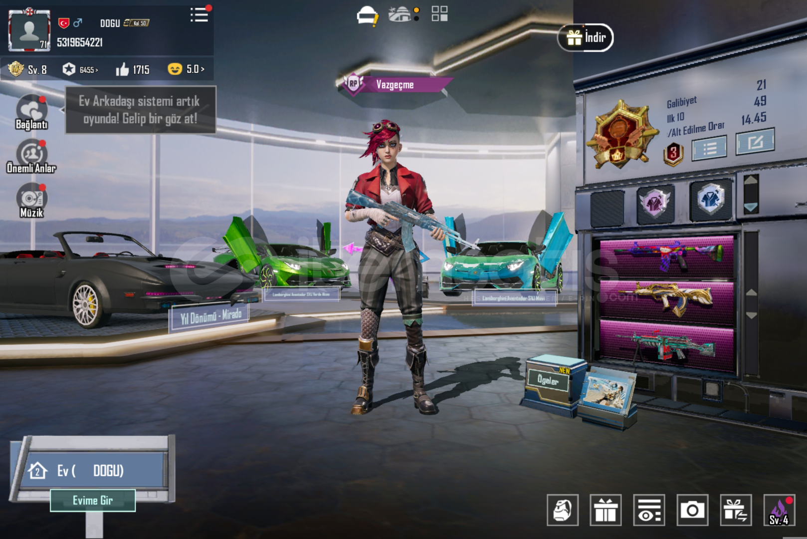 Hesab 71 seviyeİçinde 338 uc vardır 40 destansı 12 yükseltilebilir silah25 bin TL değerinde 2 adet Lamborghini varBiri hava yardımlı yani droplu özel araç Diğeri tek kartlık Lamborghini Medyum kaskı yeni gelen destansı çanta vardır Carlo vb birçok karakter açıktır Maskara M4 4 lvl Buz AKM 4 lvl Qbz 5 lvlM249 4 lvlDP 4 lvl Bizon 4 lvlUmp 7 lvlB...