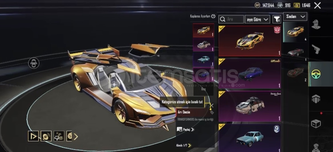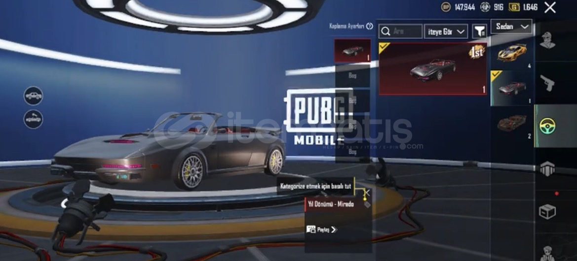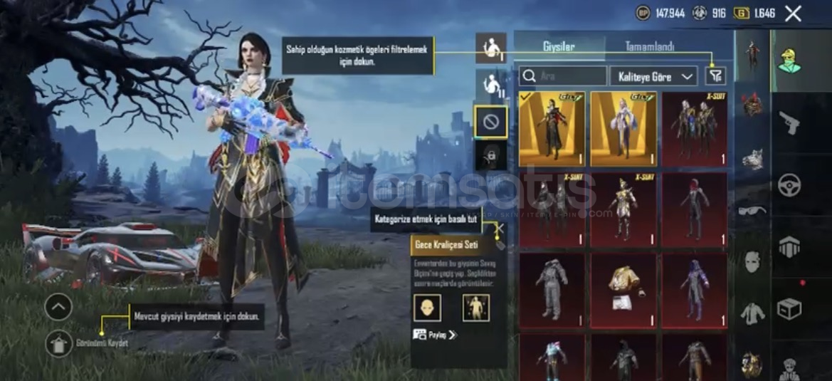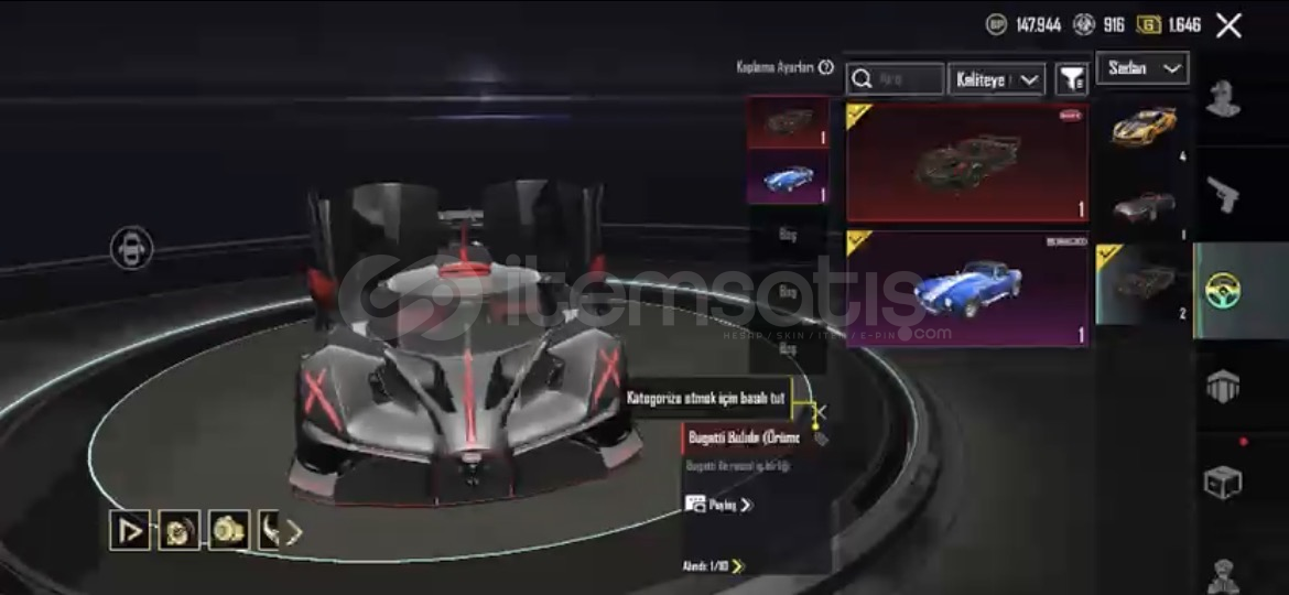 Hesabımda toplam 5 tane spor araba bulunmaktadır 1 Max Silah bulunmaktadır toplam 3 x suitim vardır firavun 3 seviyedirFiravun Çantası varıdır toplam 35 silah vardır Gecenin Şarkıcısı Groza 4 Level8 Bitlik Patlama Ump 4 levelİmparator İhtişamı M416 7 LevelGece Gladyatörü Bizon 3 LevelMühürlü Yer6 M416 4 levelYaramaz Siber Kedi P90 5 LevelAtomik Tetik S12K 4 LevelRuhbiçen Ump 5 L...