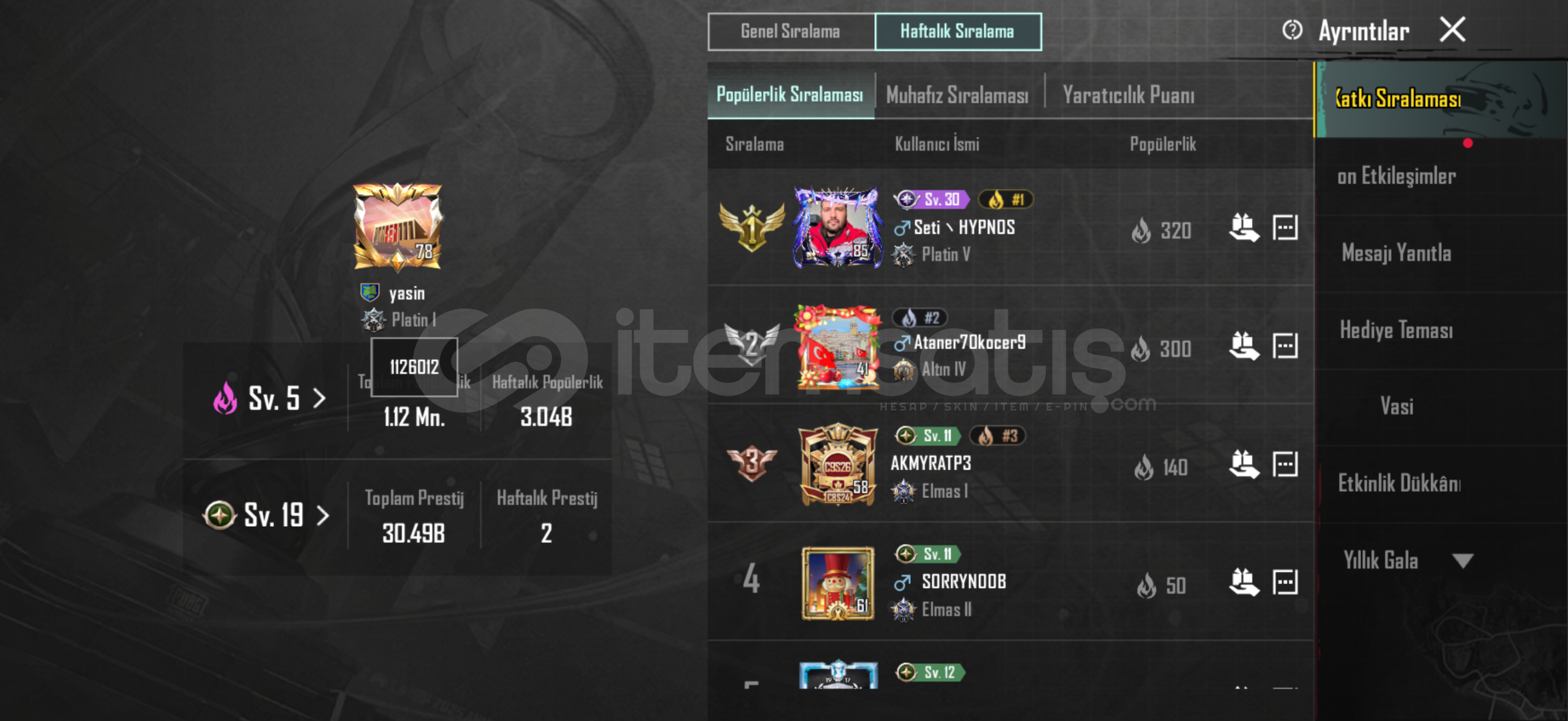 Selamunaleyküm hesabımı satıyorumid:5779213406Koleksiyon seviyem açık ordanda detaylıca bakabilirsinizdetaylı video isteyene atarım.69 koleksiyon seviyesiikili saç varrp açık 720 uceye açtım geçen sezondan kalan 30 seviyede şuan5 tane 7 seviye silah var ölüm duyurulu silahlarda var birsürü11 nihai eşya var 7si setid kartı var 3 adet süresiz1.13 milyon popülerlik var4 ...
