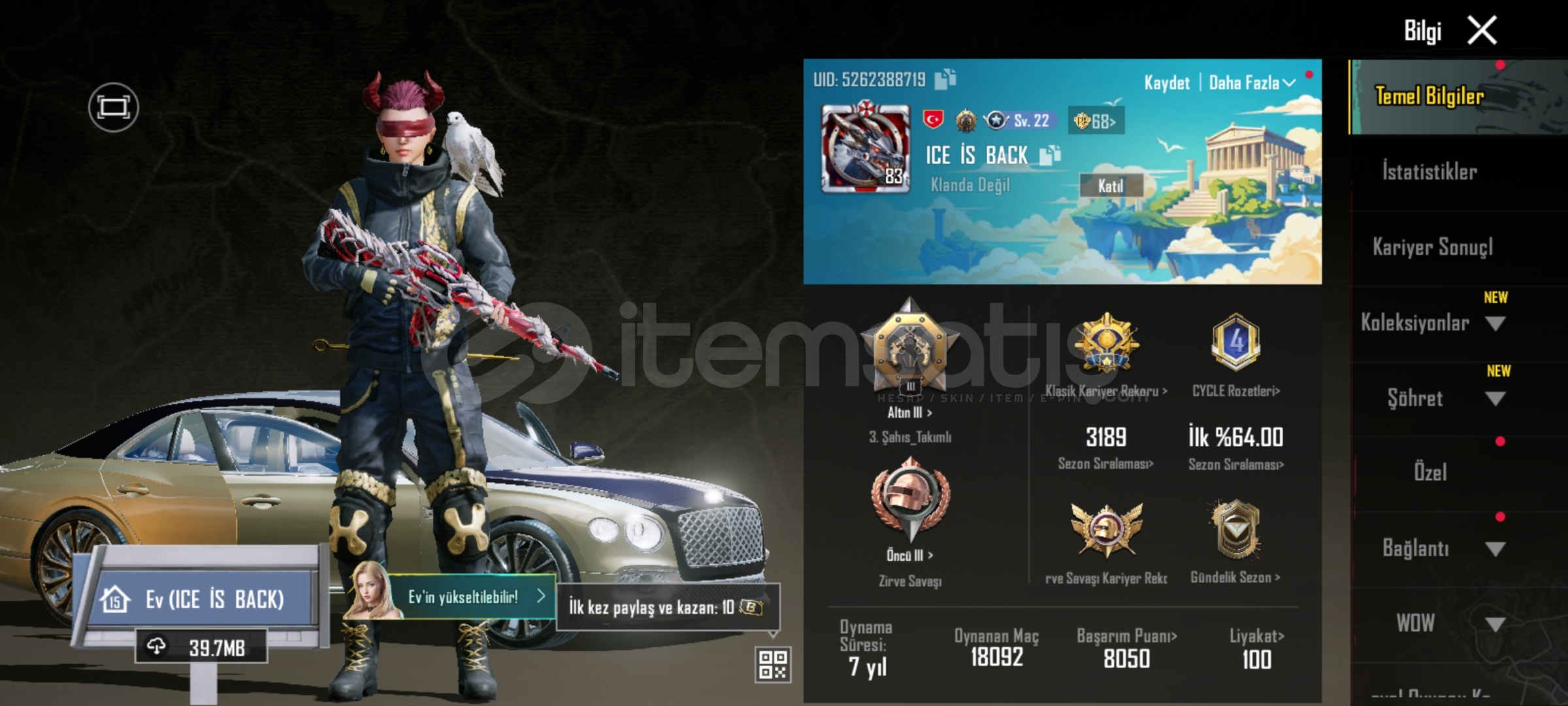 Herkese selamun aleyküm piyasada olmayan cinsten bir hesap var elimizde hesabımızın özelliklerini şöyle anlatalım1.) Hesabımız 70.5koleksiyondur/176destansı vardır/3nihai set toplam 4nihai öge vardır/3xsuit/3tanede spor araba vardır ayrıca nadir godzilla dacia bulunur2.) Emoji olarak çok sağlamdır eski nadir emojili godzilla/saha komutanı/maskara seti/yıldönümü seti/sarı...