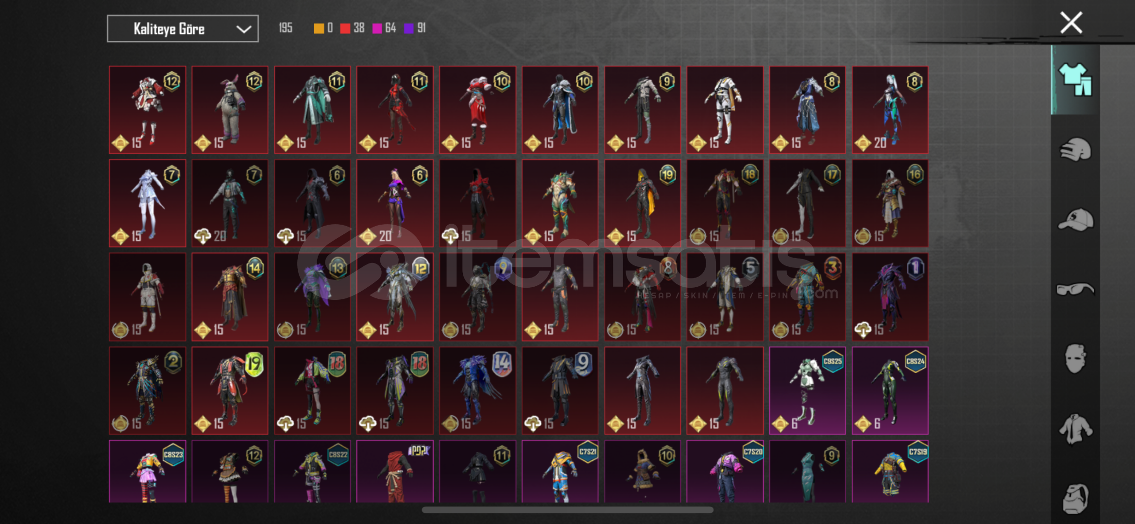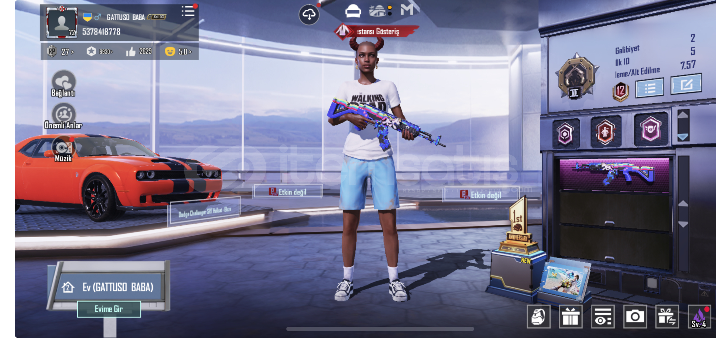 Merhaba Öncelikle Hesabımda Göründüğü Üzere ;72 Seviye65 Destansı8 Yükseltilebilir53 Koleksiyon Seviyesi Var (54 E Çok Az Var)Midilli M762 4 SeviyeZarif Leylak Thompson (Max)Onun Dışında 2 Tane 2 Seviye4 Tane 1 Seviye Silah Mevcuttur-----------------------------------------Nadirlik Ve Doluluğu Özetleyecek Olursak ;Royale Pass Destekçisi Ünvanı !!!!Şehir Sakini PantalonuMavi Alt NadirTwd Thisor...