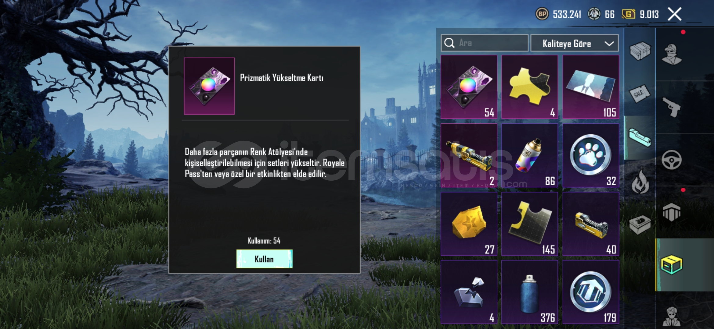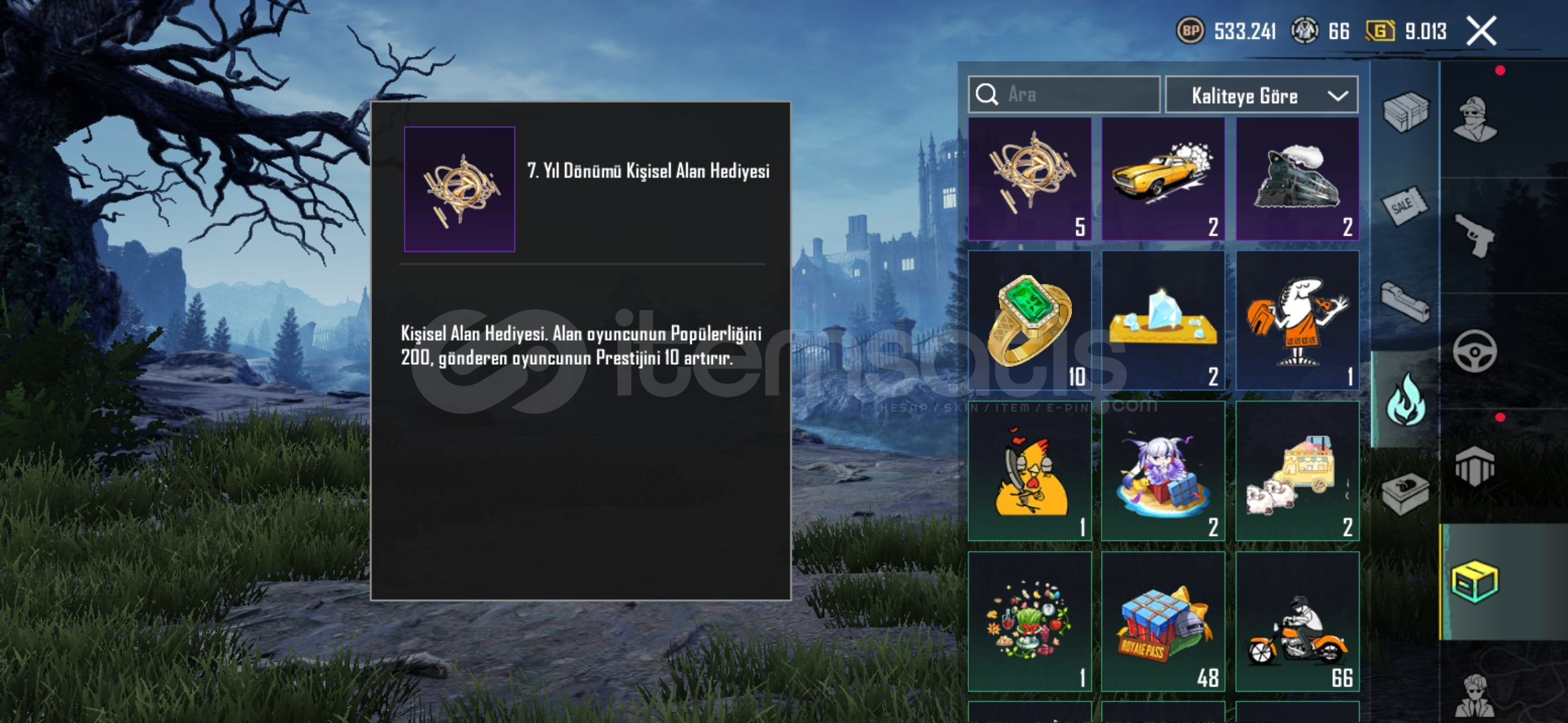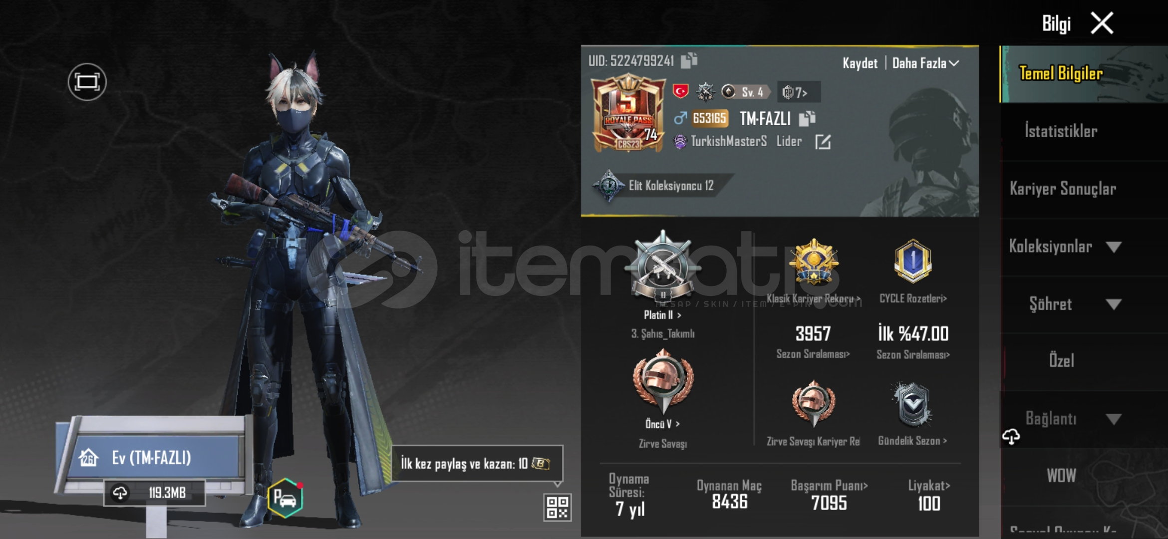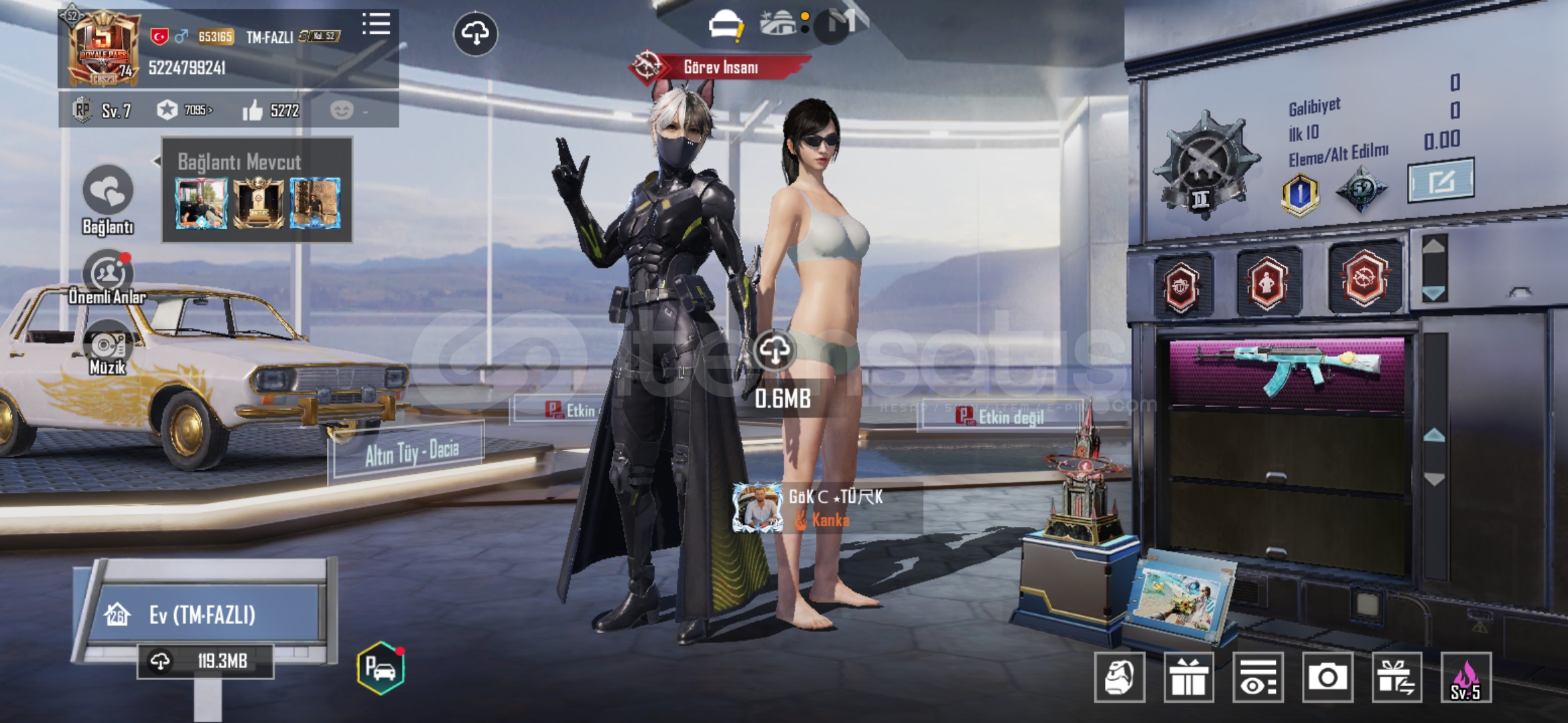 52 level koleksiyon21 adet destansı dans138 adet premium sandık147 adet klasik sandıkGelistirebilir iki araba+50k popülerlikBez maske (leopar)Boş mail bağlı1.38m toplam popülerlik660uc8 level klan da dahil