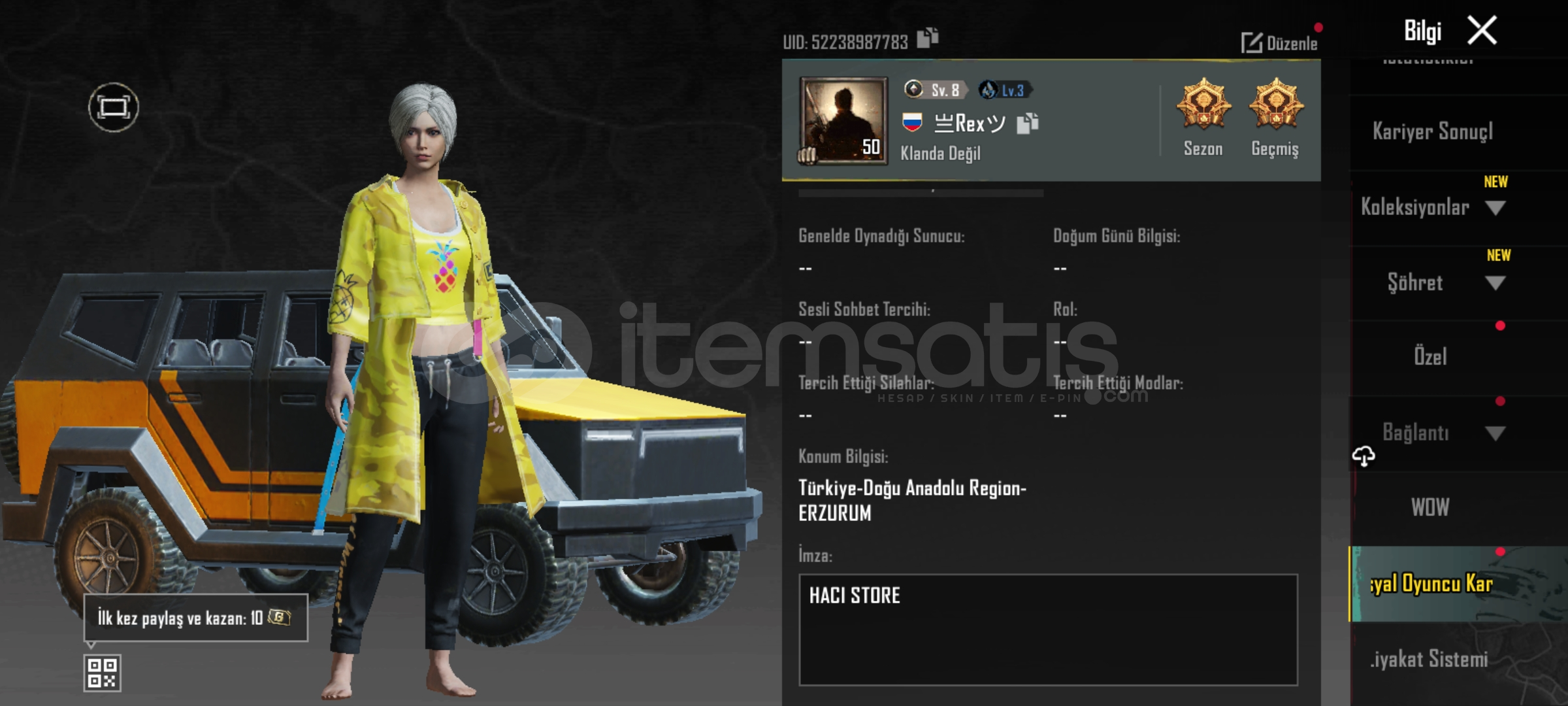 50 seviye 30 koleksiyon 9 destansı 4 geliştirilebilir silah Kan kokusu M16 (1 seviye)Yaşam döngüsü m24 (1 seviye)Mama tabancası Scar (3 seviye)Komutan üst Crew üstAnanas üst Video 👇 https://youtu.be/KkWqscSZt74?si=eUV3ph5v53uXJn18UFAK PAZARLIK PAYI VARDIR !!!BAĞLARI DEĞİŞİME AÇIKTIR !!! Daha fazla bilgi edinmek için yazabilirsiniz.