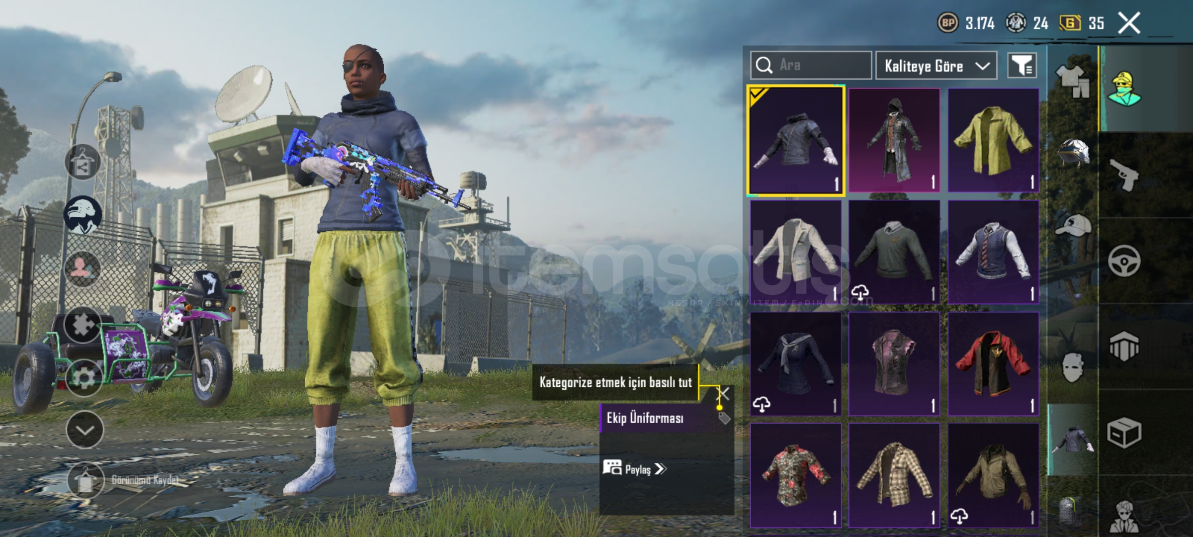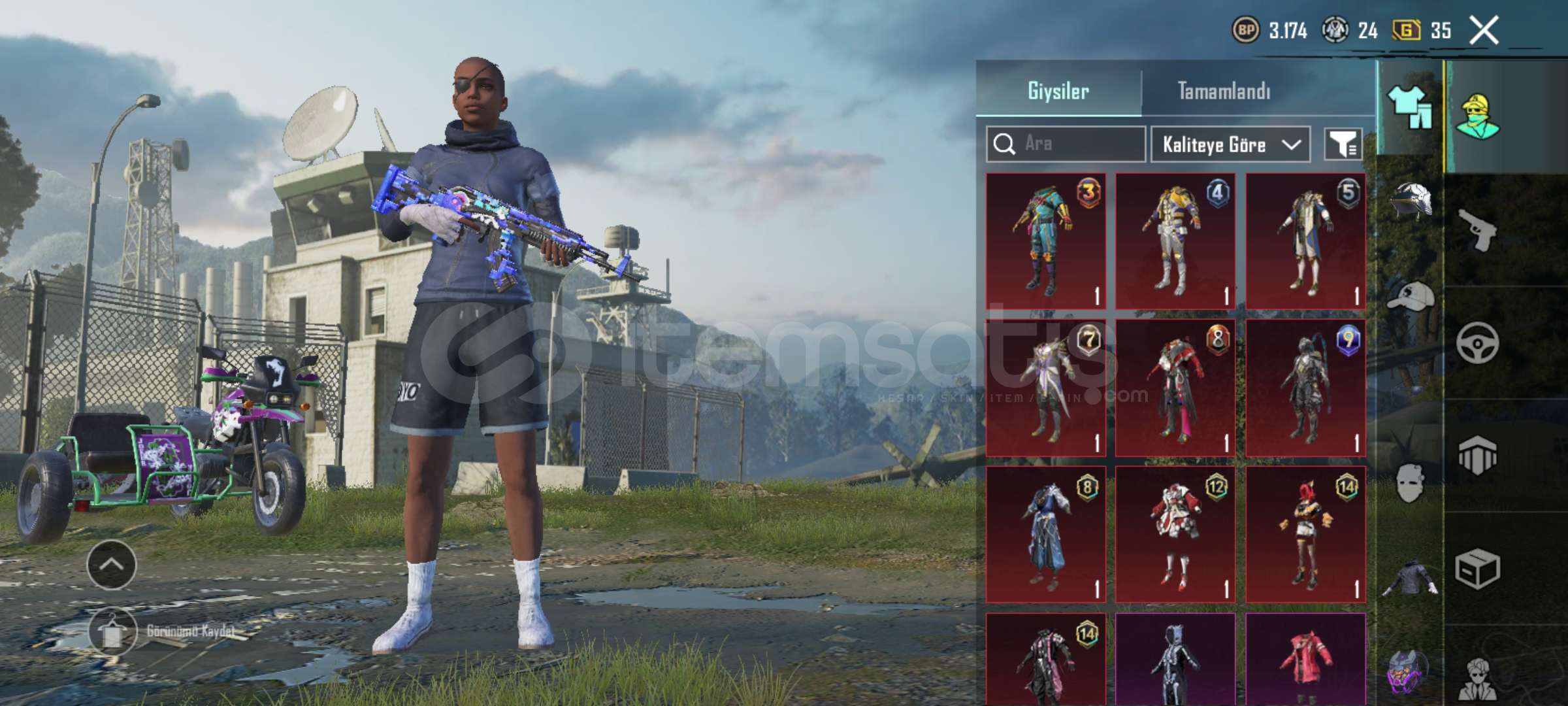Hesap 62 seviyedirGeçen sezon RP full5 adet yükseltilebilir vardırMidilli m7 4seviyeGecenin şarkısı Groza 3 seviyeTeğmen parsel uaz deseniMaskara motosikletOkyanus gözcüsü motosikletTDM kombinleri boldur9 kere RP açılmıştırYeşil ve sarı alt vardırSarı üstUzun çorap siyah vardırGri eşofmanTDM sırt çantaları vardırGodzilla tava vardırSara ve Anna karak...