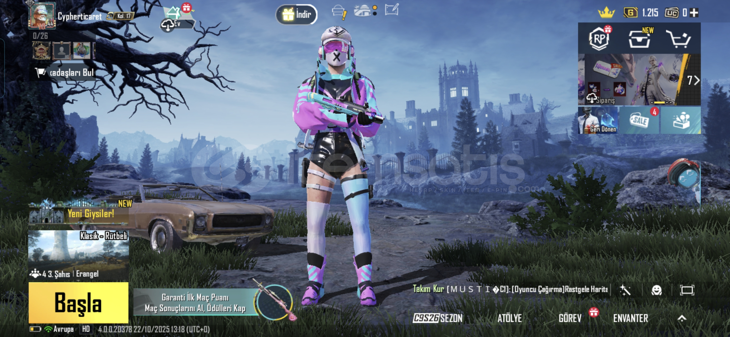 Merhaba ilk ilanımdır hesapta c5s13 ve c5s14 seti 18. Sezon ve 19.sezon seti union punk seti mor alev seti 105.000 bp gece topluluğu kaskı Cankurtaran, kan kırmızısı kask güneş kral tağcı hayalet atkısı koruyucu maske korku hastanesi maske, kırmızı siyah ve gece topluluğu sırt çantası 8 adet malzeme sandğı ve 1 tane klasik sandık pembe mavi akm kılıç ustas...