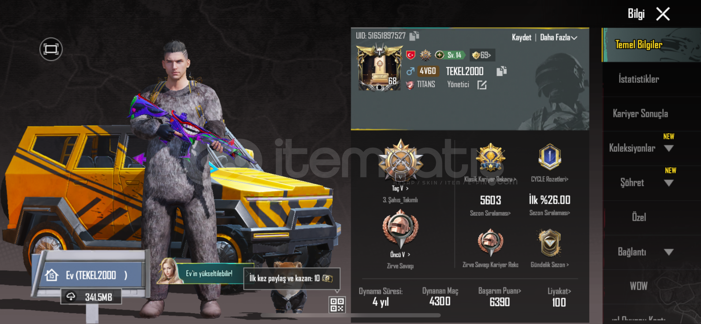 16 tane falan yükseltilebilir silah 6 tane ölüm duyurusuna kadar bastığım silah var maskara 5 sv firavun çantası paraşüt vs falan var sıcarL,m762,m16,groza ölüm duyurusu var hesabı az çok görüyorsunuz zaten 2 uaz 1 bugg yükseltilebilir var carlo sara yoldaş vs var aklımdakiler bunlar merak ettiğiniz herhangi bişey olursa yazabilirsiniz