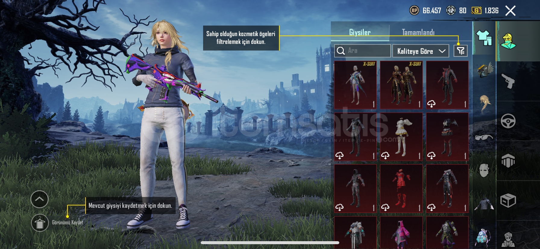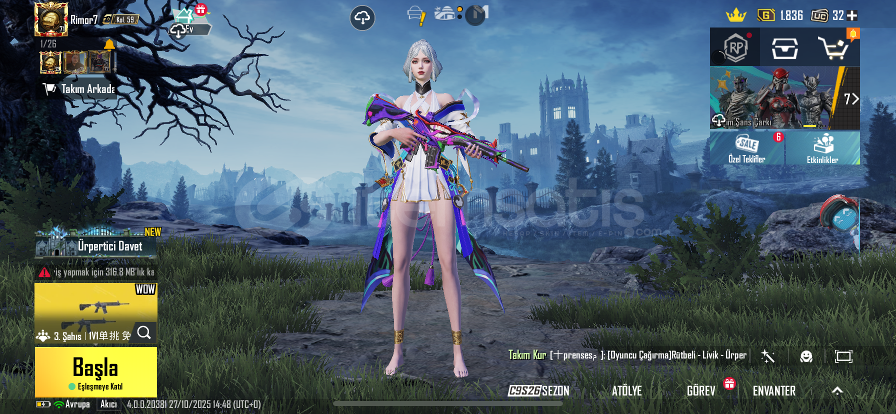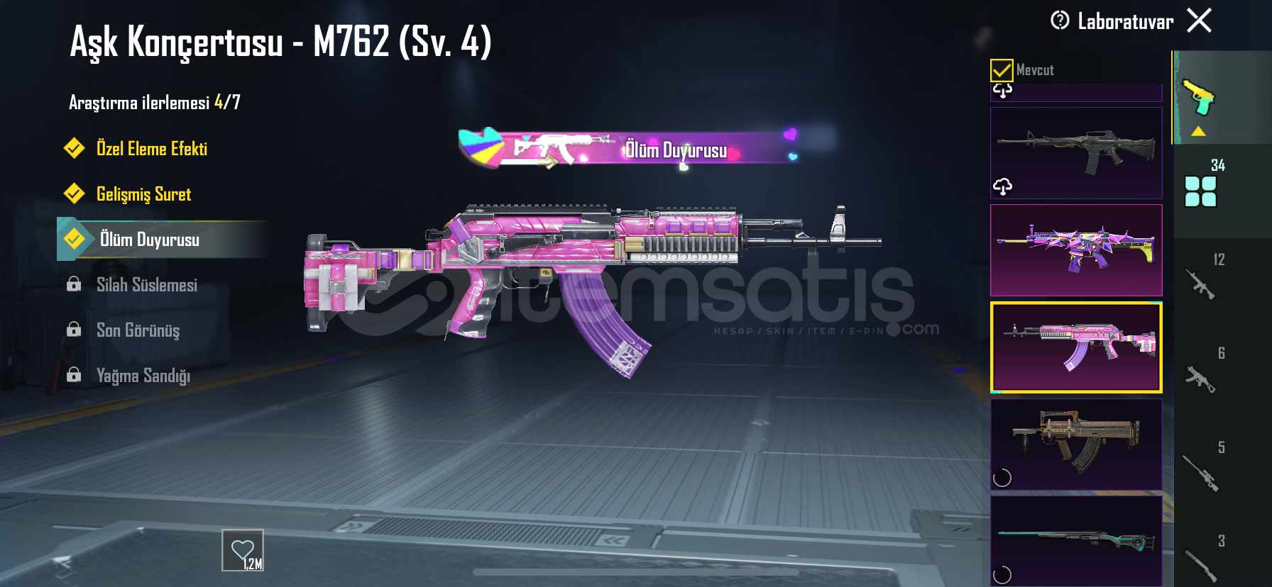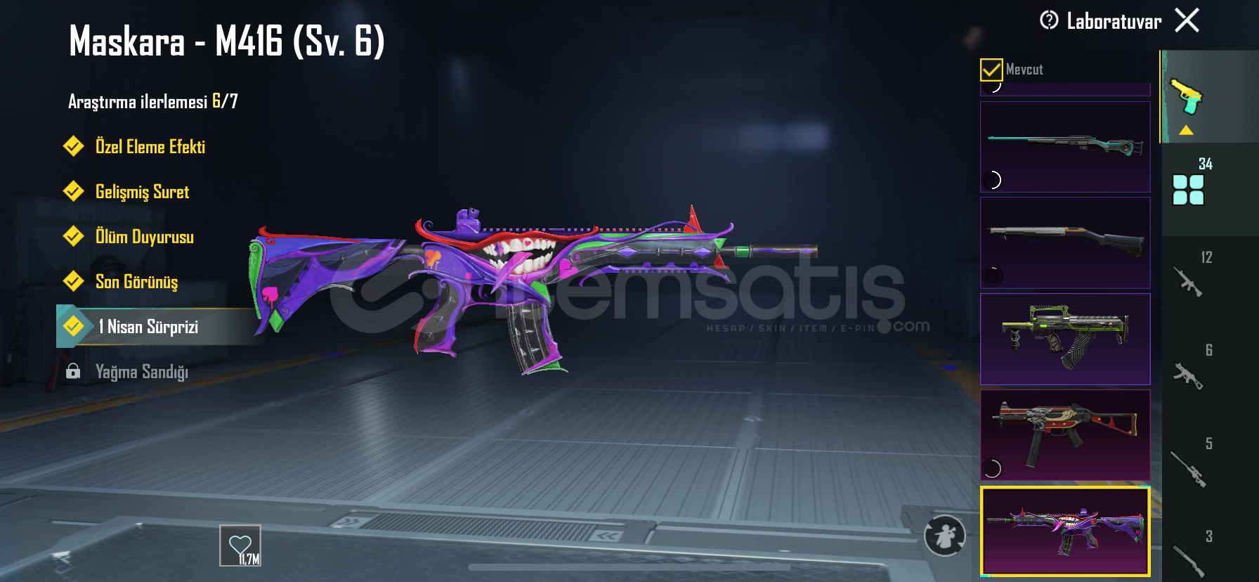 90 Destansı 2X suitli 2side 2 seviye 34 yükseltilebilir silah Mühürlü M416 (6 seviye),Maskara scar L (4 Seviye),Gökkuşağı iğnesi Ump ( 4 seviye),1st yıl dönümü ump ,Arındırıcı Amr (2 seviye),Yükselen ejderha Mg 3 ( 4 seviye),Aşk konçertosu M762 ( 4 seviye)Maskara m416 (6 seviye) S12 k 4 seviye. +(2 materyal 5 x suit yükseltme parçacığı vardır )