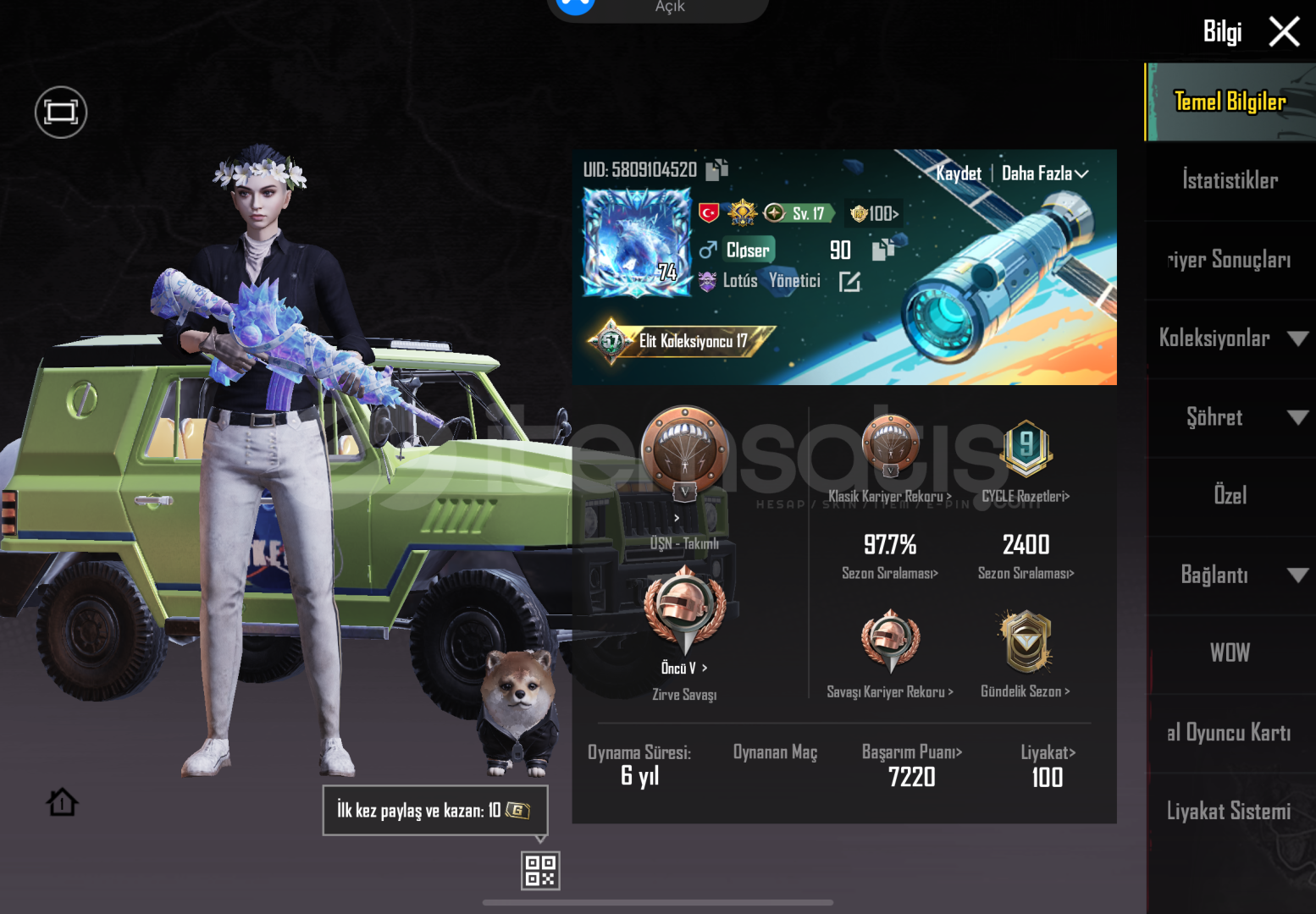 Destansı gösterişKoleksiyon 57 Level944 UCMühürlü yer altı m4 6 level 5 ölüm mesajı m4, m24, bizon, uzi, m768 Komutan pantolonu Galadria x-suit335 Boya, 4 tane Modifikasyon malzemesi 7 tane parçası