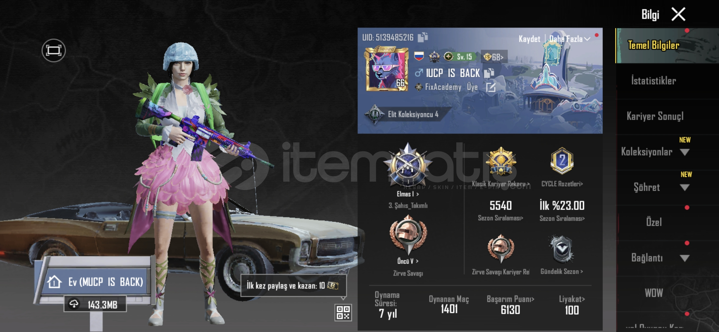 Öncelikle selamün aleyküm arkadaşlar hesap içeriği şunlardır:1 X suit m4 maskara 4lvl Orman elfi seti yıl dönümü seti yarın operasyonu seti dalgıç seti işgalci seti kombinlikler vardır yüksek ses scar var 15 yükseltilebilir var 35 destansı dahada fazla olabilir 38 fln rp açık gozdilla vardır buz kask vardır kelepir fiyat ihtiyaçtan satıyorum bu fiyata daha iyisini bulamazsınız ölü bağ yoktur hesapta herşey alıcıya devredilecektir alana şimdiden hayırlı olsun🥰😍