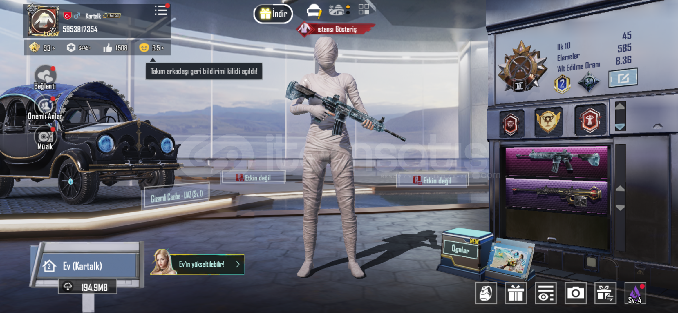 Hesap 56 destansı rp açık 315 uc var rp den gelecek ile bi dahakinide açabilirsininiz oda kartı pop güzel var hesapta uaz deseni vardır 18 yükseltilebilir silah var