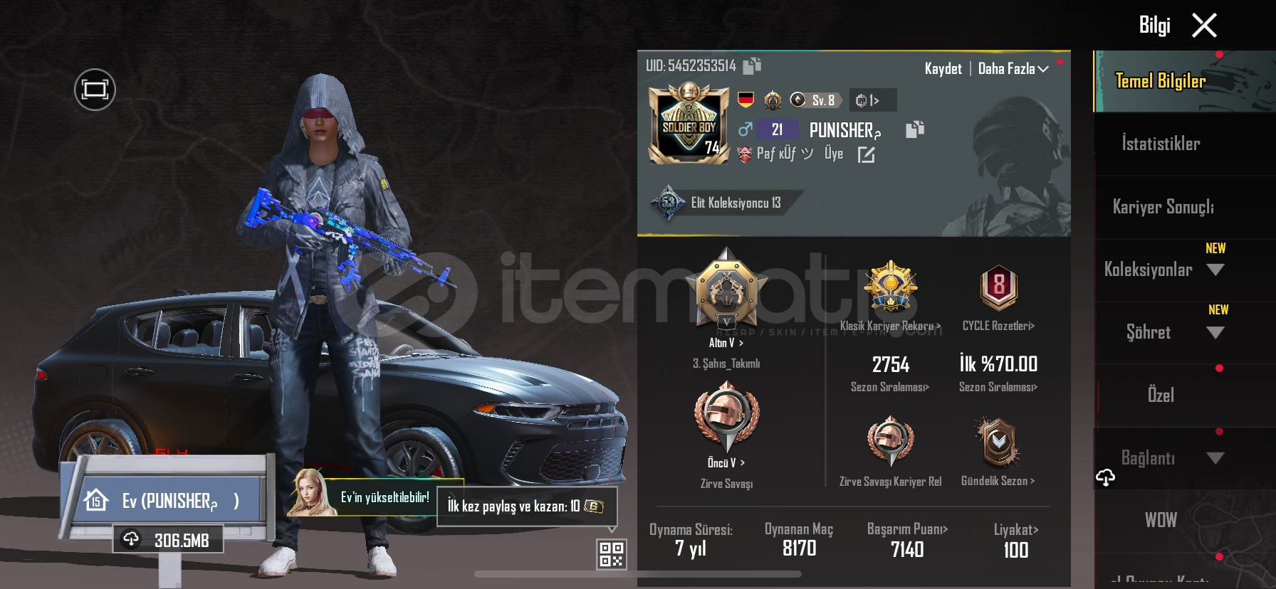 Genel BilgilerSeviye: 74Başarım Puanı: 7140Koleksiyon Seviyesi: 537 Yıllık Hesap – nadir ve eski içerikler barındırır13 Adet Yükseltilebilir SilahNadir kombinlik kıyafetler ve özel kozmetiklerTemiz hesap, direkt devredilir🔫 Yükseltilebilir Silahlar (SV3–SV4)🐎 Küçük Middili – SV4🐲 Yükselen Ejderha MG3 – SV3🌊 Denizlerin Evrimi UMP45 – SV3✨ Pe...