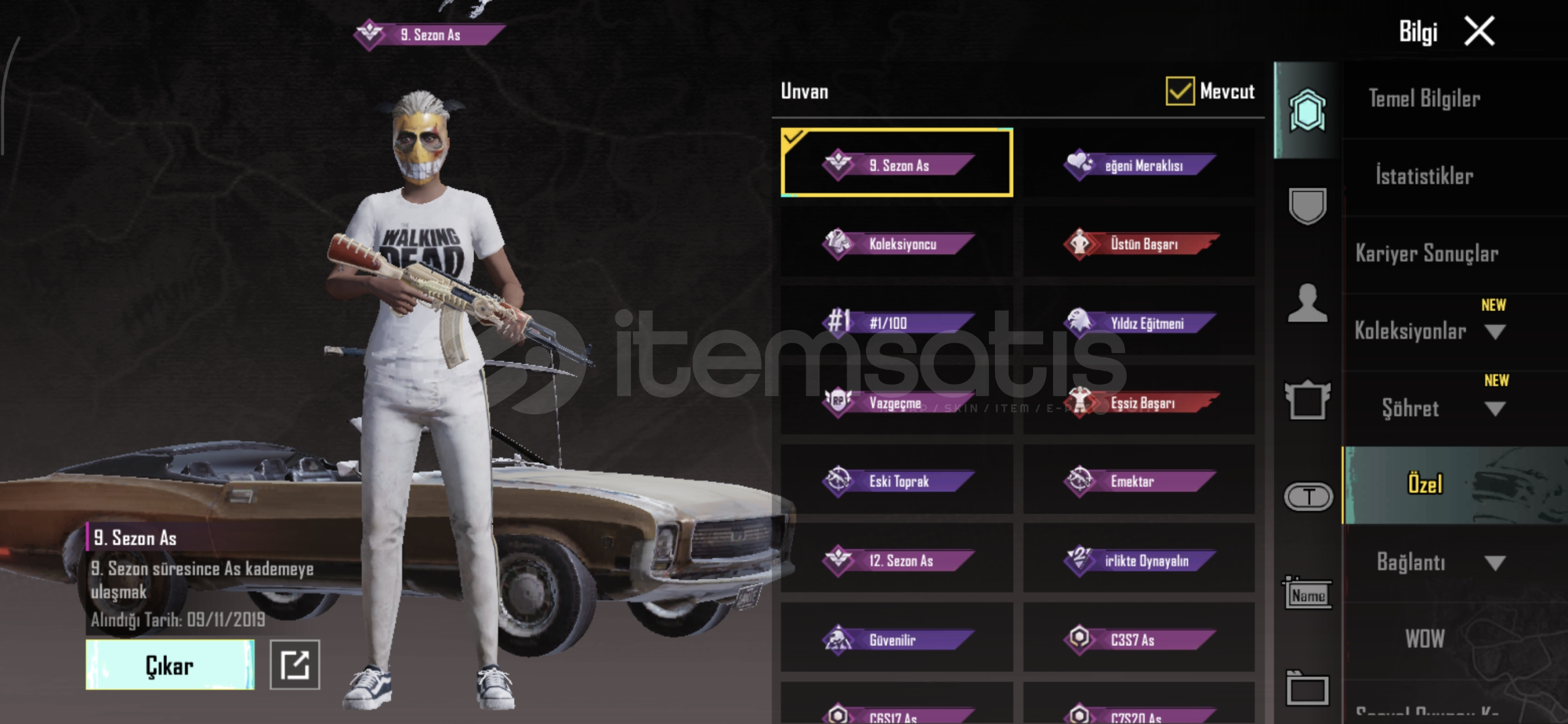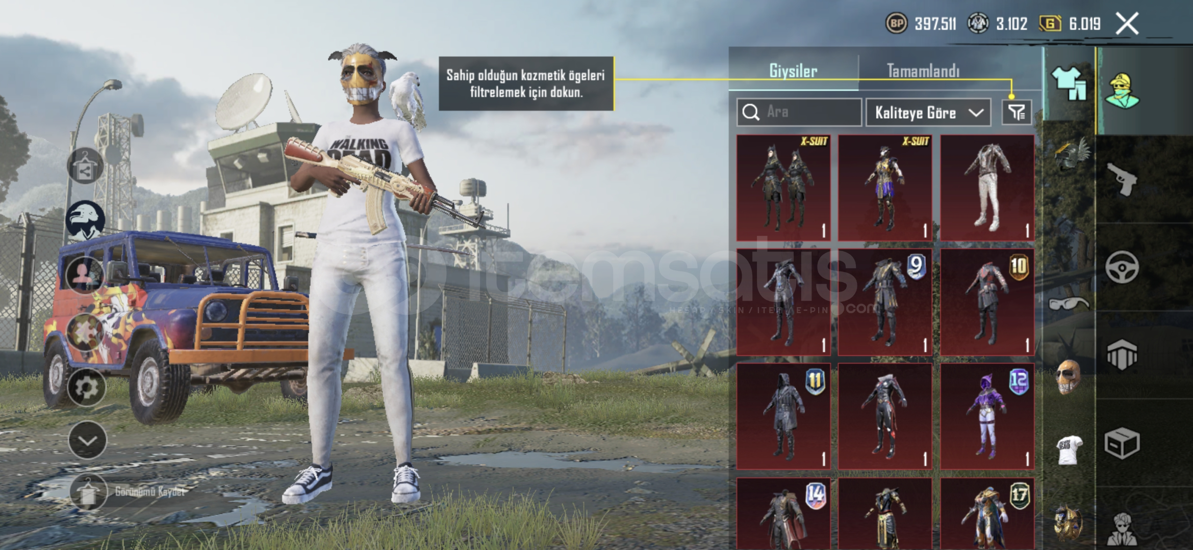 detaylı bilgi için yazinHesaptaFiravun 2svAnukhra 1 svRock Yıldızı setiMaça Valesi set (kafasıda var)Nut savaşcısı seti Yüce Bilge setiTavuk Kostümü ve kafası (Nadir)Kont setiGece Yolcusu seti/Maskeli medyum kaskıKırmızı göz bandıS2 ucube maskesiFiravun çantası ve Yargıcı sırt cantasi/crewyarışcı ustu (gumus)The Walking Death (beyaz+siyah)Sokak sanatci...