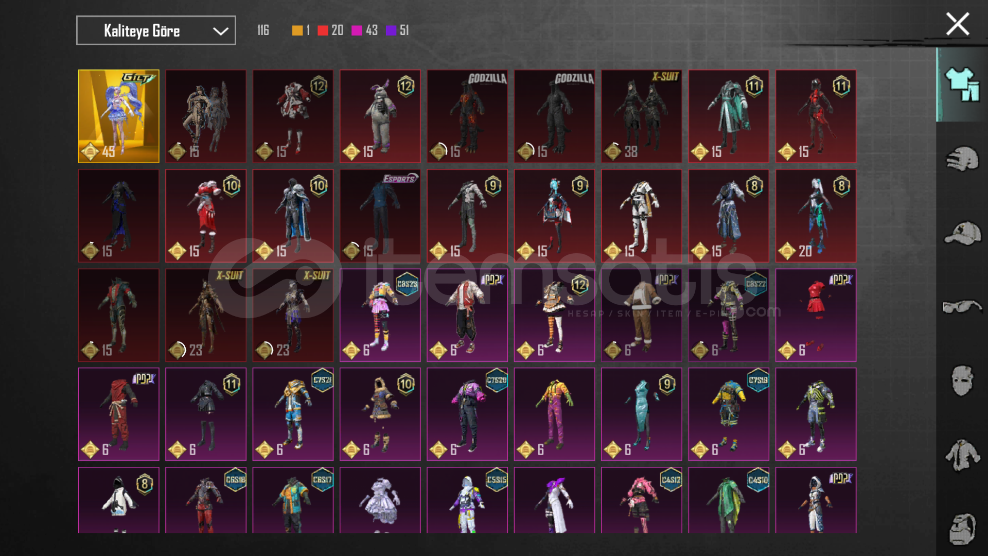 Fotoğraflarda bütün her şeyi yükledim. Öğrenci olduğum için satıyorum.Buz diyarı 5 seviyeRuhbiçen Ump 4 seviyeAlevli Godzilla Savaş Baltası 3 seviyeAltın Pençe p90 4 seviyeBuz Scar 1 seviyeKükreyen Kaplan Akm 4 seviyeRuhani Muhafız uzi 3 seviyeGizemli kraken ace32 1 seviyeEndüstriyel Yırtıcı m24 4 seviyeBuz ump 1 seviyeKatil Balkabağı groza 4 seviyeKüçük ...