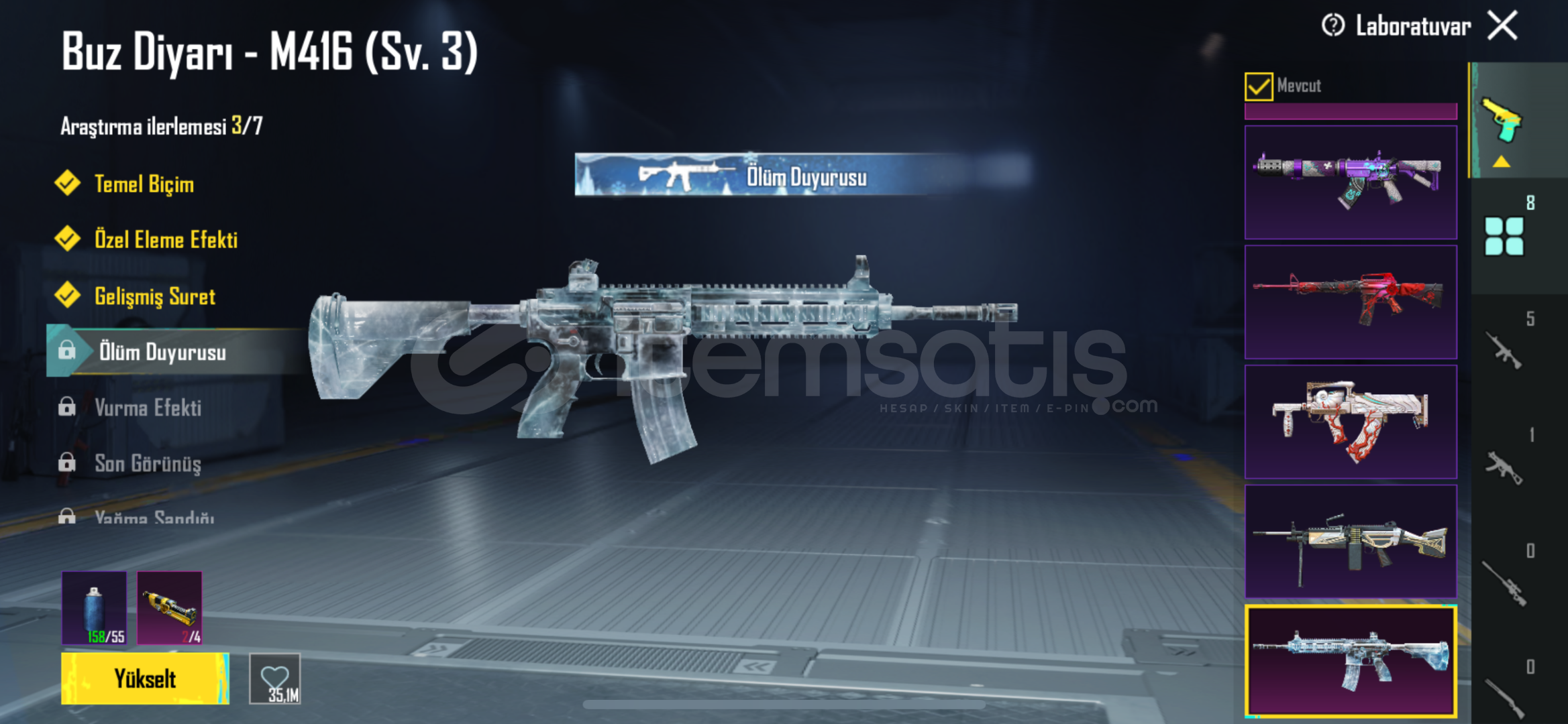 buz M4(3lvl), zincirli cehennem uzi ve toplamda 8 adet YÜKSELTİLEBİLİR toplamda 61 adet silah skimi vardır.