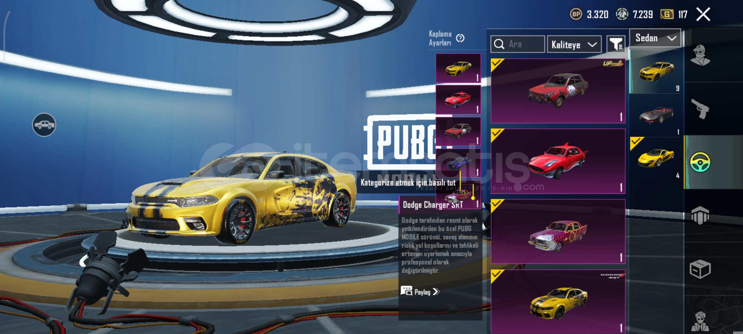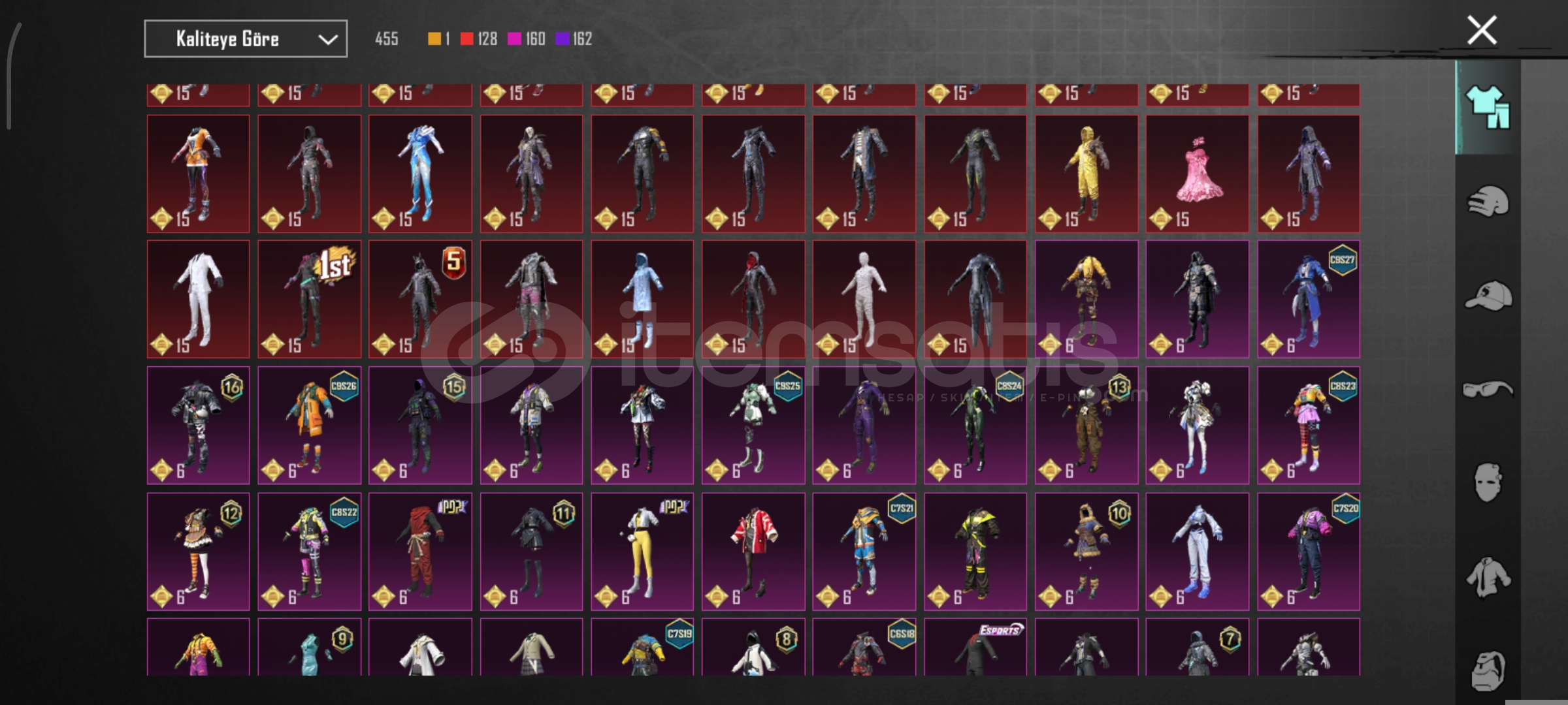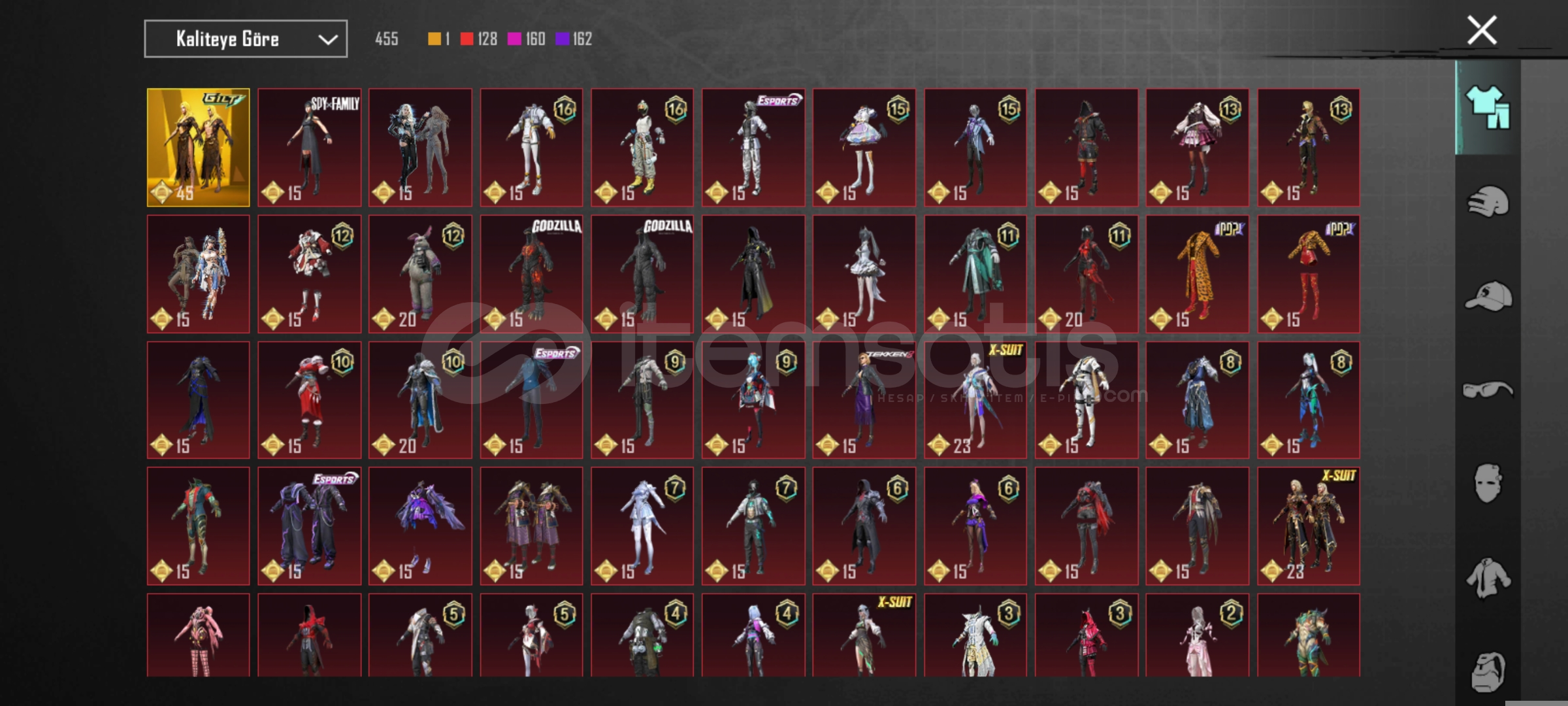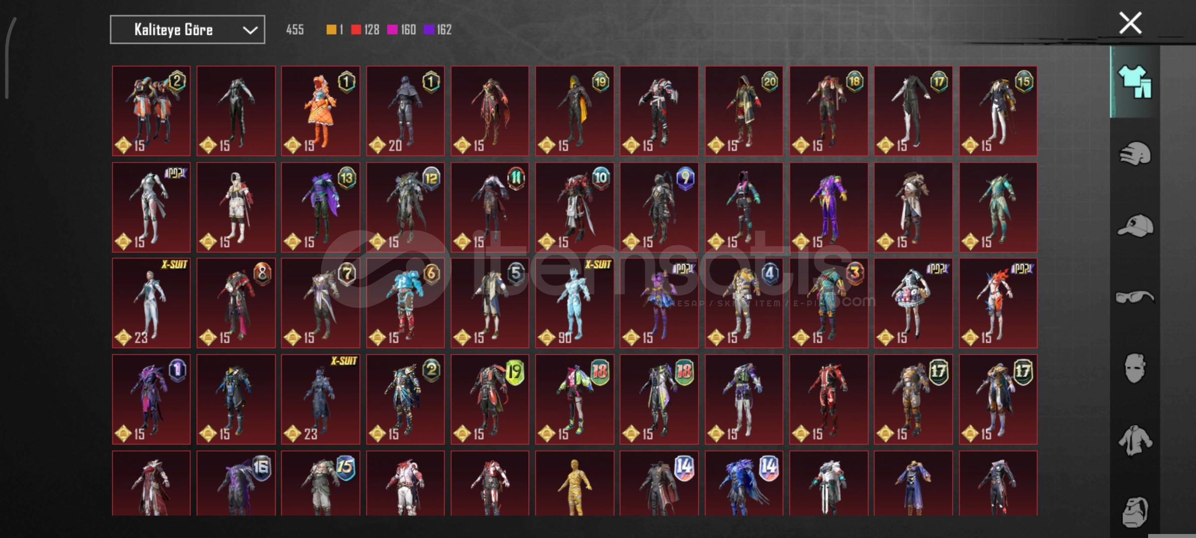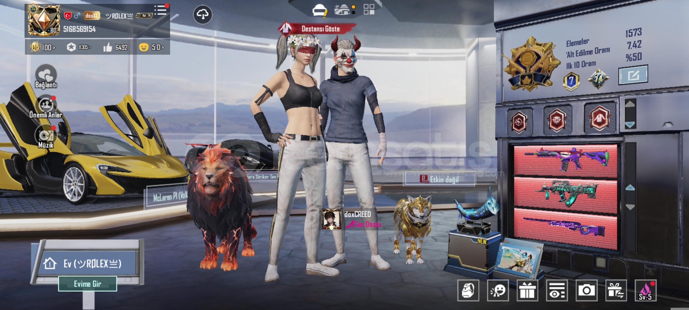 Çiğ zırh 4 seviye 6adet x suit var19adet ölüm duyurulu silah var 4tanesi 7seviye ,2tanesi 6seviyeMaskara M4 full mumya ve buz diyari m4de mevcut ama iki seviyeler 200+destansı ve çoğunluğu özel set4adet Dodge araç var yıl dönümü mirado var 1adette macleren var kombinlik kıyafetler dolu ful komutan mavi-siyah takım paltoların nerdeyse tamamı mevcut