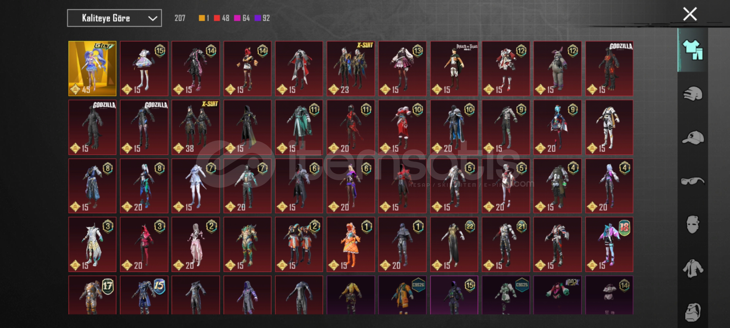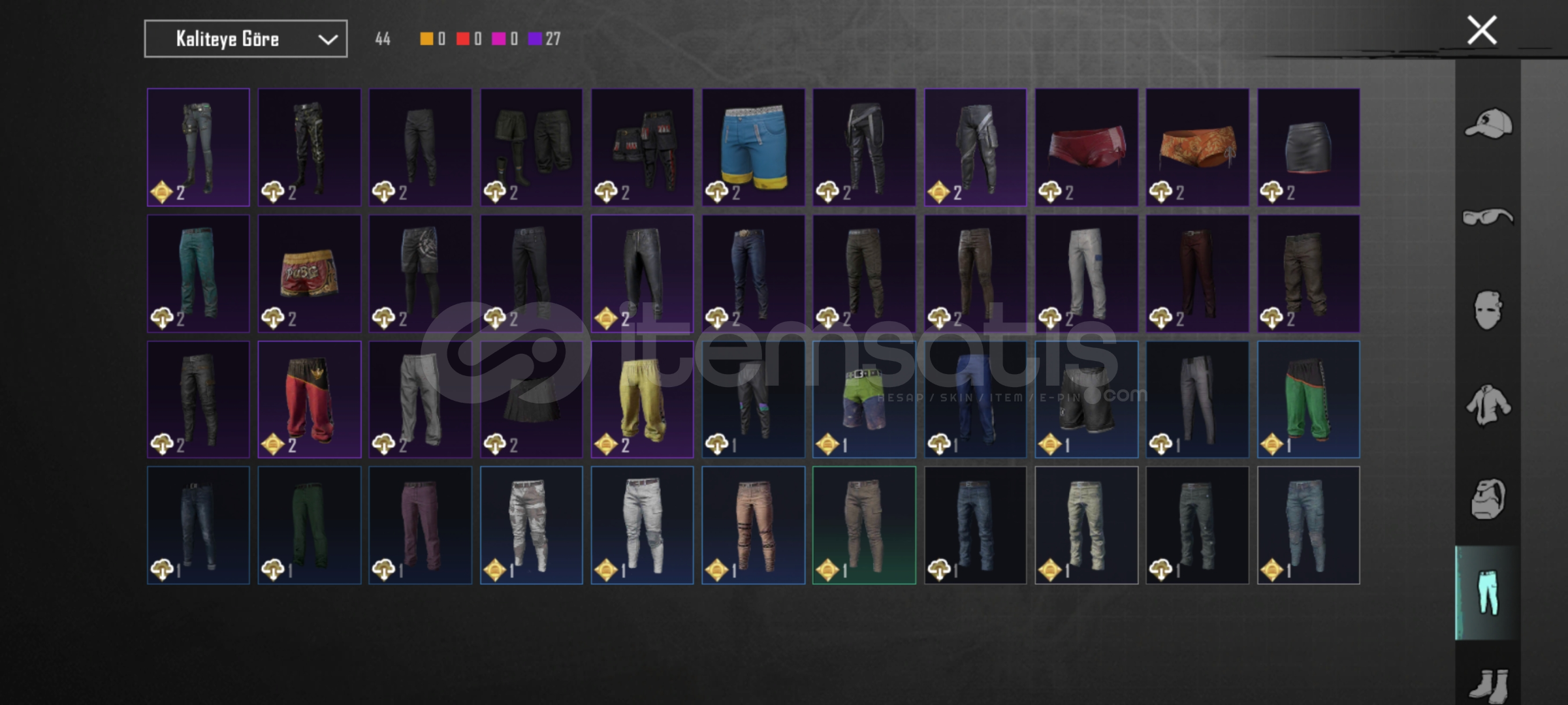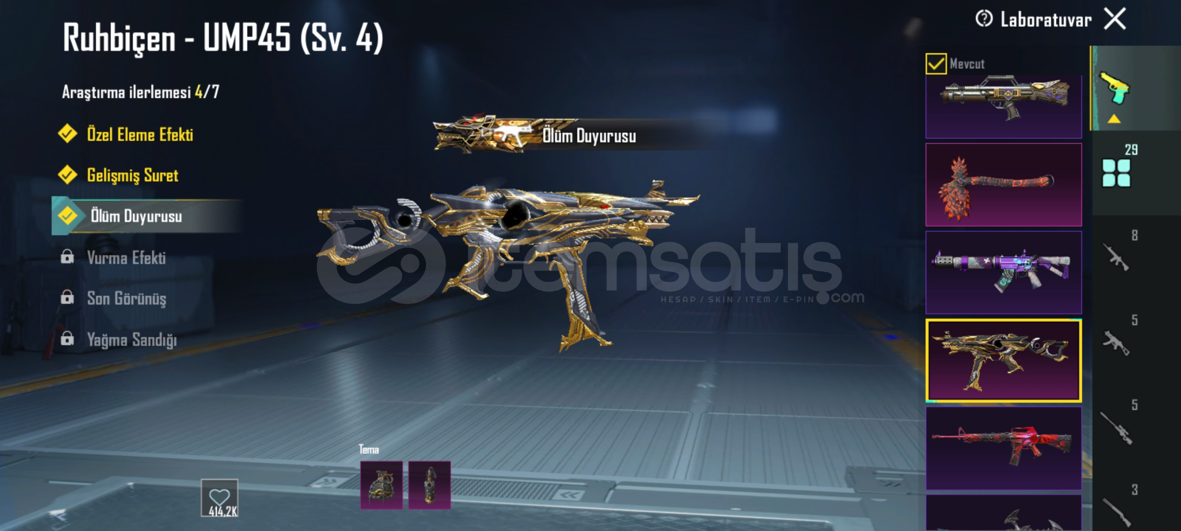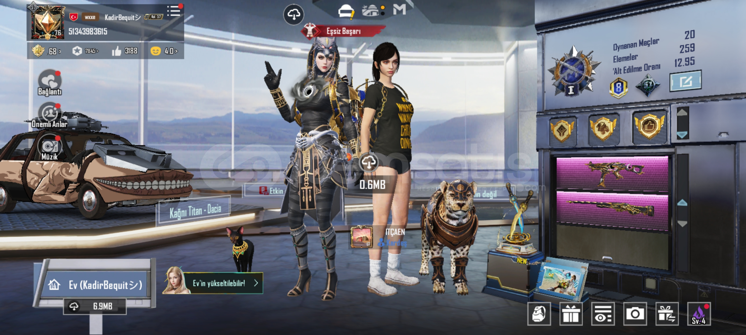 29 tane yukseltirilebilir silah var.ump,scarL,m762,mk14,s12K olum mesajlari acik awm 3 seviye. Bir tane iki tane ZirhX var biri 2 svy. 6 tane destansi amblem 130 premium sandik kponu var 726 tane ugurlu para var