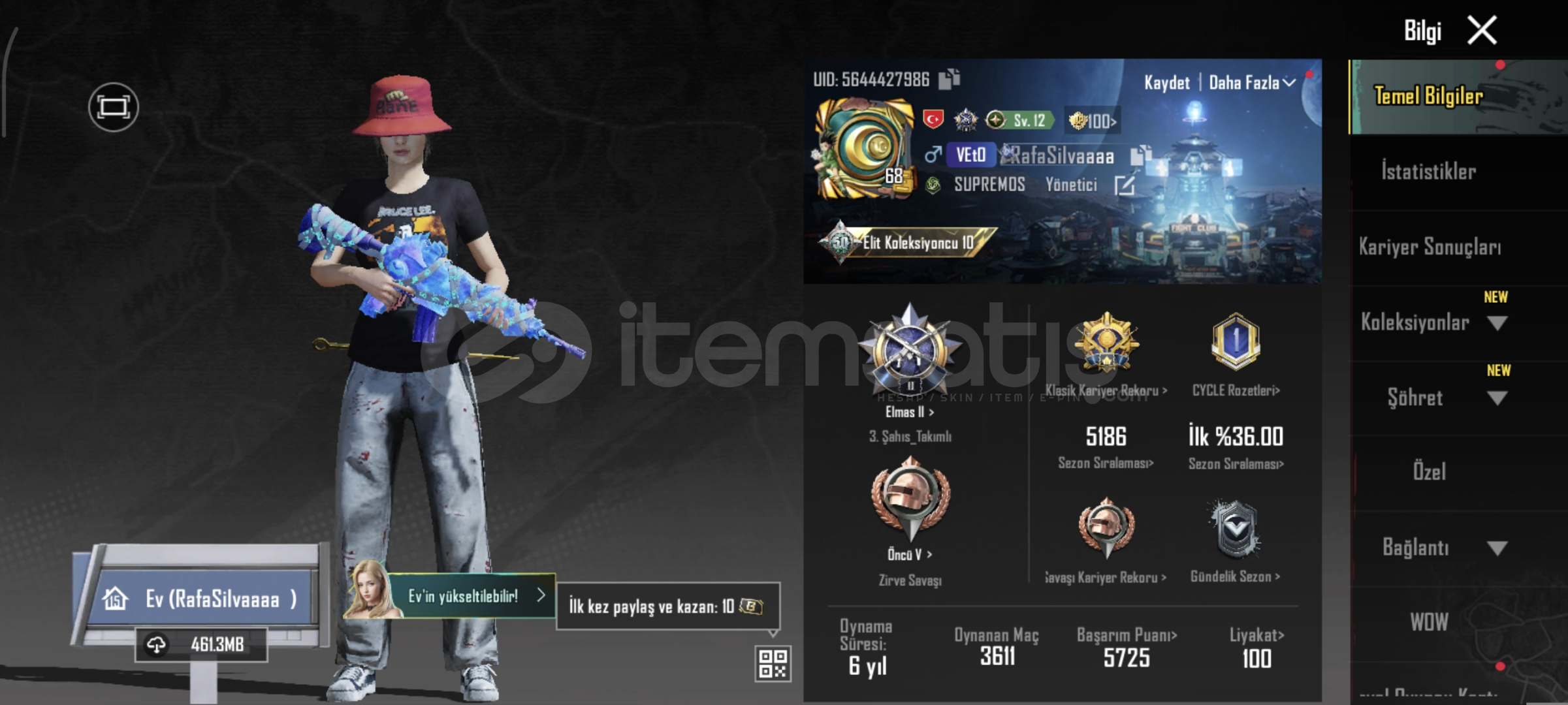 🌜~Hesap İçeriği~🌛 💬• Hesap 68 LVL 💬• 40 Adet Destansı Öge 💬• 11 Adet Yükseltilebilir Silah 💬• 12 Adet Royale Pass Açılmıştır 💬• Çok Nadir Yükseltilebilir Silahlar 💬• 12 Adet Araba Skini Vardir 💬• 15 Adet Unvan 💬• Amansız Suikastçı Seti.Kahramanı,T...