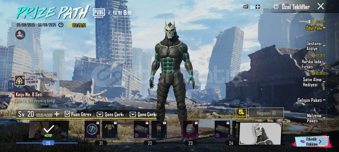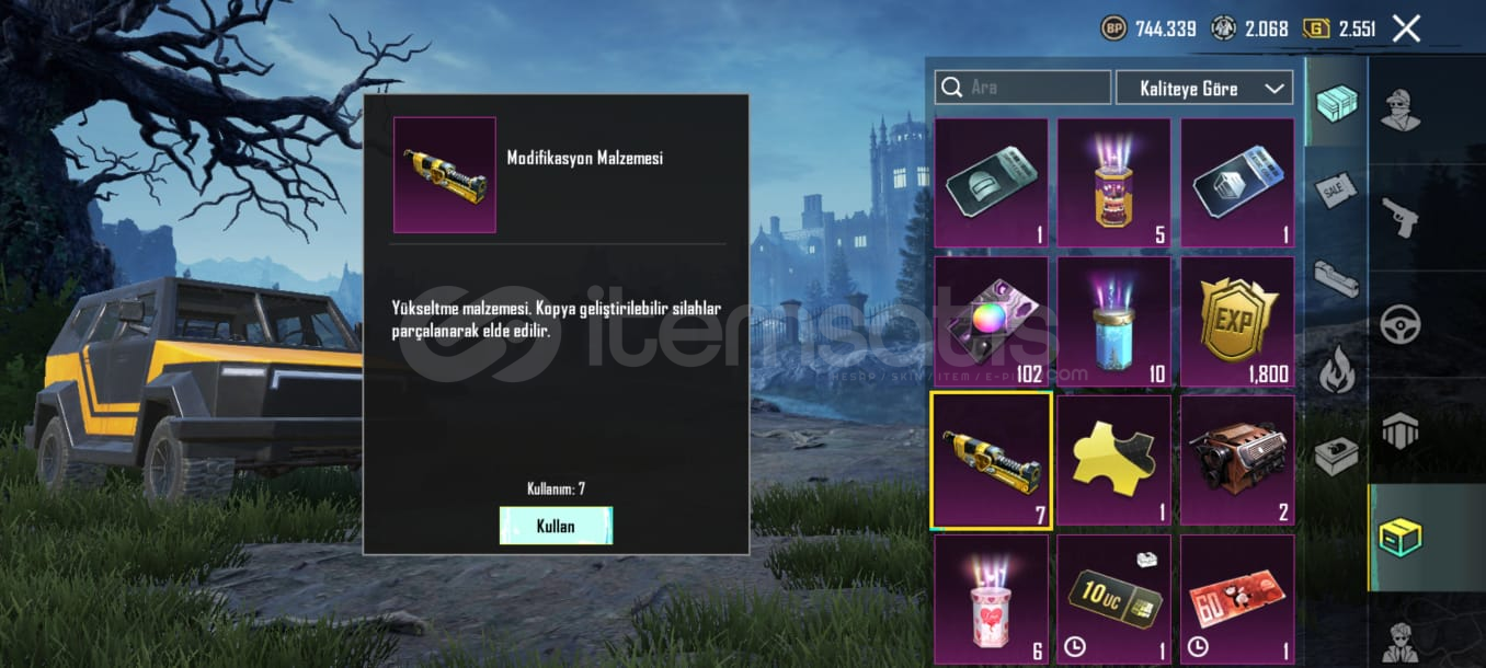 71 Destansı bomba hesapRoyal pas açıkHer araçta desen yükseltilebilir araçlarda varFiravun Çanta7 Tane materyalAltin Penge- P9O(Sv. 5)Dikenli Şafak m4a1 3 seviyeYamalı tavşan mk47 3 seviyeDenizlerin evrimi ump 45 3 seviyeZarif Leylak - Thompson (Sv. 3)Gece Gladyatörü - PP-19 Bizon (Sv. 3)Ruhani Muhafiz - UZI (Sv. 3)Anukhra Zirh-X (1 Yldizl)Yanardöner Zirh-X2 Yıldızlı