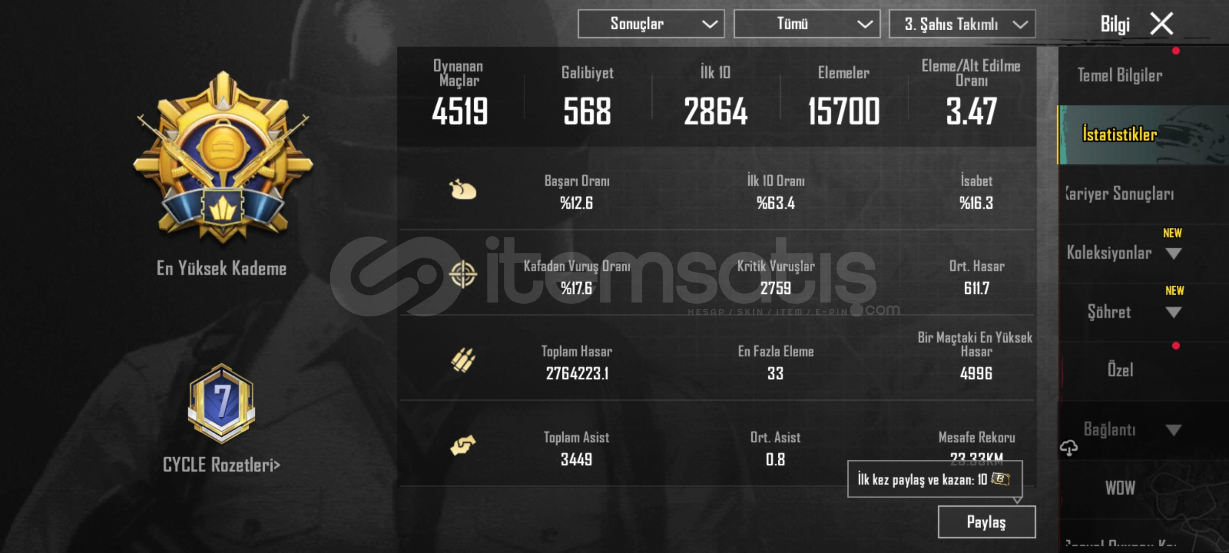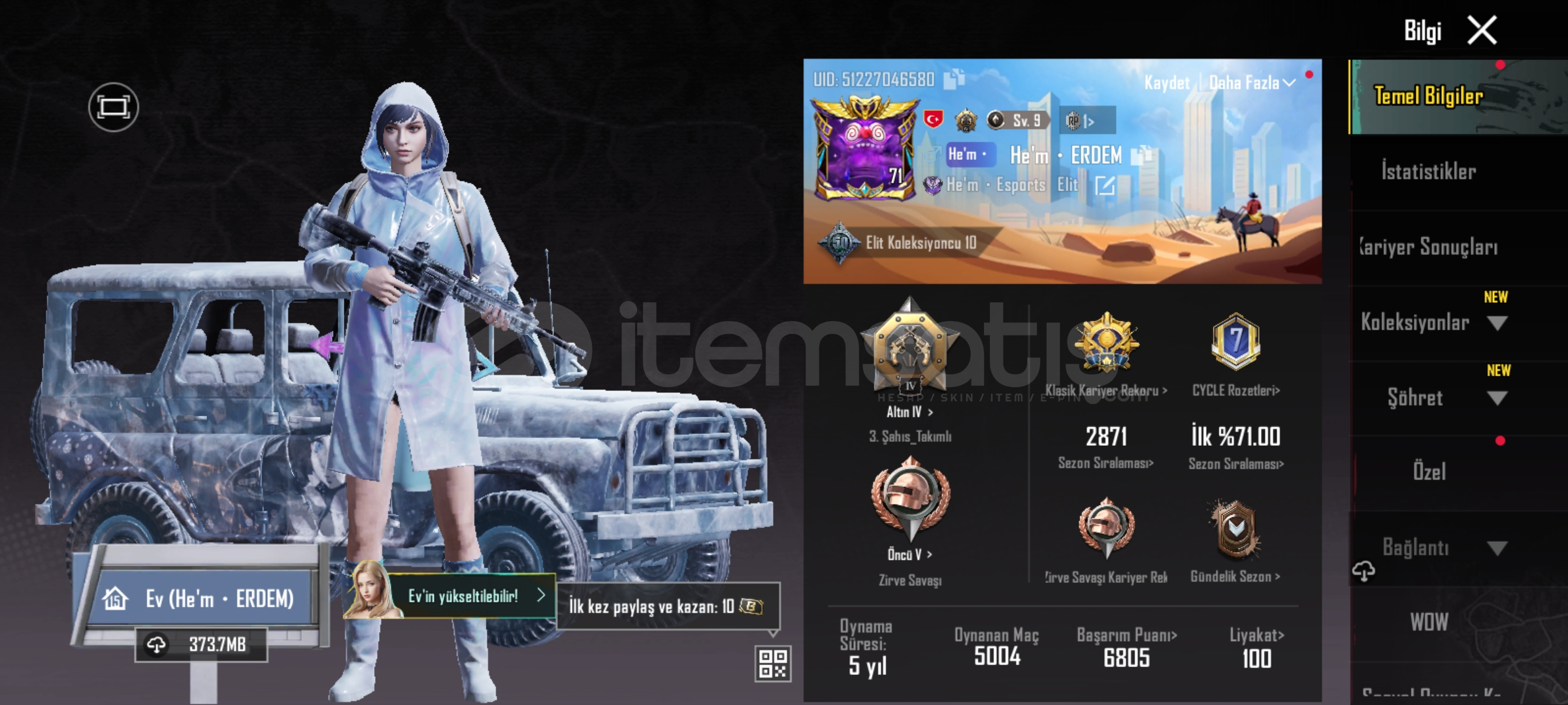 İD:51227046580 isteyen oyundan bakabilir.Gerekli fotoğrafları verdim geri kalanına oyundan ciddi alıcılar bakabilir.Hesapta sadece Google bağlantısı vardır.İsim değiştirme kartıda vardır.