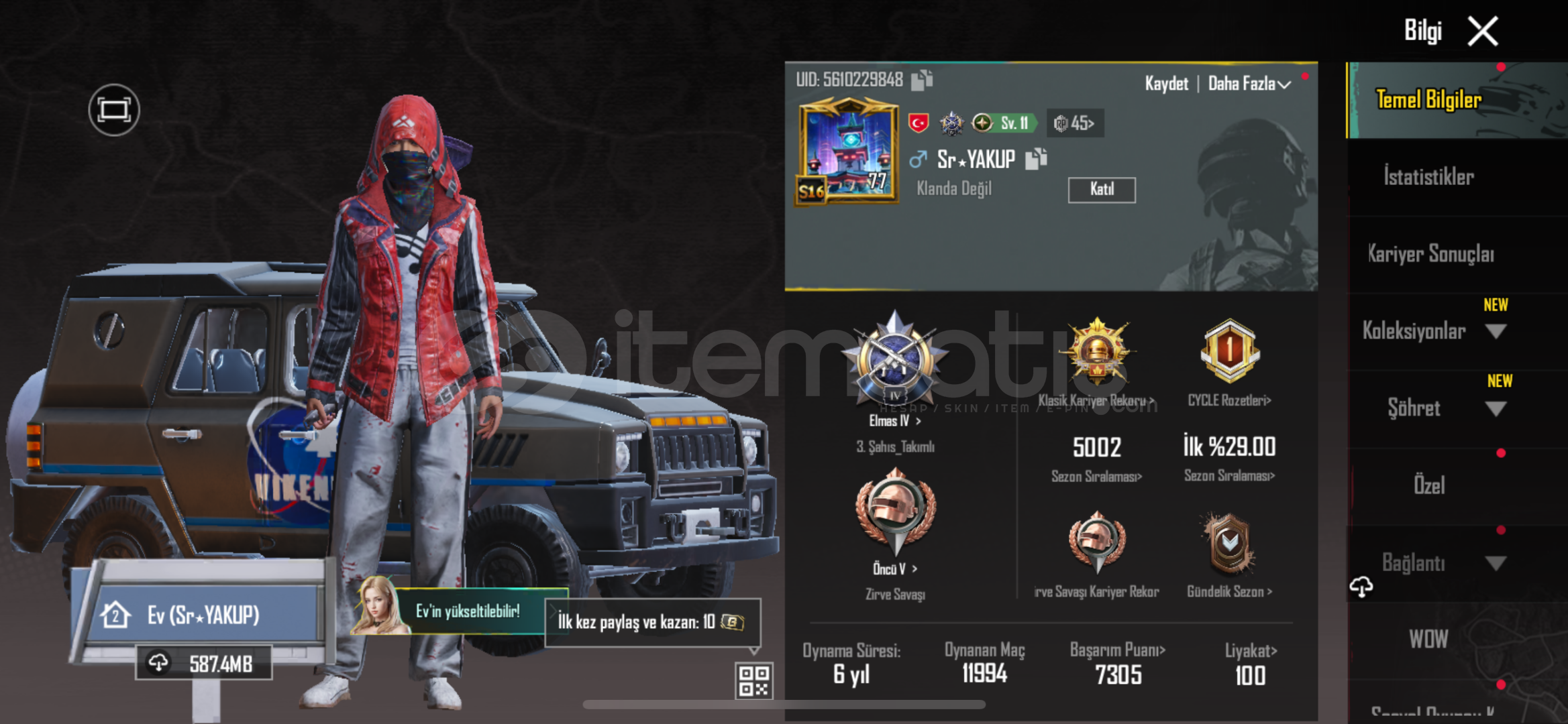 Hesap eski sezon hesabı 77lvl hesapta yükseltilebilir silah yok am içi dolu dolu kanka alırsan pişman olmazsın ID:5610229848 bakarsın ıd den daha detaylı ;)