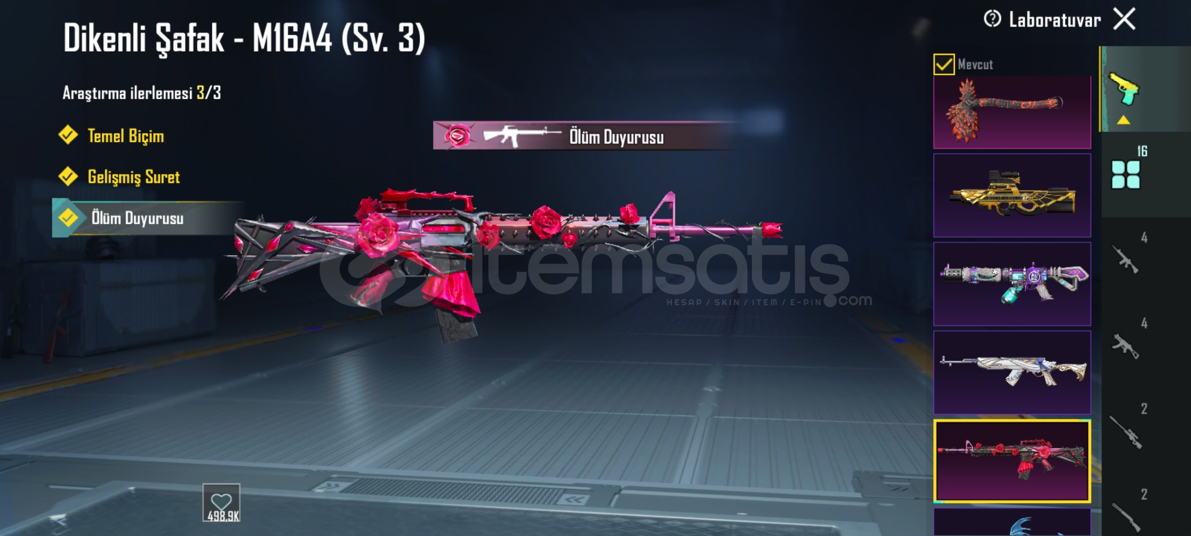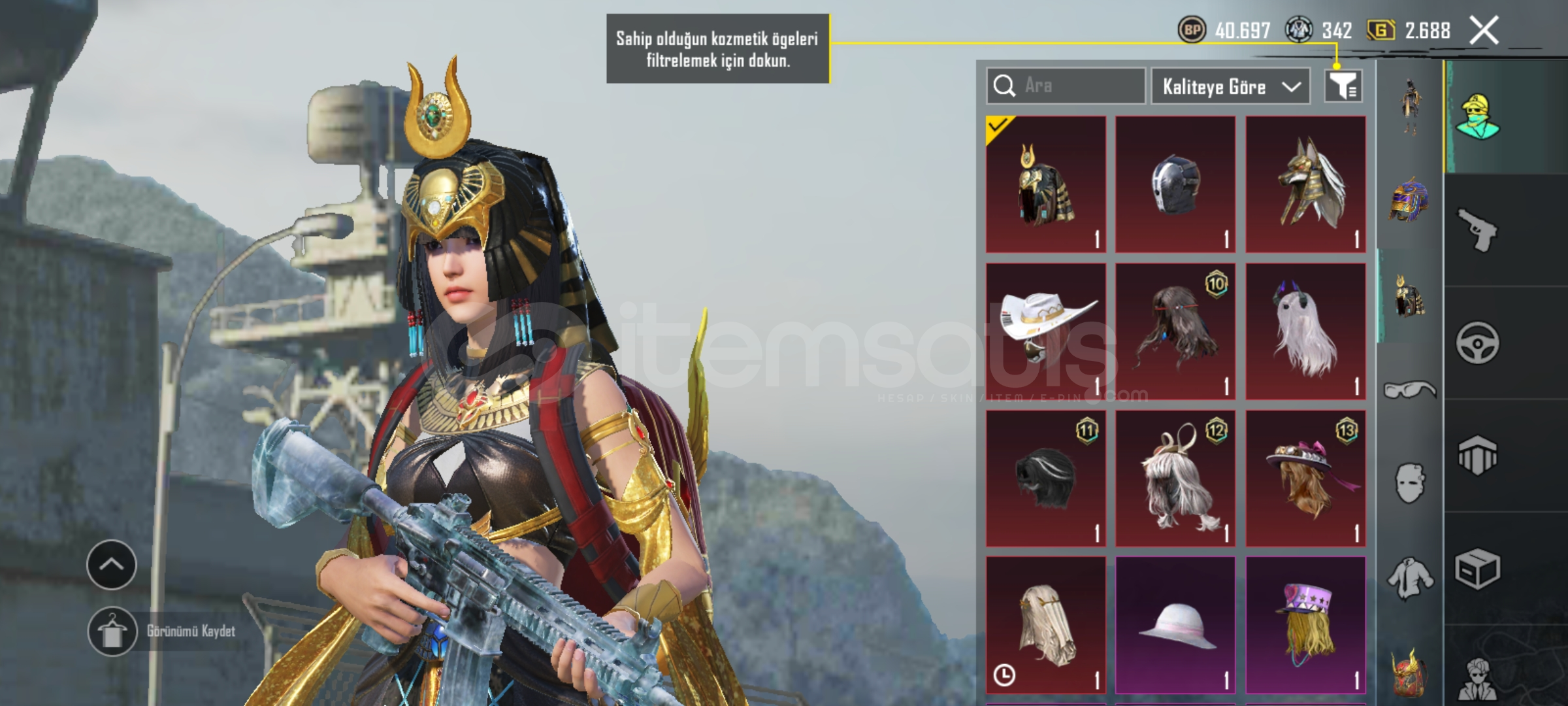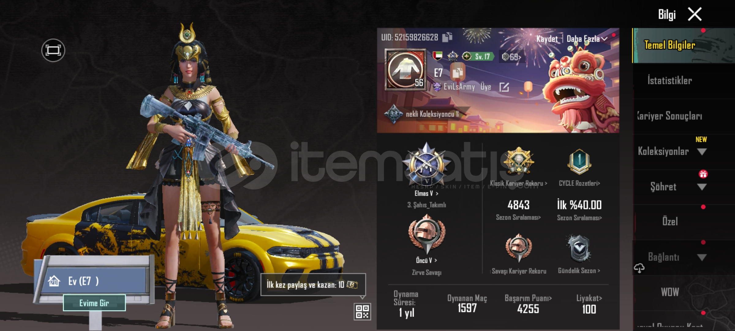 hesabın içindekiler şunlardır:buz diyarı m416 4 seviyespor arabaDalgıç seti1 destansı amblem ve 1 malzeme7 günlük oda kartı 4 kill mesajlı silah