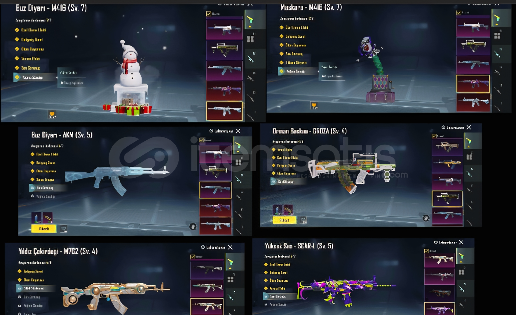 Genel olarak hesap çok dolu 51 tane yükseltilebir silah var genel olarak 158 destansı 8 nihayi hesapta ayriyeten 60 tane materyal ve 1500 tane araç jeton bulunmaktaBuz Diyarı - M416 (Sv. 7Maskara - M416 (Sv. 7)Buz Diyarı - AKM (Sv. 5)Orman Baskını - GROZA (Sv. 4)Yüksek Ses - SCAR-L (Sv. 5)Ölümcül Sarkıt - ACE32 (Sv. 5) Yıldız Çekirdeği - M762 (Sv. 4Altın Pençe - P90 (Sv. 5)Ruhbiçen - UMP...