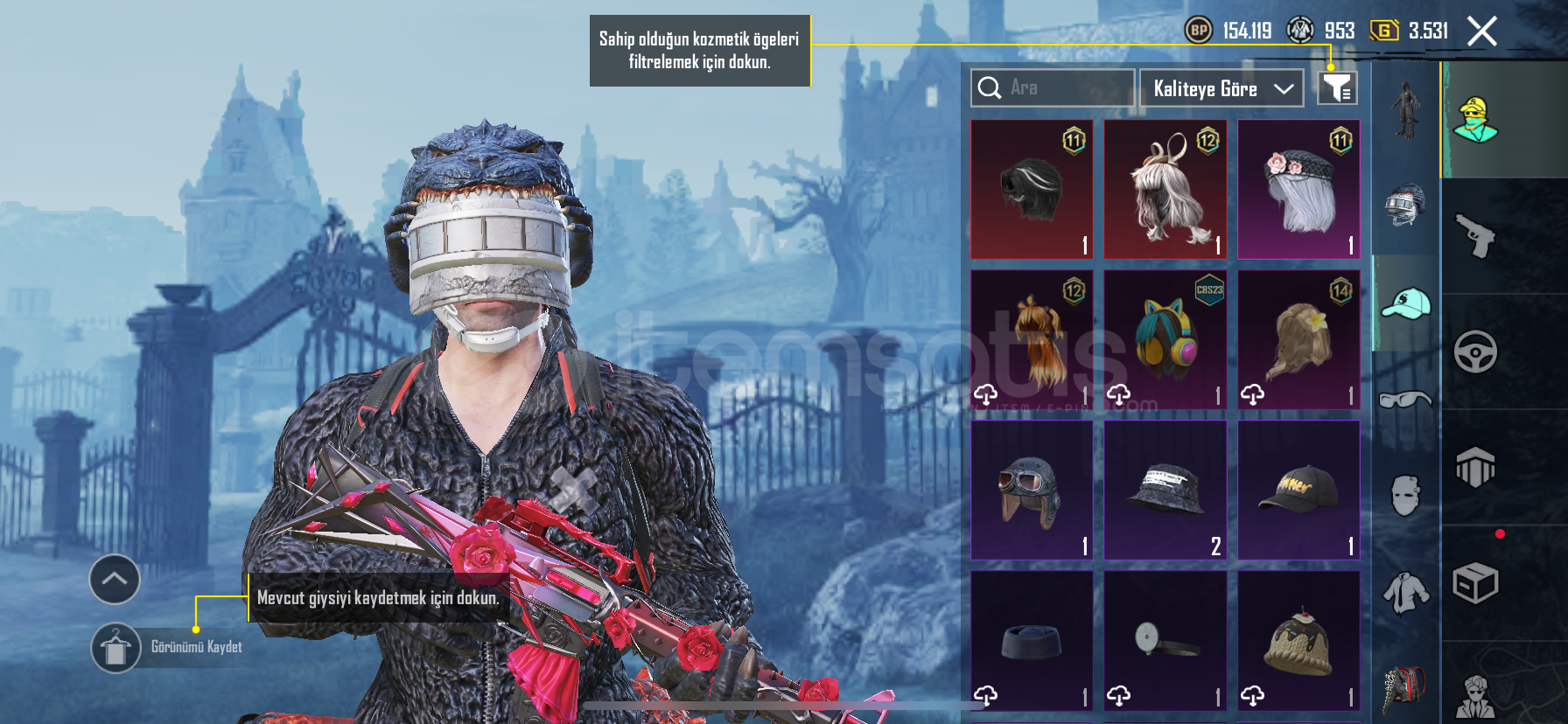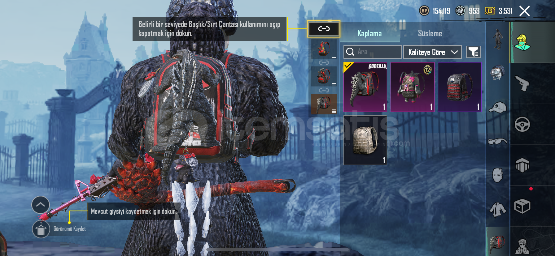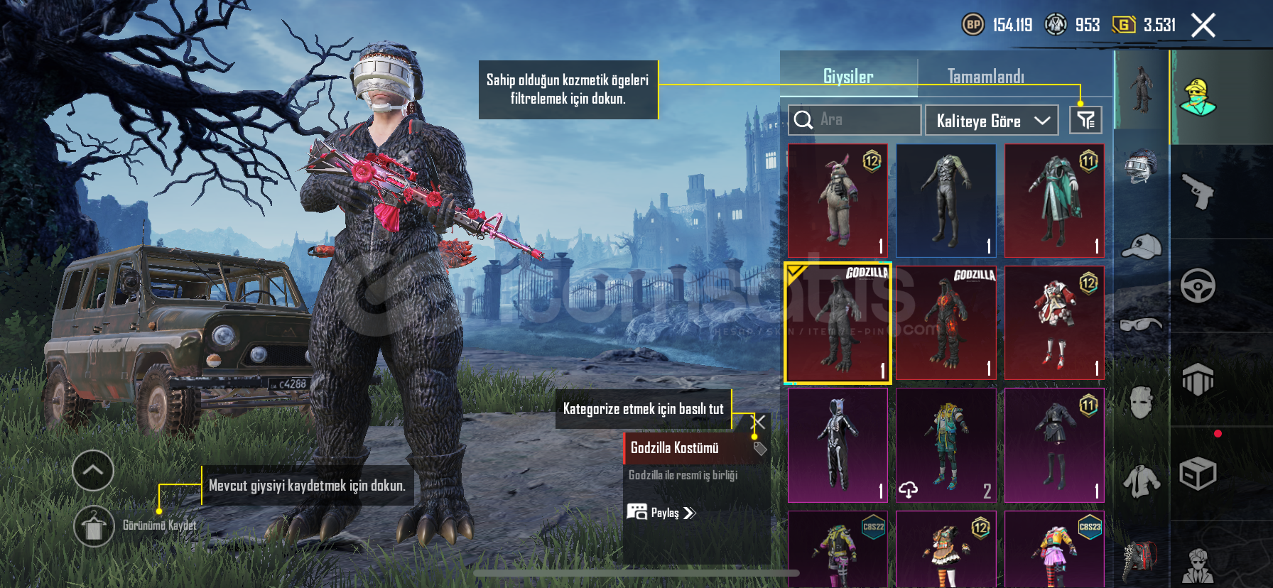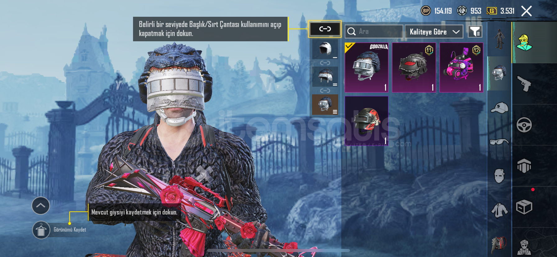 Hesapta Godzilla çantası Godzilla kaskı ve 2 adet Godzilla kostümü vardır motor minibüs ve silah skinleride vardır 500 tl alıcısına hayırlı olsun temiz hesap